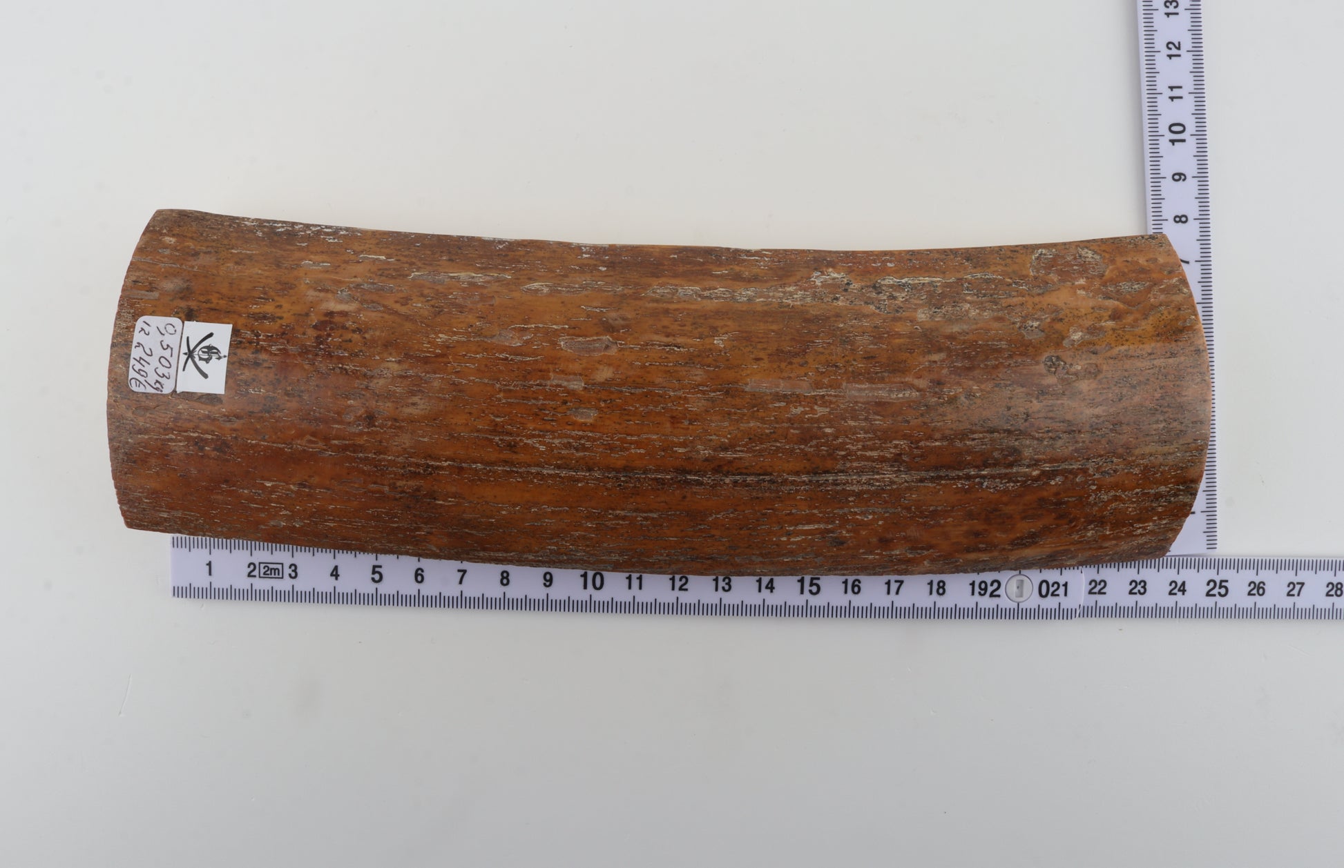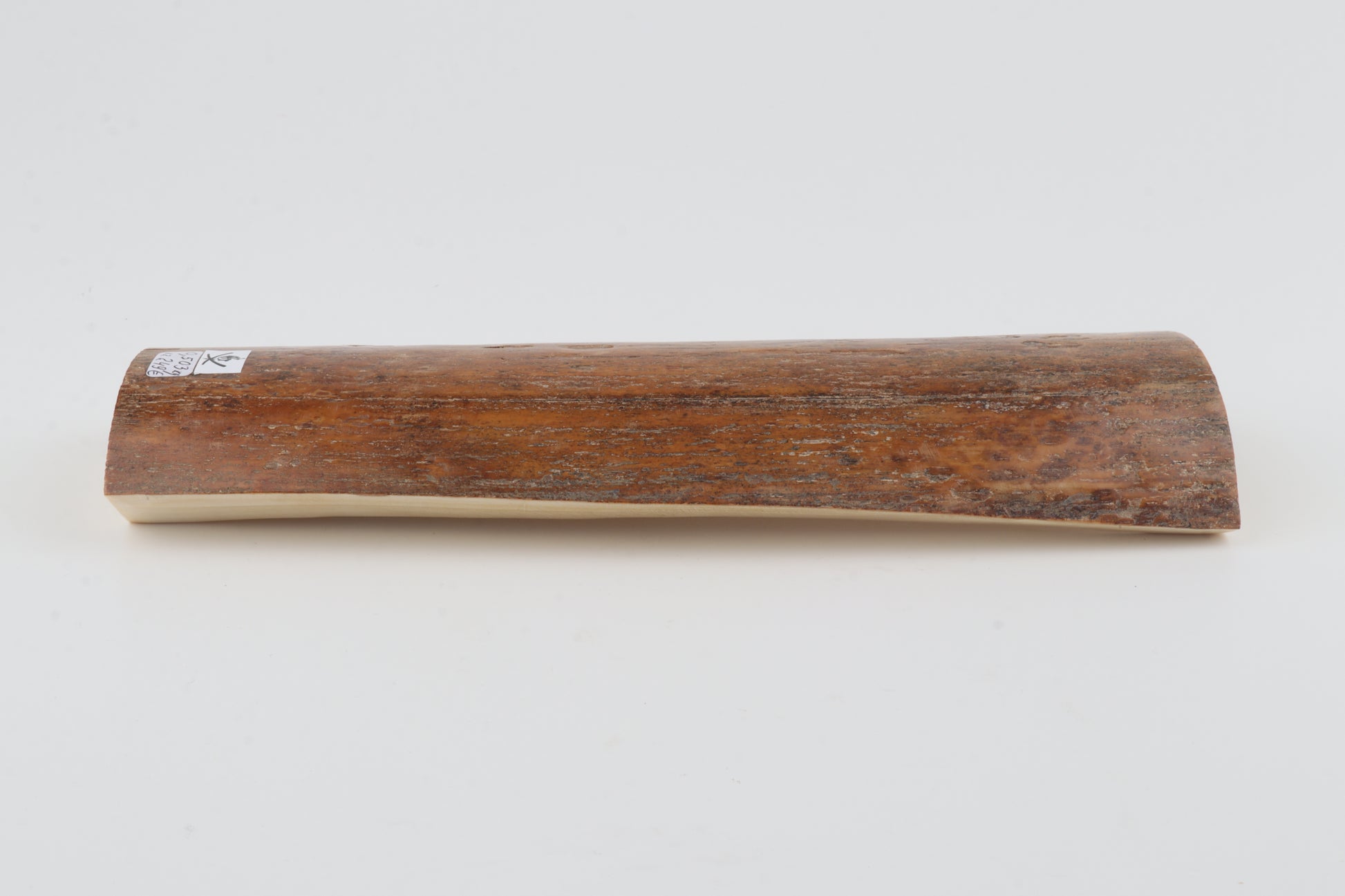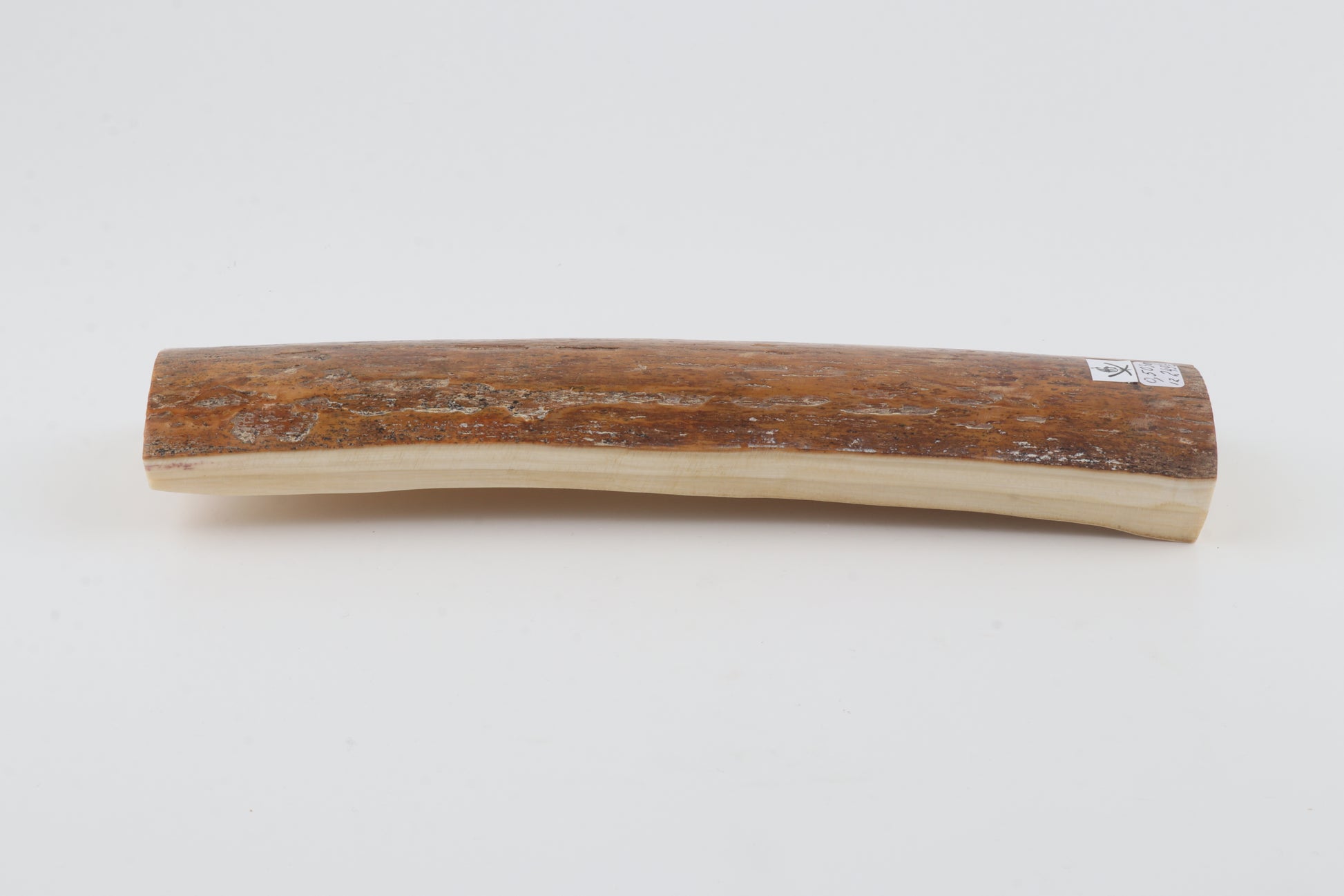 This is a premium-quality piece of Siberian woolly mammoth bark (Mammuthus primigenius). The ivory is naturally dense and solid, without cracks. Tapered width and thickness with plenty of reserves on both ends: One cross-cut section is thicker and narrower than the other. Please carefully look at the pictures for precise dimensions. The natural colour of the bark is caramel.