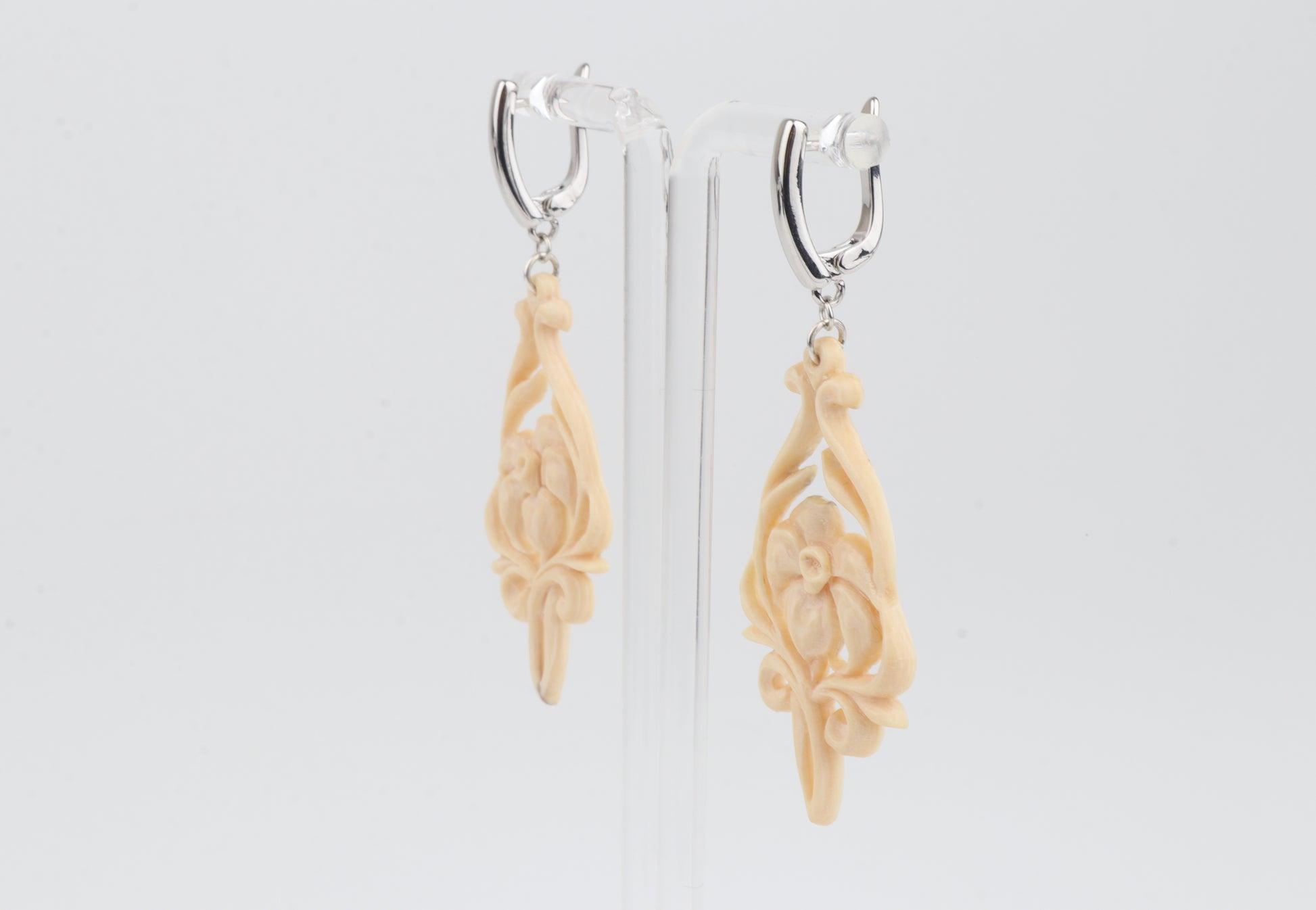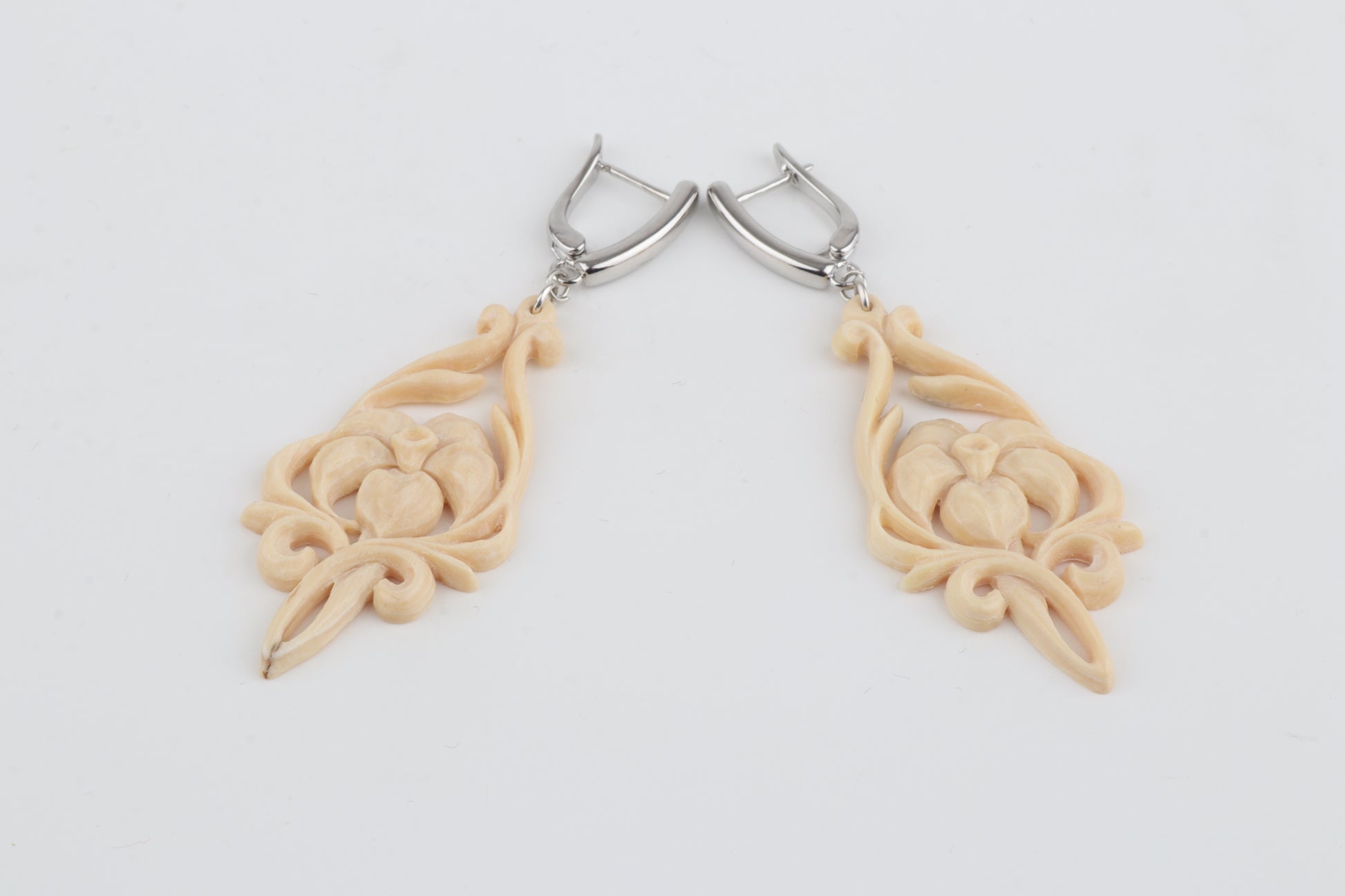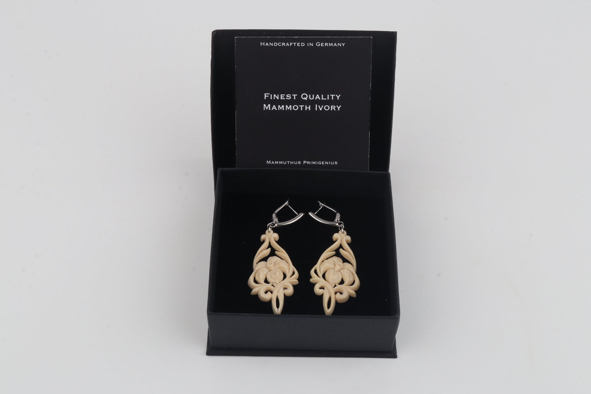These elegant drop earrings from genuine mammoth ivory (Mammuthus primigenius) are carved into an ornamental, symmetrical design inspired by classical floral and botanical motifs.