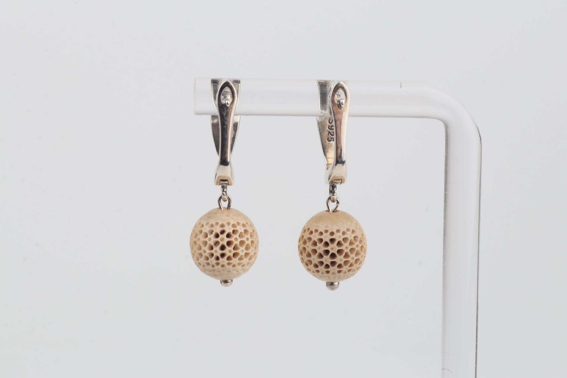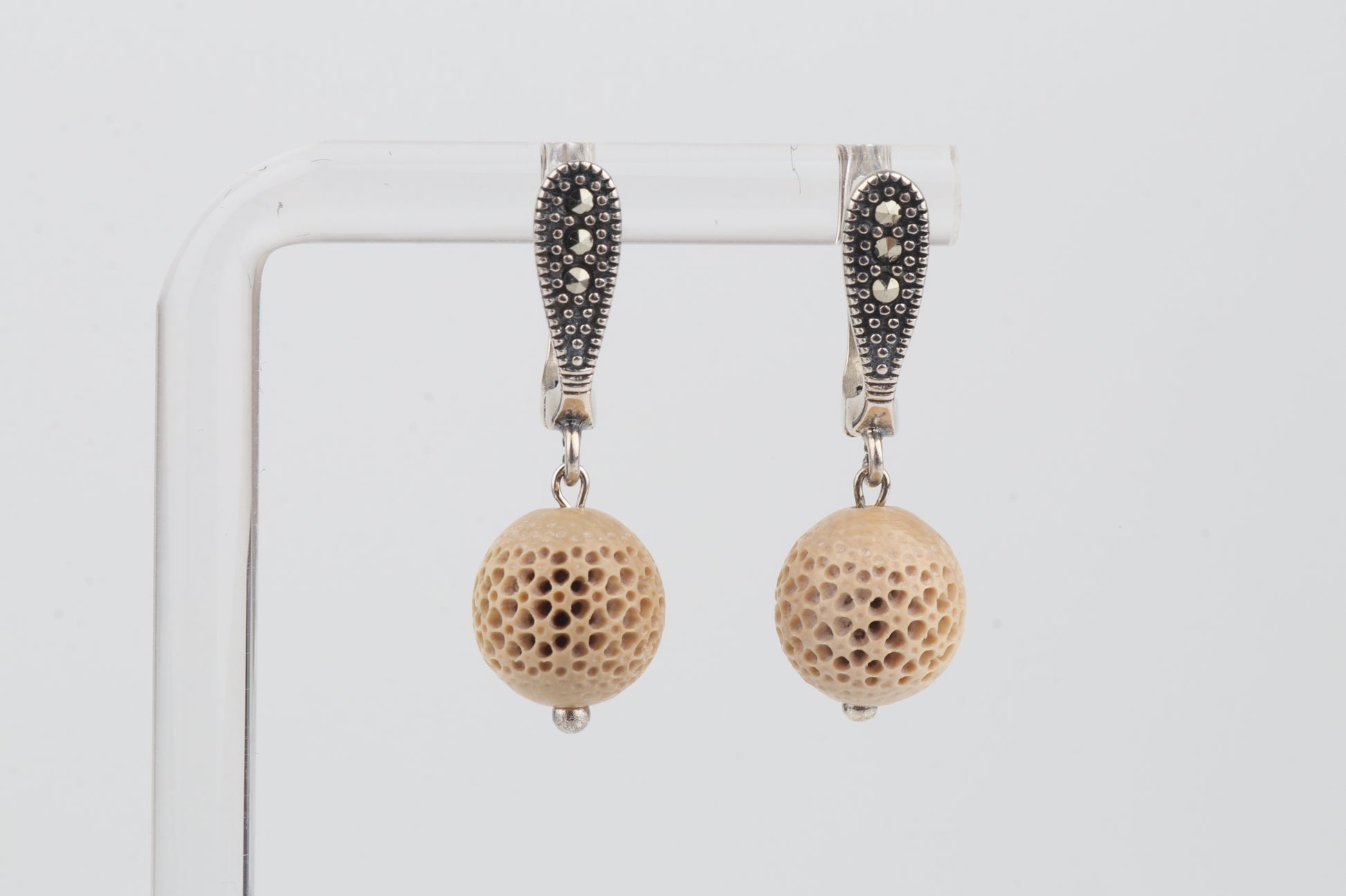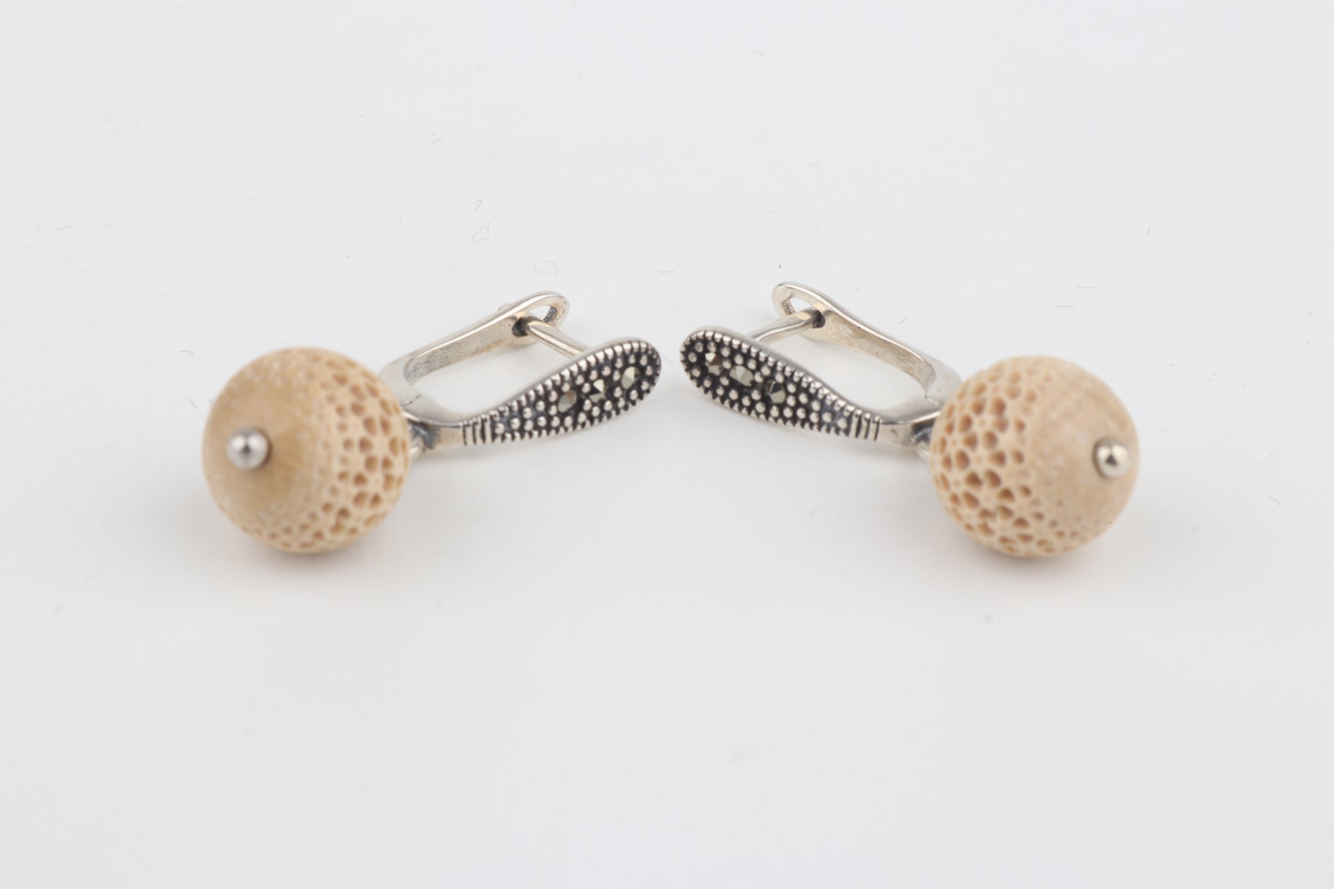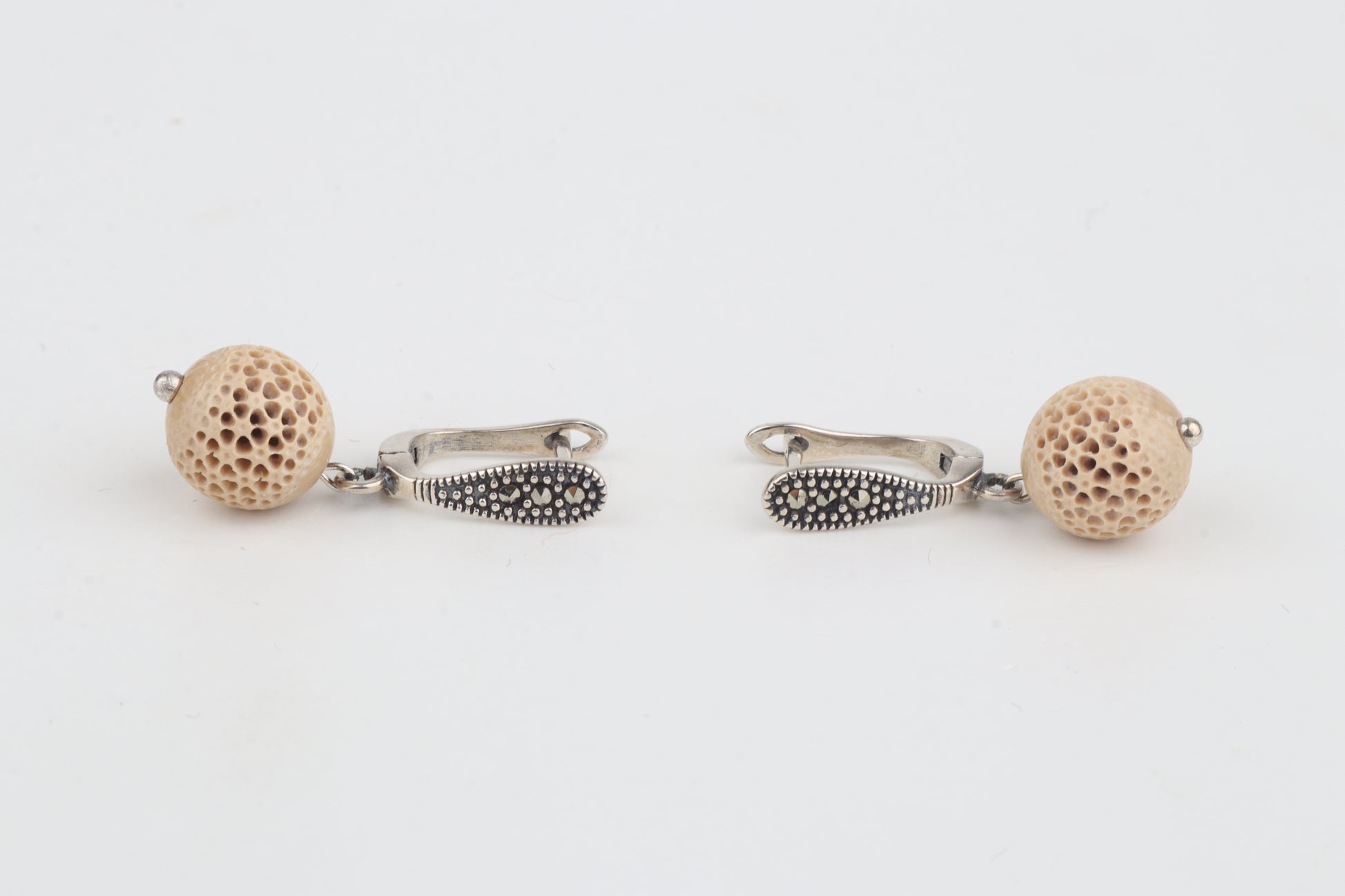 These refined drop earrings feature carved spherical elements crafted from mammoth ivory (Mammuthus primigenius). Their delicately carved surface pattern highlights the material’s natural creamy-beige tones.