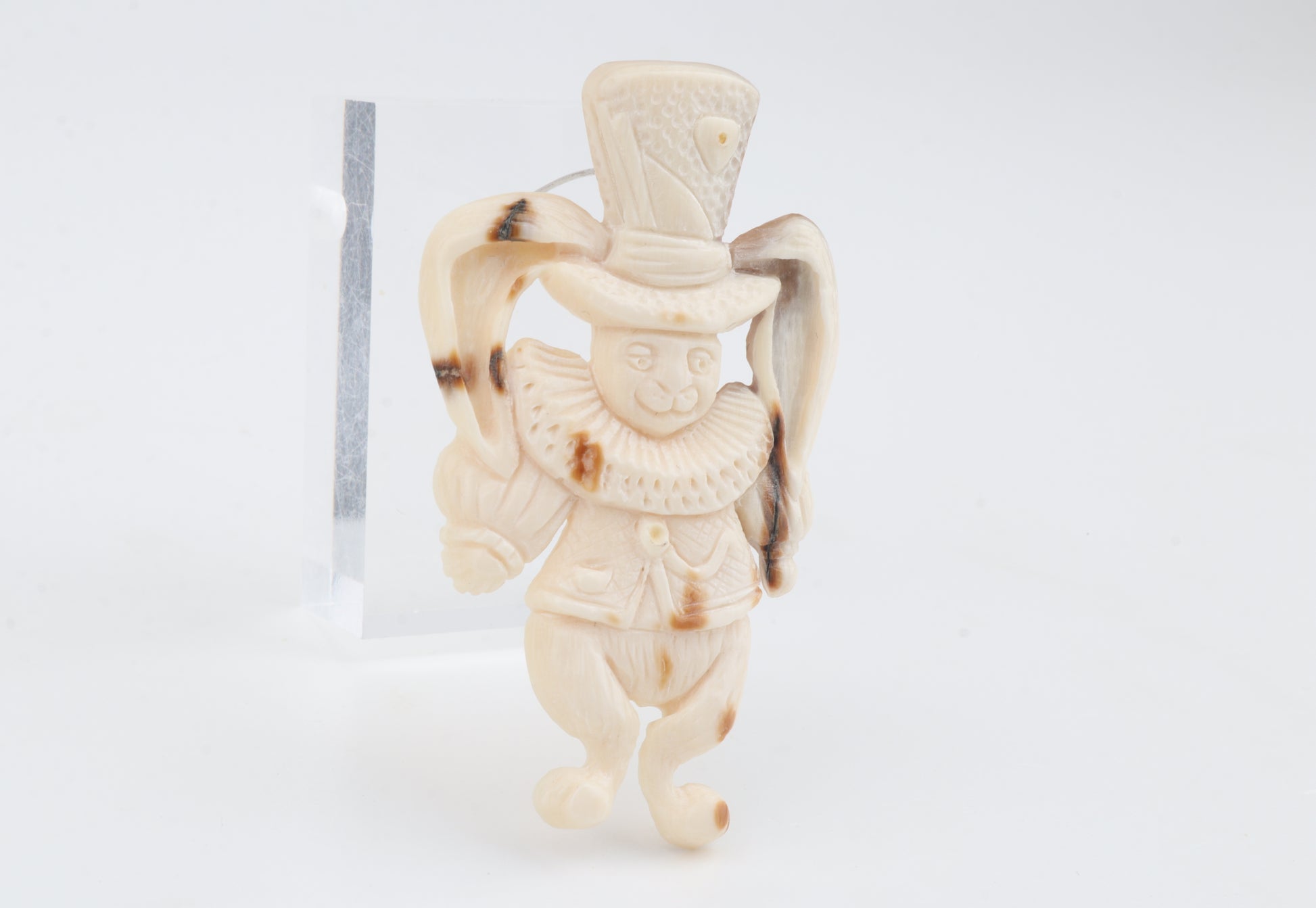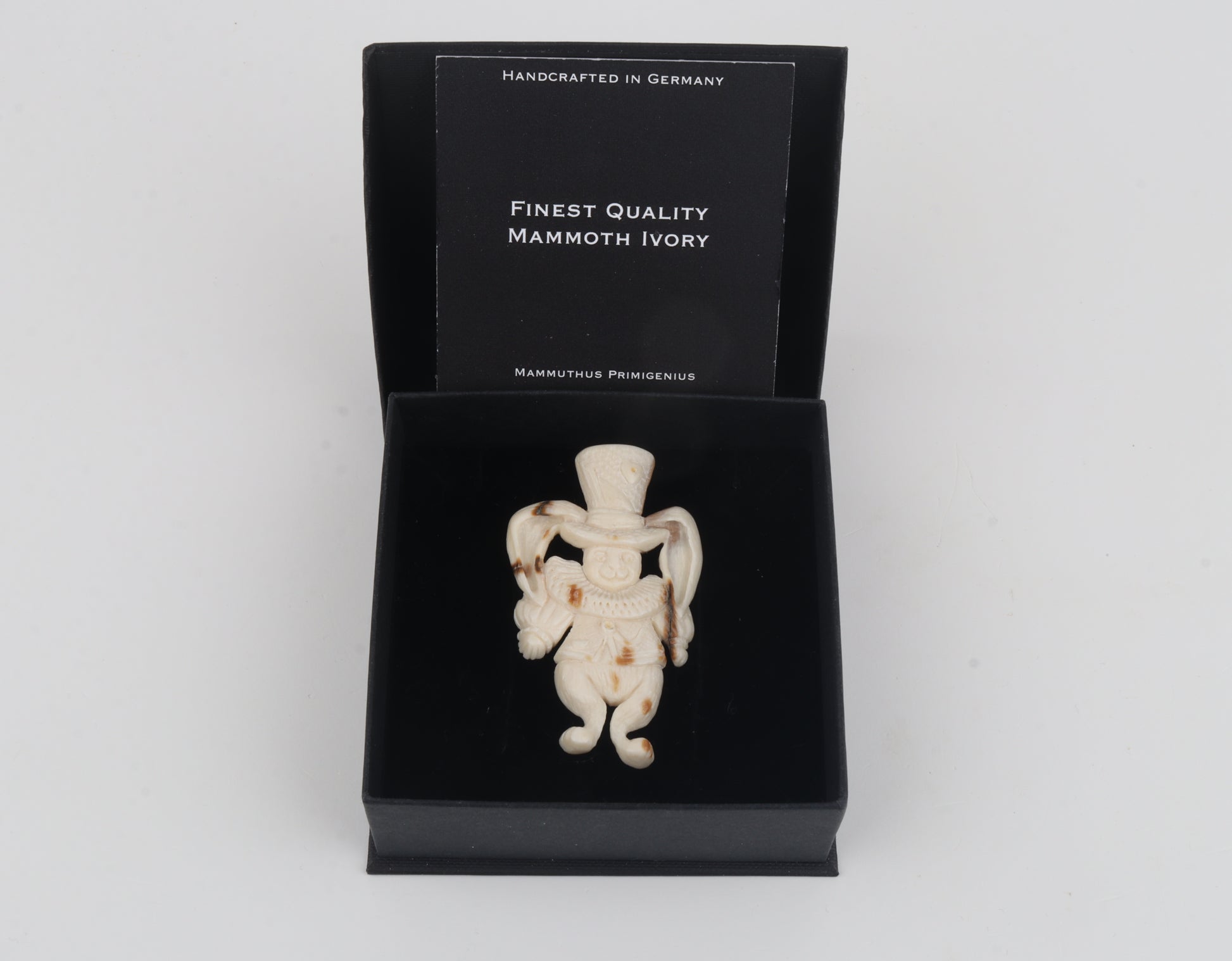 This unique brooch features a finely hand-carved harlequin figure crafted from genuine mammoth ivory (Mammuthus primigenius). The playful character is depicted in detailed costume, complete with expressive facial features, articulated limbs, and a traditional jester’s hat.