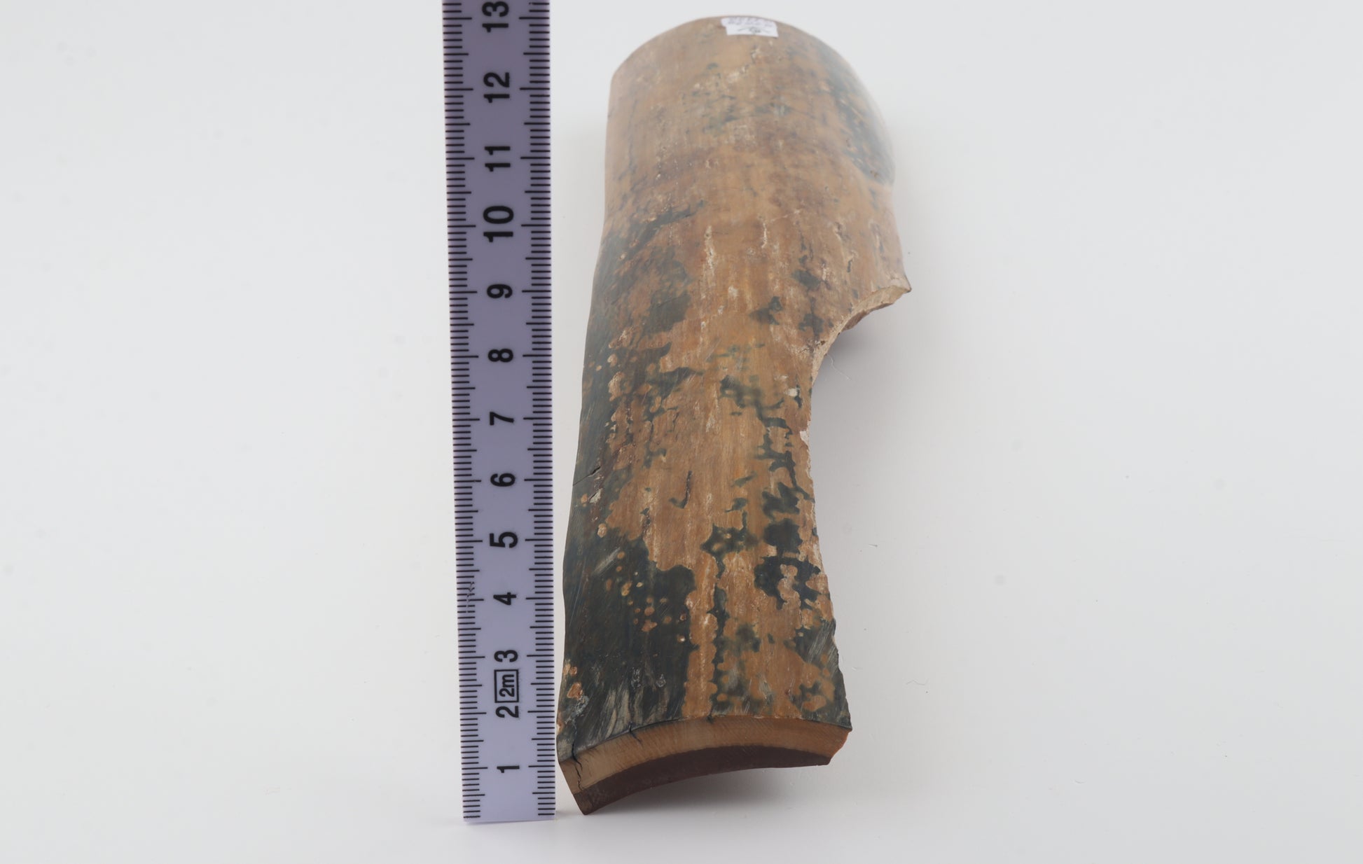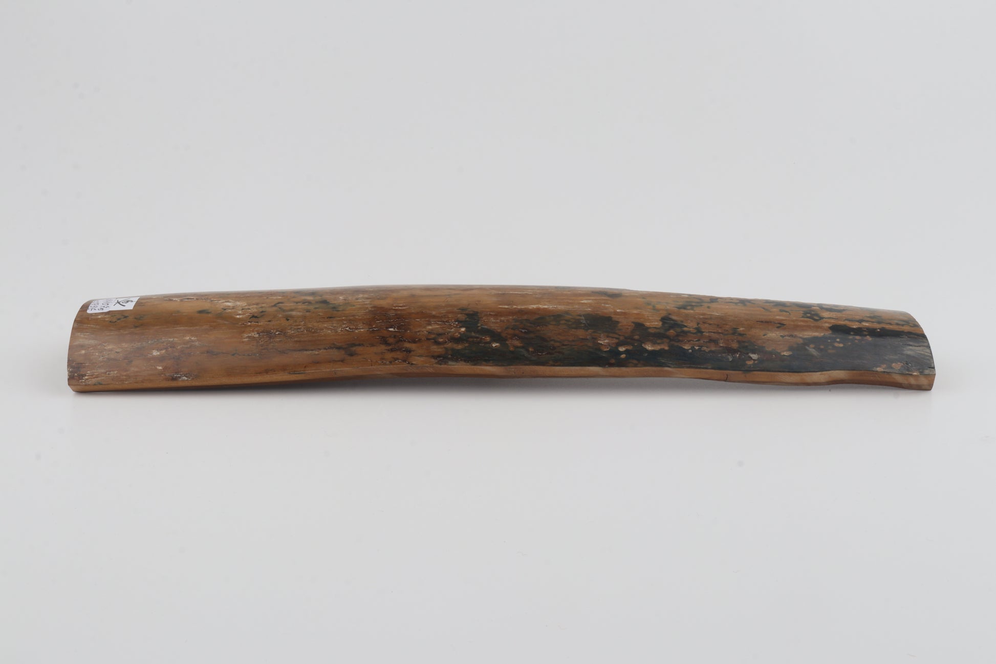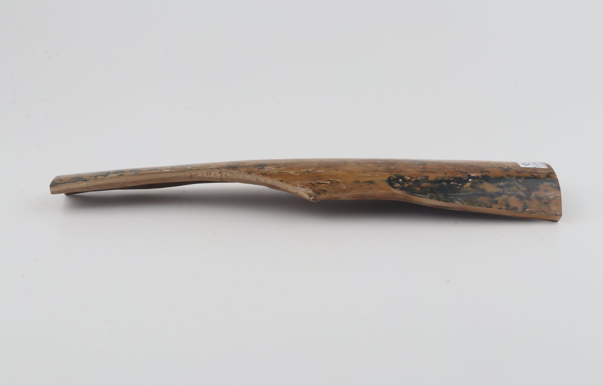 This is a premium-quality piece of Siberian woolly mammoth bark (Mammuthus primigenius). The ivory is naturally dense and solid, despite one tiny, non-penetrating fissure on the edge of one cross-cut section. Tapered width and thickness with reserves on both ends: One cross-cut section is thinner and wider than the other. One side was cut at an angle - please carefully look at the pictures for precise dimensions. The natural colour of the bark is a mix of mustard and blue.