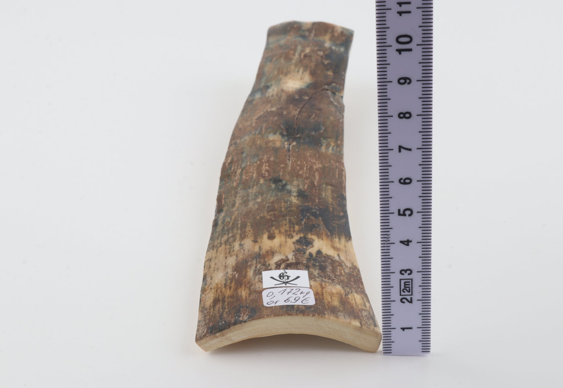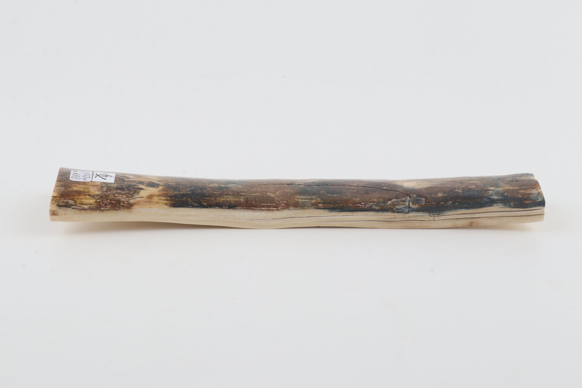 This is a premium-quality piece of Siberian woolly mammoth bark (Mammuthus primigenius). The ivory is naturally dense and solid, despite some cracks. Tapered width and thickness with reserves on both ends: One cross-cut section is thinner and wider than the other. The natural colour of the bark is a mix of beige, brown, green and blue.