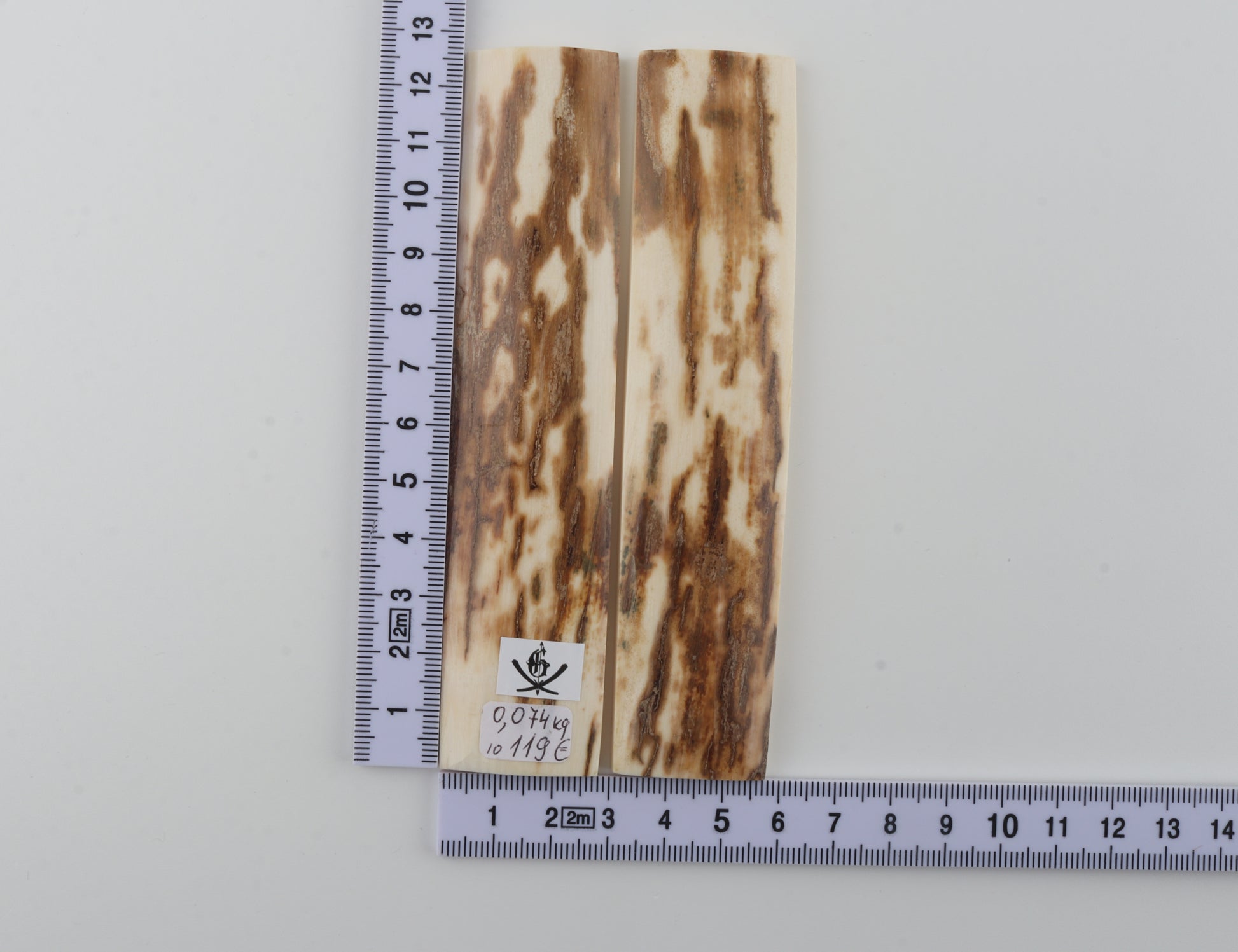 This is a pre-cut pair of natural woolly mammoth bark scales (Mammuthus primigenius) in immaculate condition. They feature consistent width and thickness with reserves on both ends. The undersides are almost flat. The bark displays a mix of brown, ivory and orange tones.