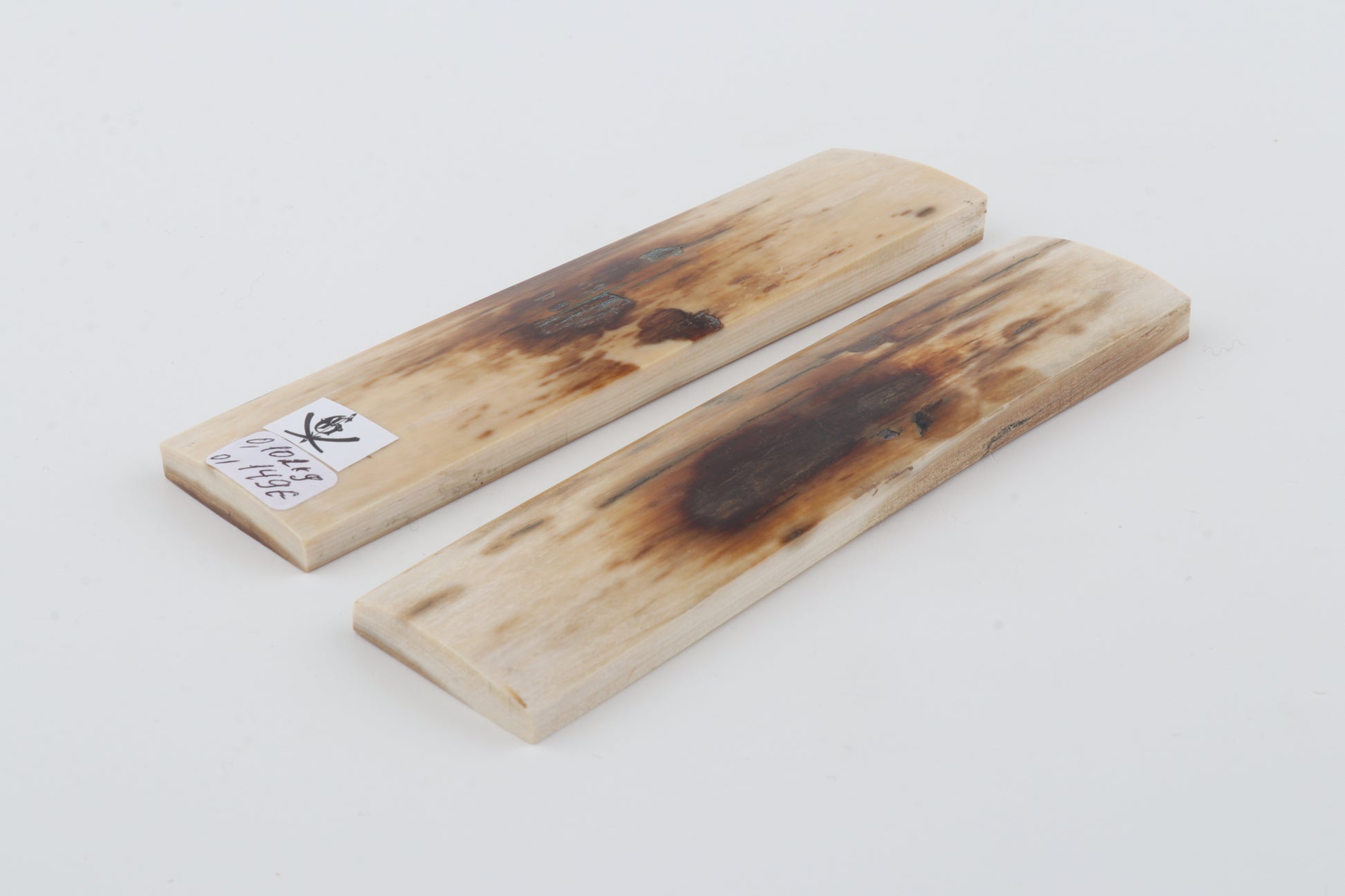 This is a pre-cut pair of natural woolly mammoth bark scales (Mammuthus primigenius) in very good condition. They feature consistent width and thickness with reserves on both ends. There is one small, non-penetrating crack on one slab. The undersides are flat. The colour of the bark is a mix of white and orange.