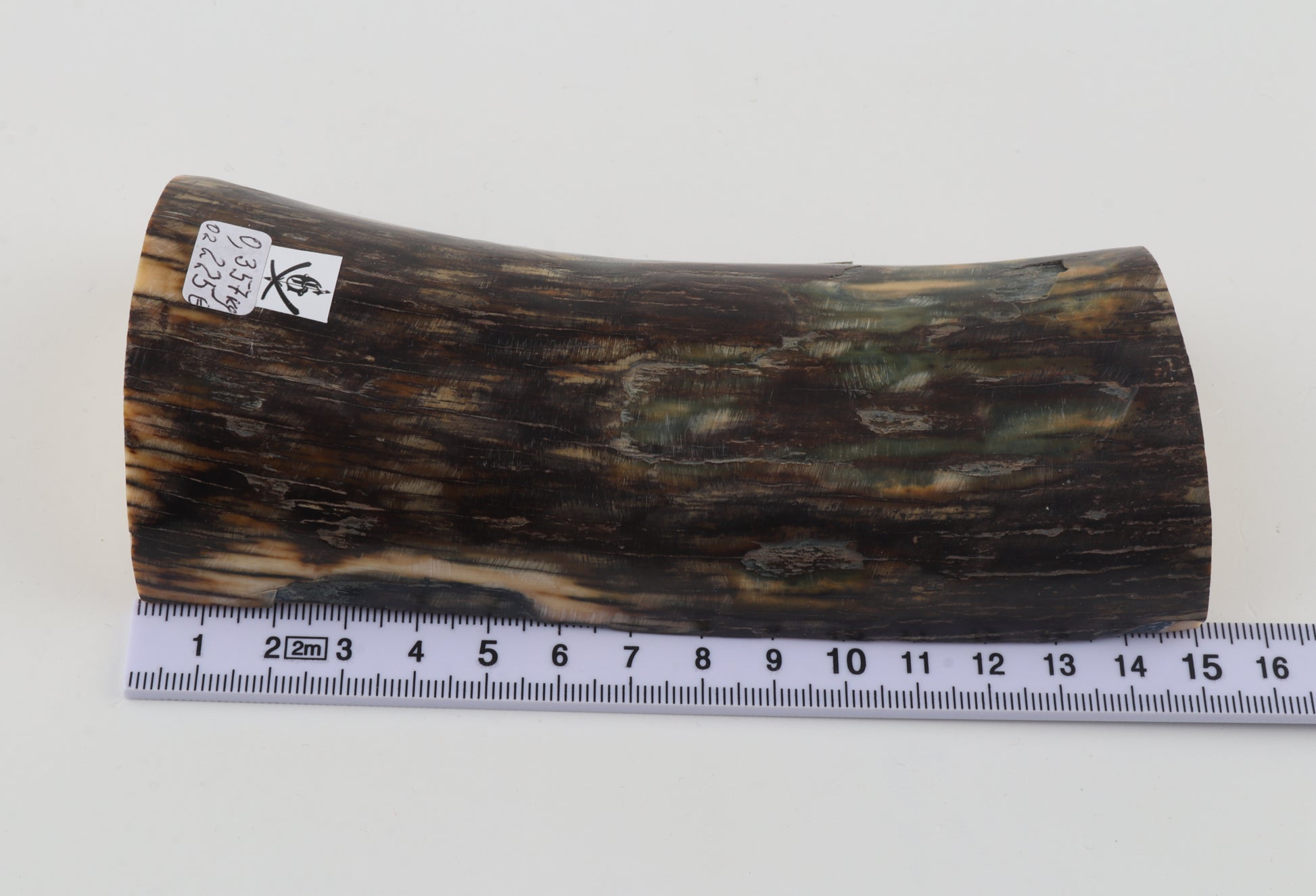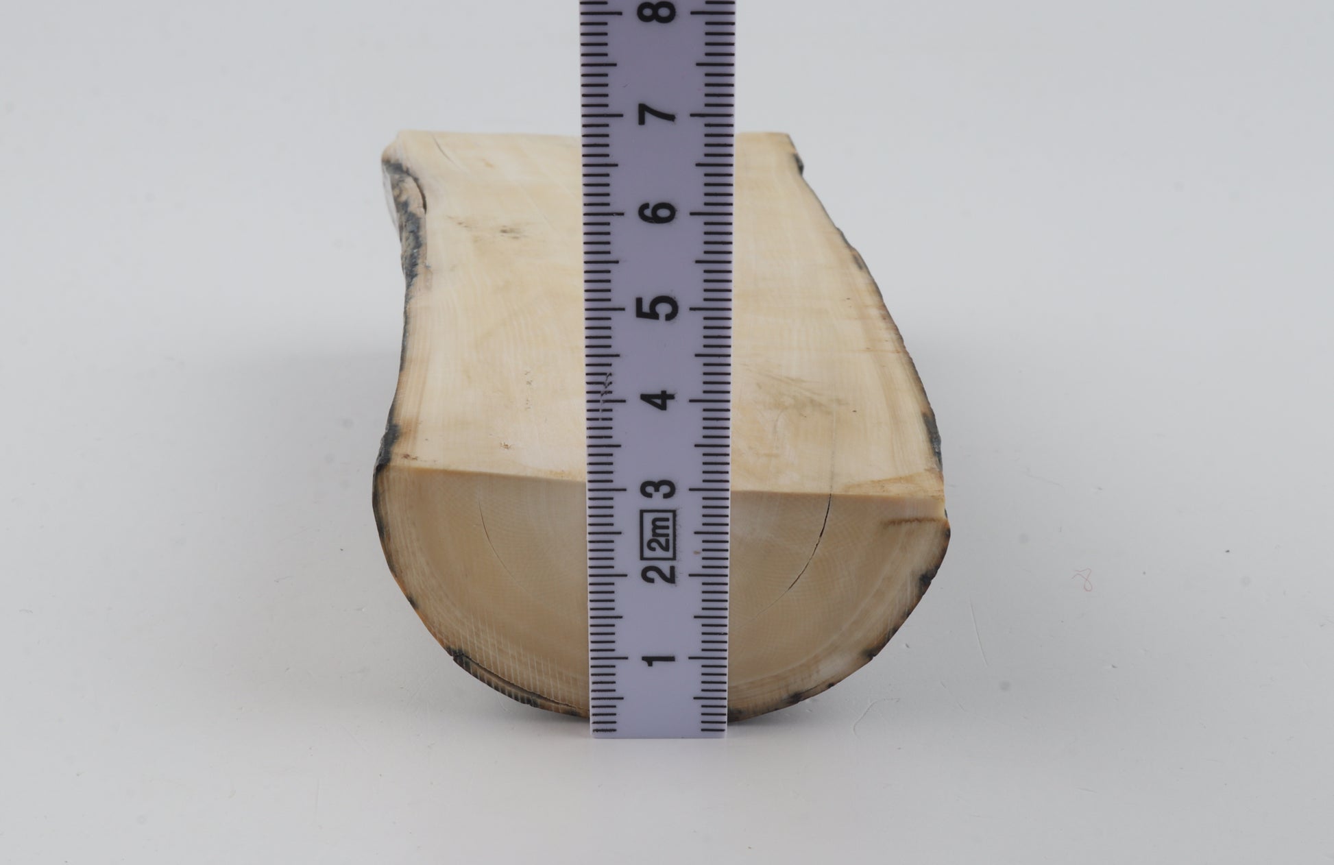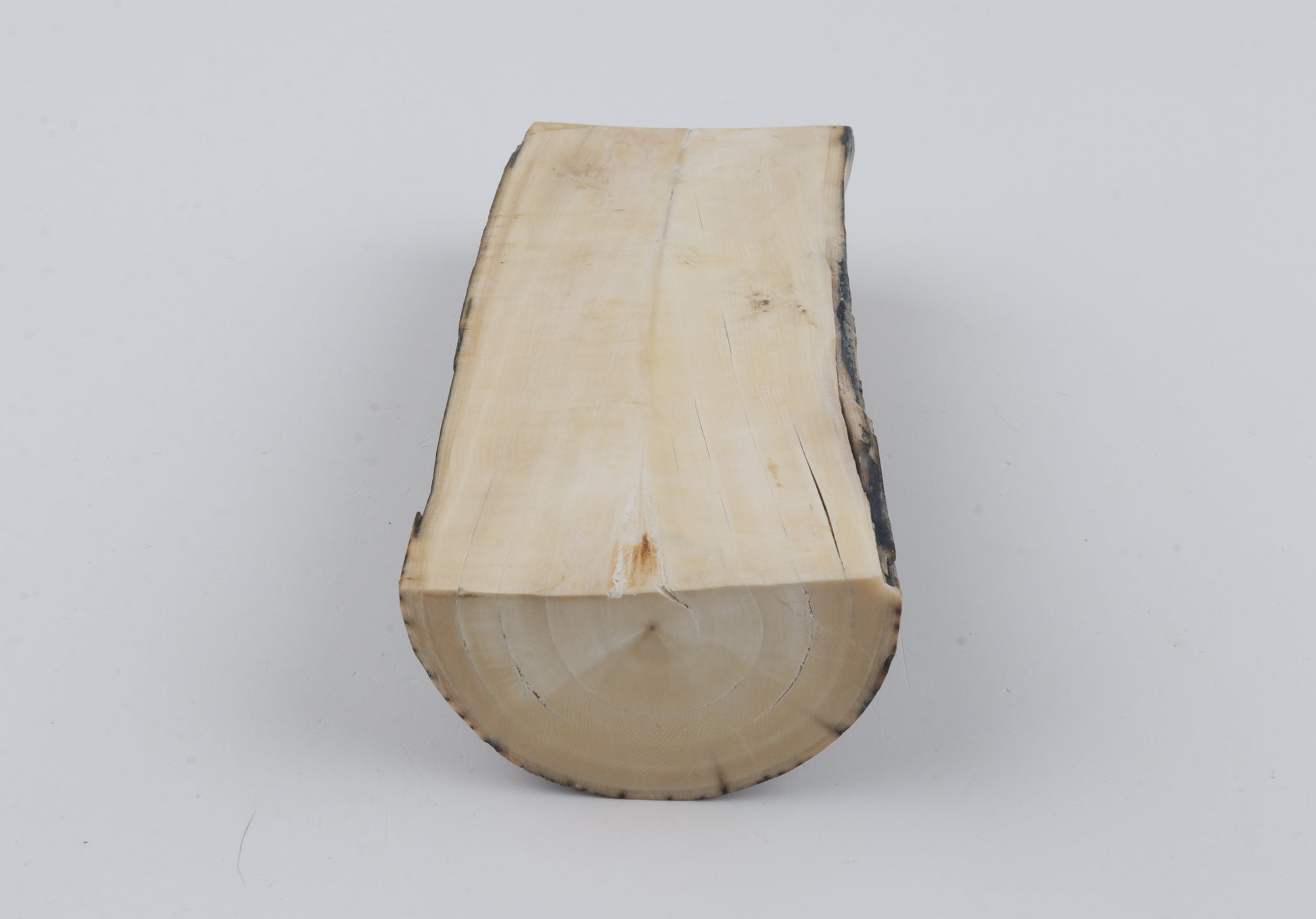 This is a premium-quality piece of Siberian woolly mammoth ivory (Mammuthus primigenius). The ivory is naturally dense and solid, despite some small cracks. Tapered thickness: One cross-cut section is slightly thinner than the other. Consistent width with reserves on both ends. The piece displays its original, natural ivory tone. The color of the outer layer of bark is brown-green.