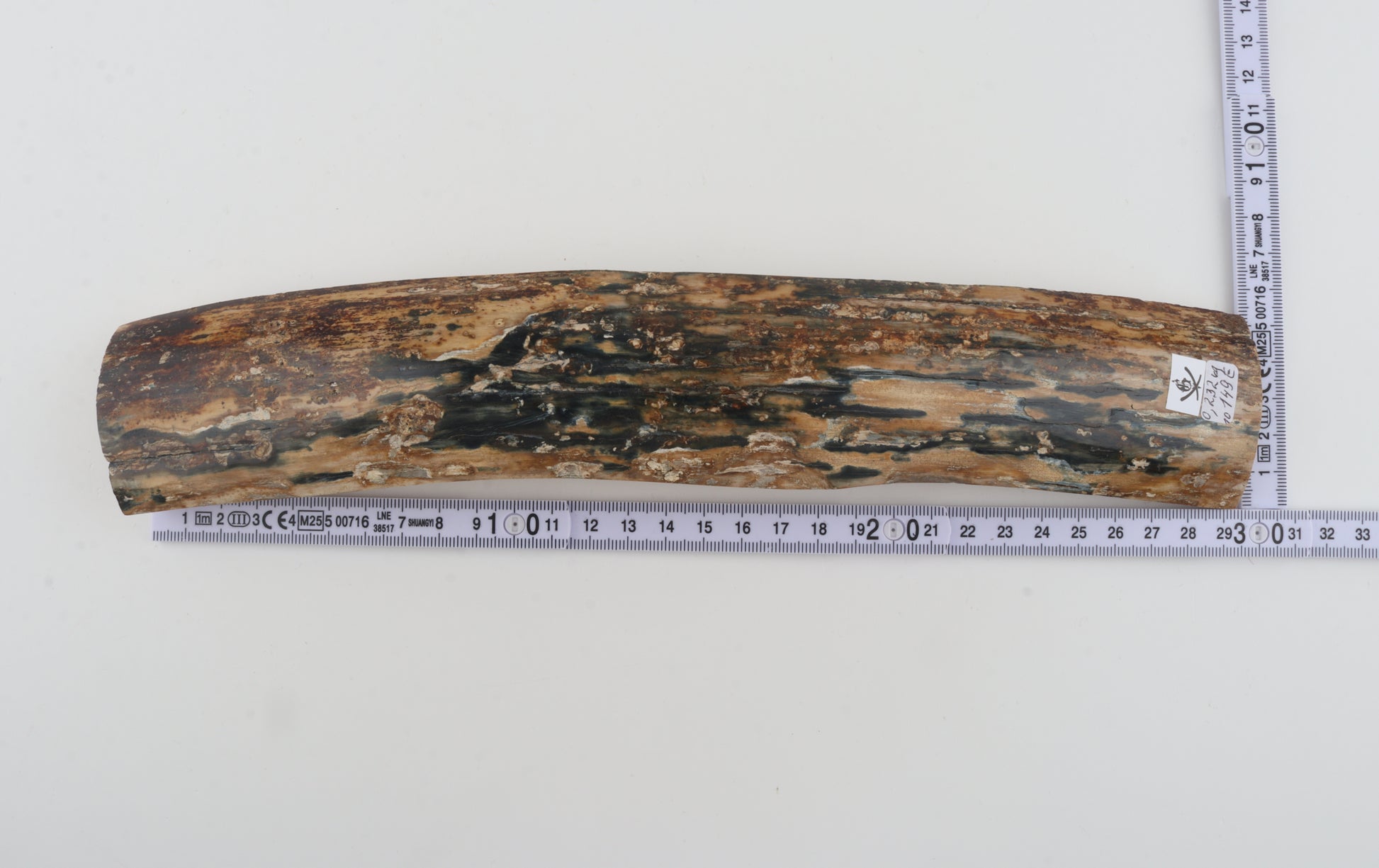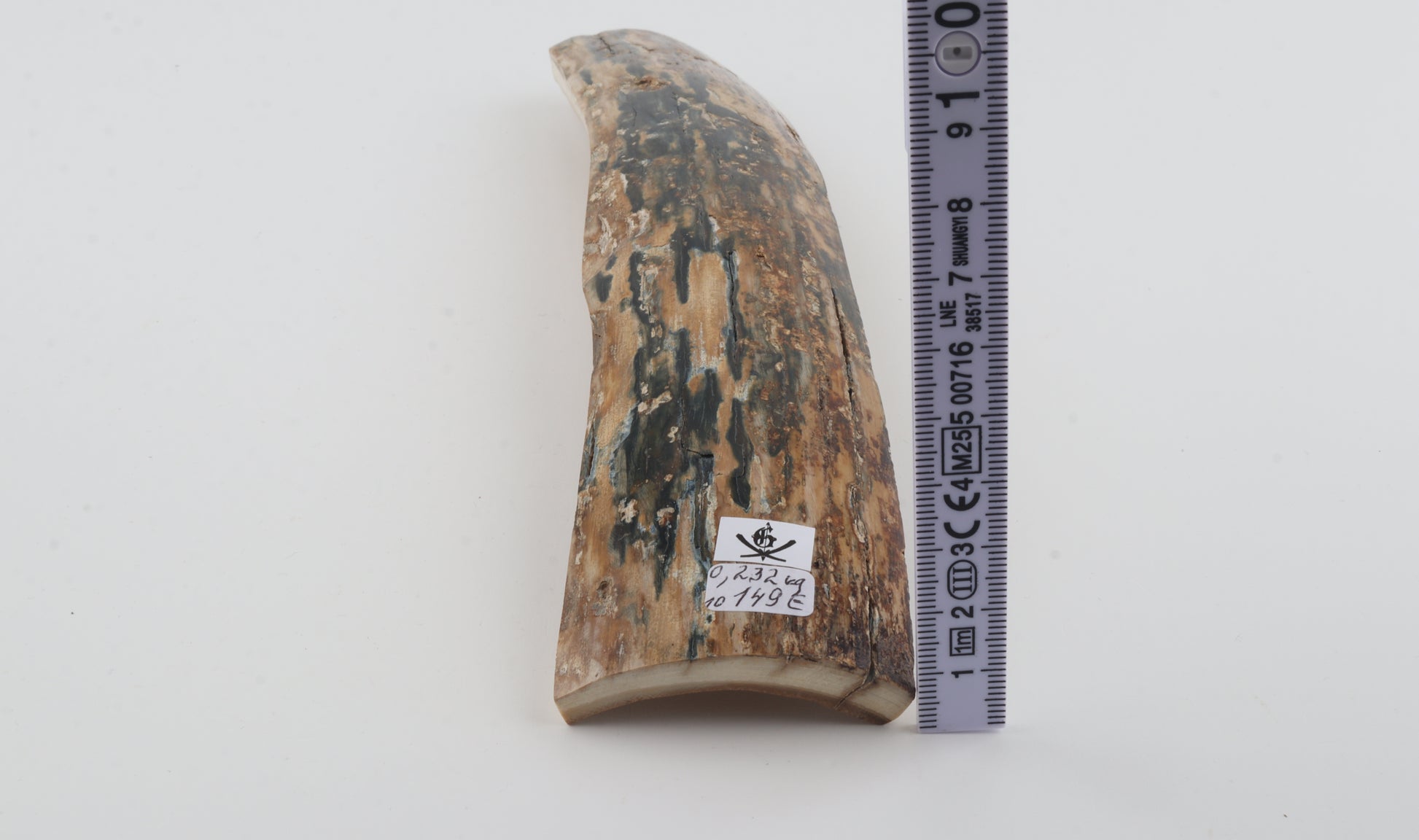 This is a top-quality piece of Siberian woolly mammoth bark (Mammuthus primigenius). The ivory is rock-solid despite some small, non-penetrating cracks. One cross-cut section is slightly wider than the other. Consistent thickness with reserves on both ends. The colour of the bark is a mix of blue, beige and brown.