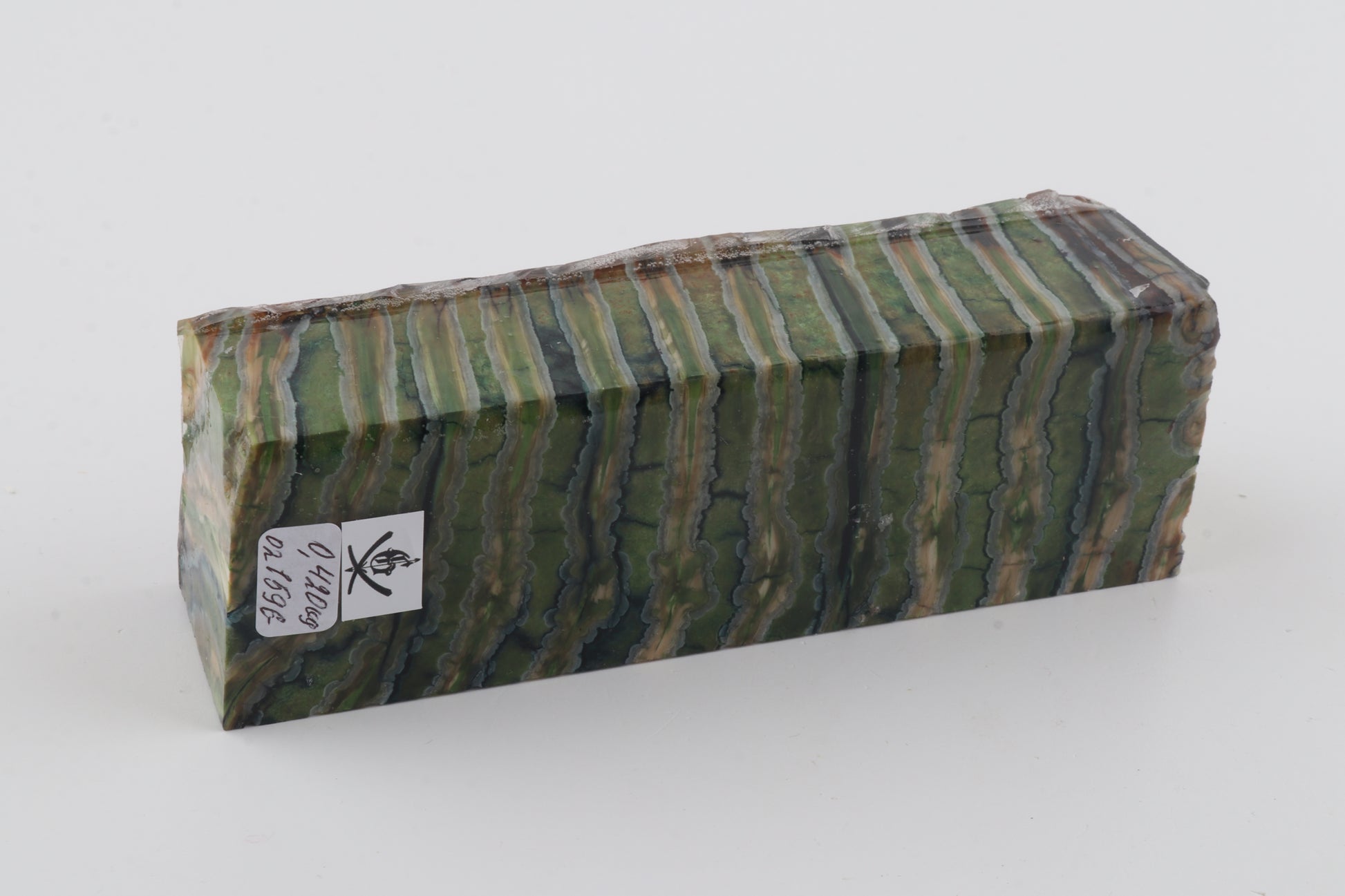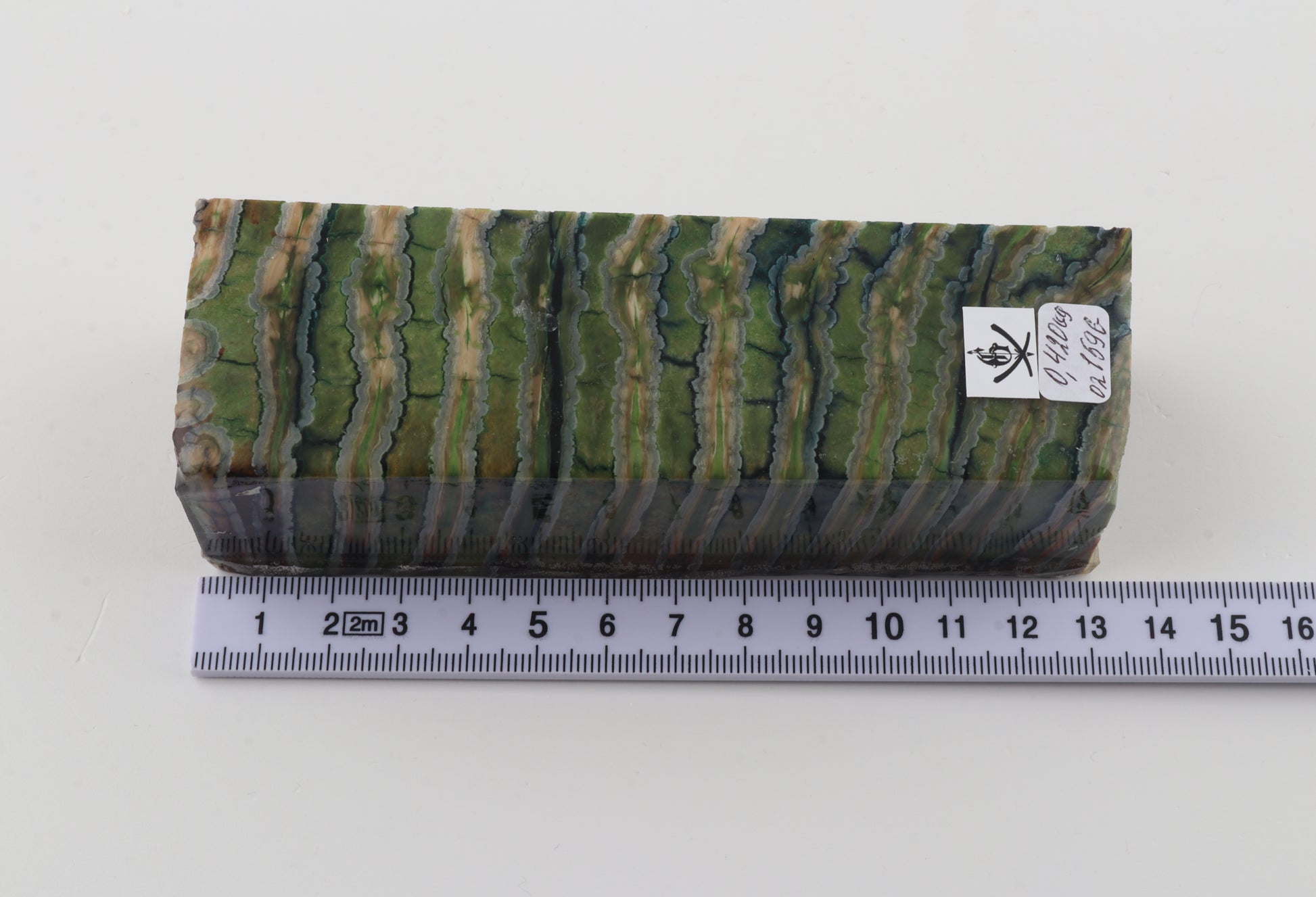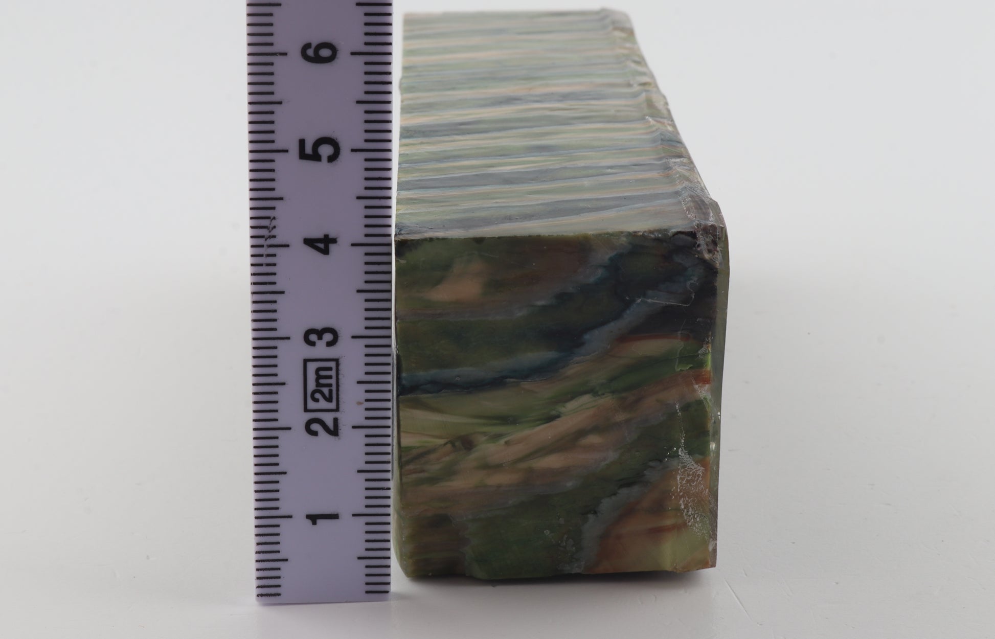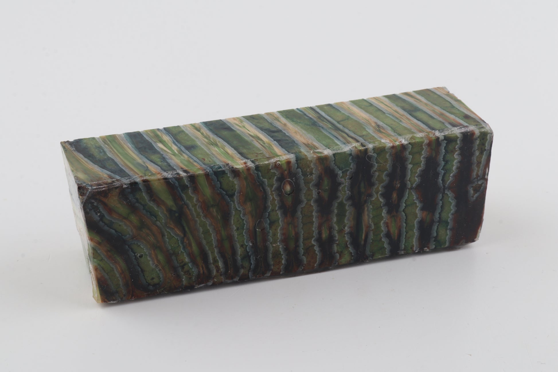 This is a cross-cut, stabilized woolly mammoth molar piece (Mammuthus primigenius). This square block can be precision-cut, drilled, sanded, polished etc. to achieve the desired results. One cross-cut section is slightly larger than the other. The colour of the molar is green.