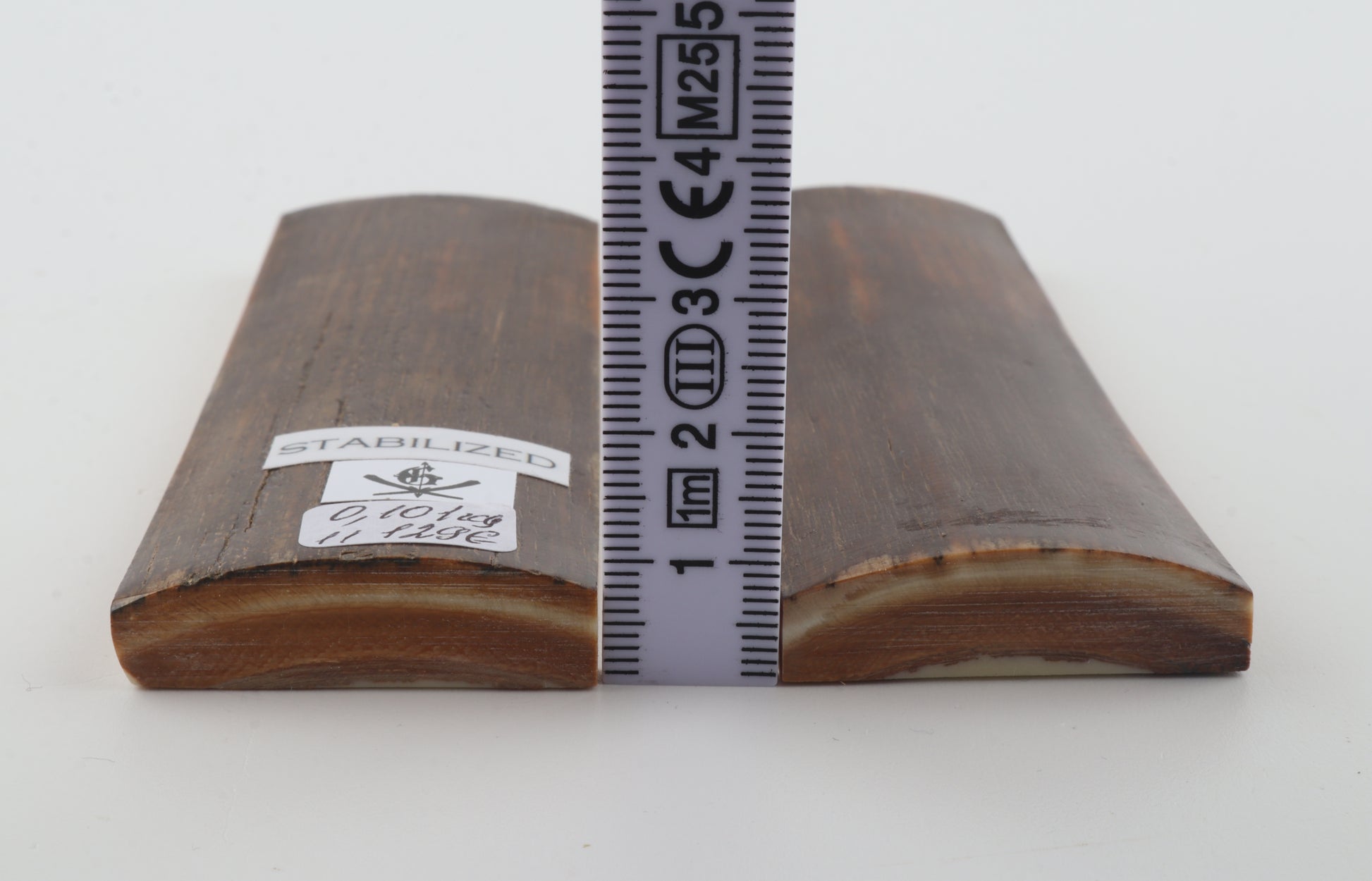 This is a pre-cut pair of stabilized woolly mammoth bark scales (Mammuthus primigenius). These scales can be cut, drilled, sanded, polished etc. to achieve the desired results. Consistent width and thickness with reserves on both ends. The undersides are flat. The colour of the bark is brown.