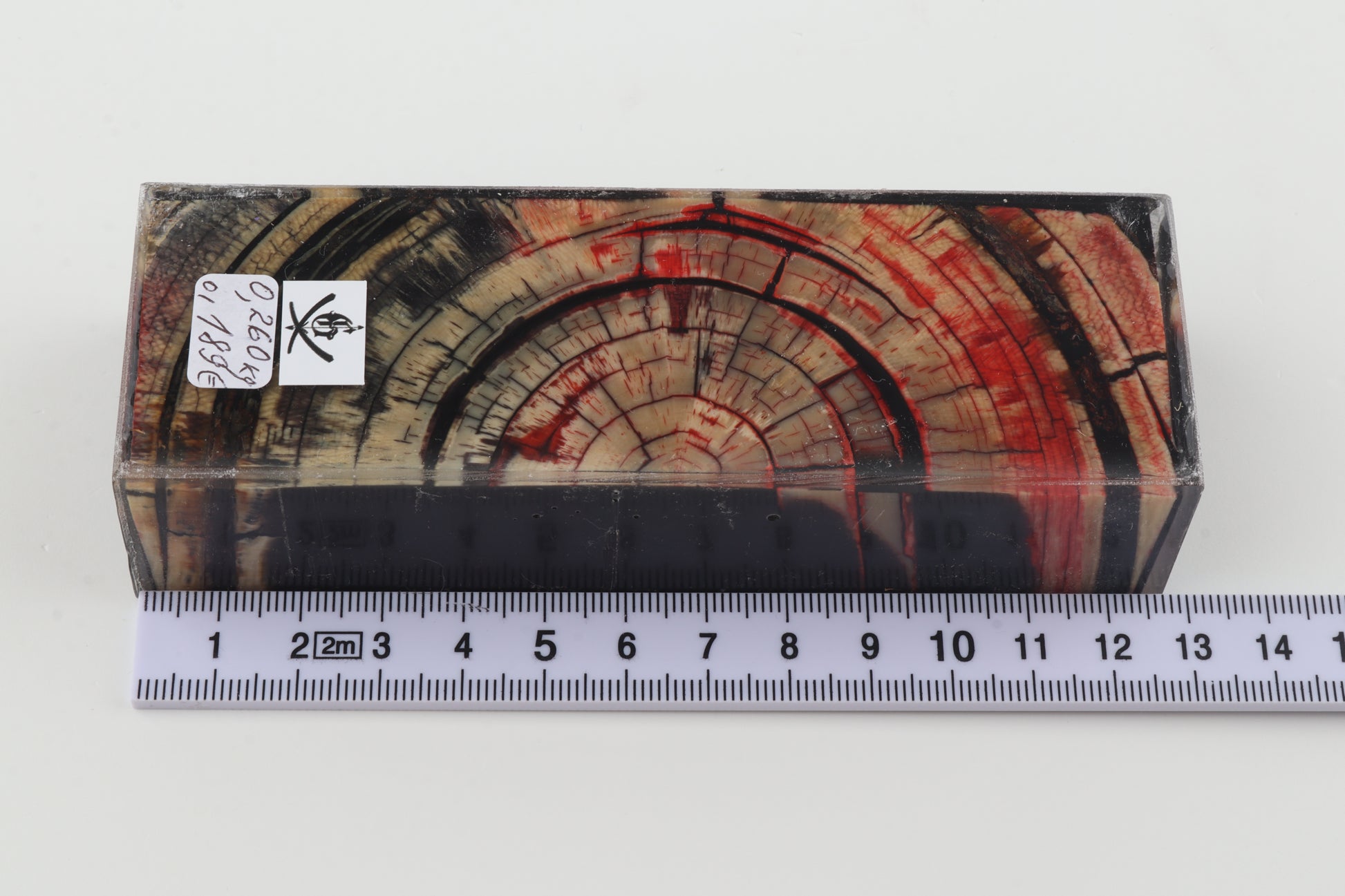 This is a cross-cut stabilized woolly mammoth ivory block (Mammuthus primigenius). This block can be precision-cut, drilled, sanded, polished etc. to achieve the desired results. Consistent width and thickness with reserves on both ends. The colour of the ivory is a mix of beige, red and green.