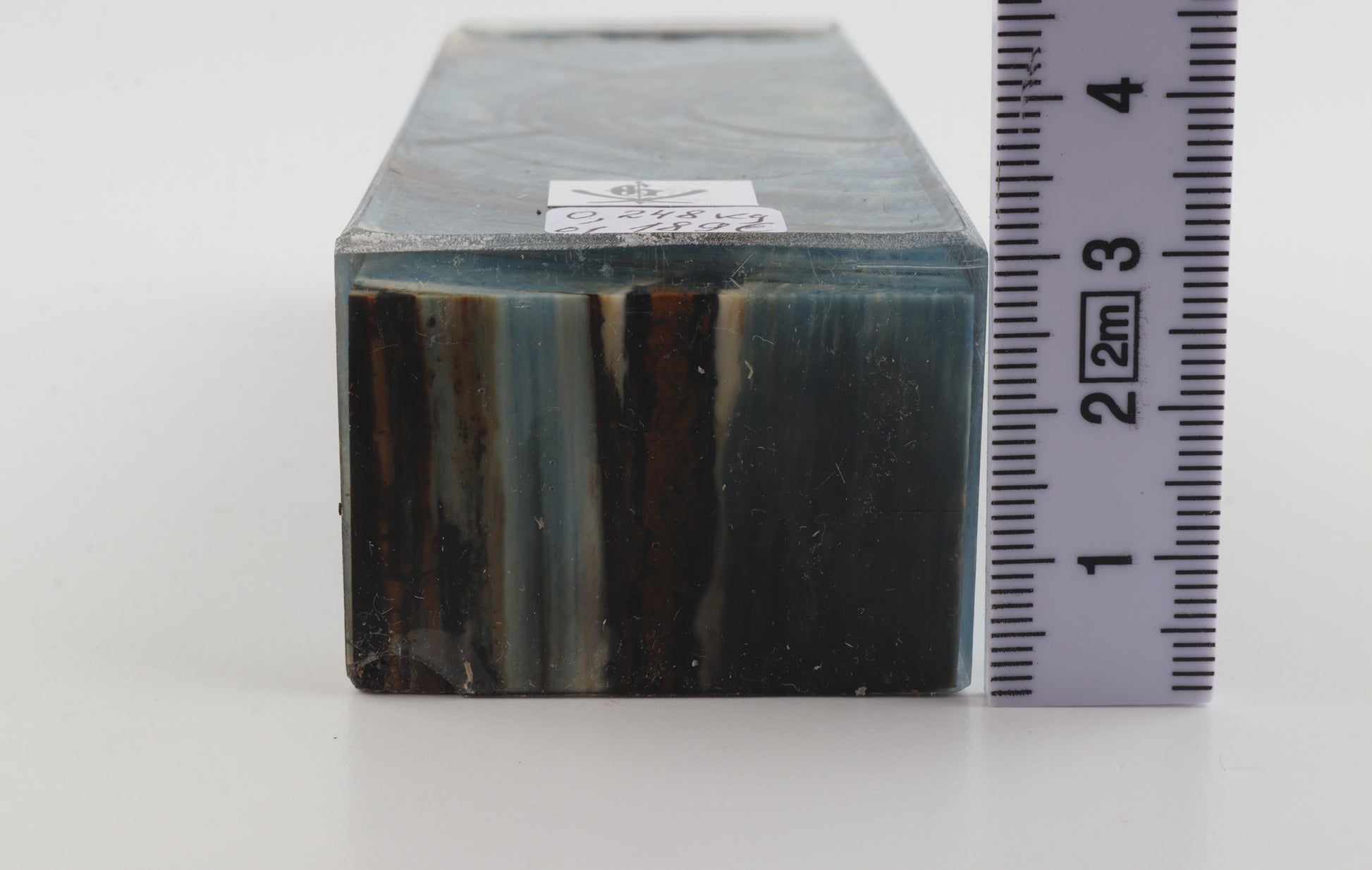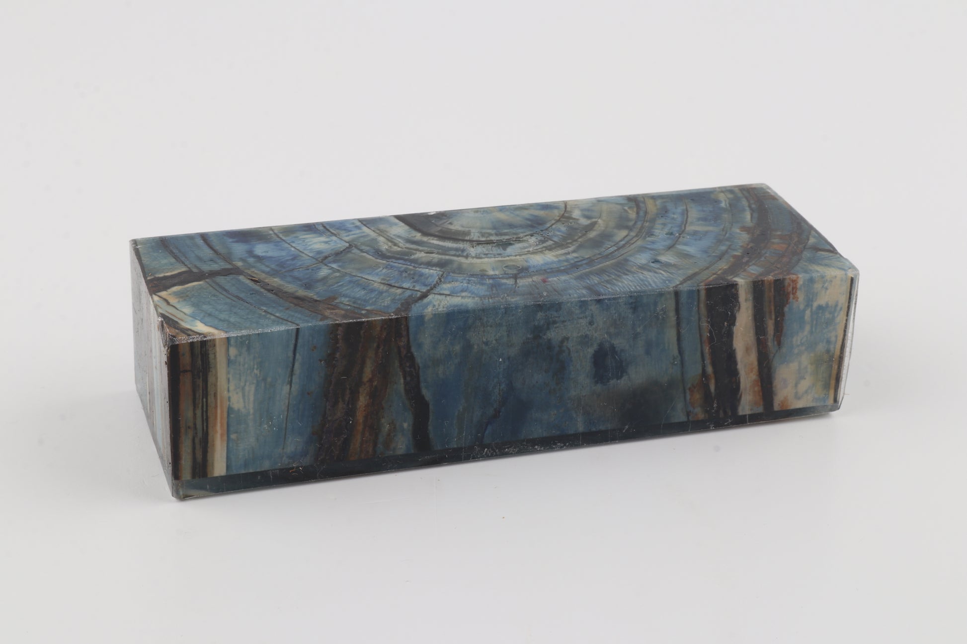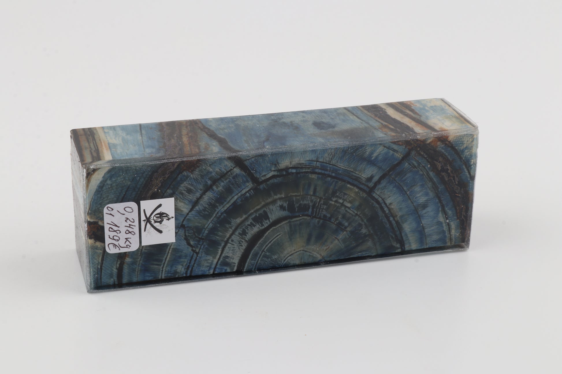 This is a cross-cut stabilized woolly mammoth ivory block (Mammuthus primigenius). This block can be precision-cut, drilled, sanded, polished etc. to achieve the desired results. Consistent width and thickness with reserves on both ends. The colour of the ivory is blue.