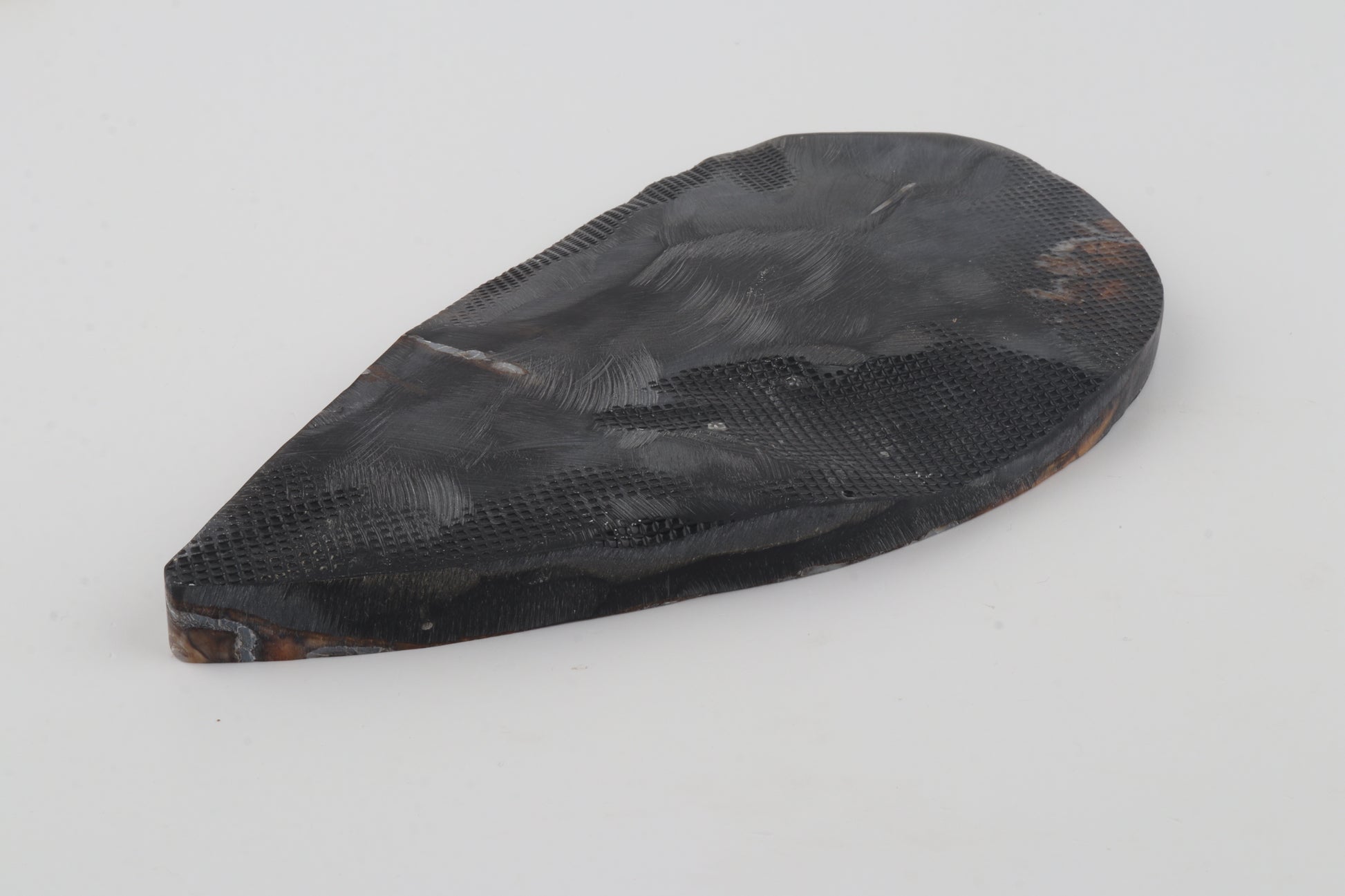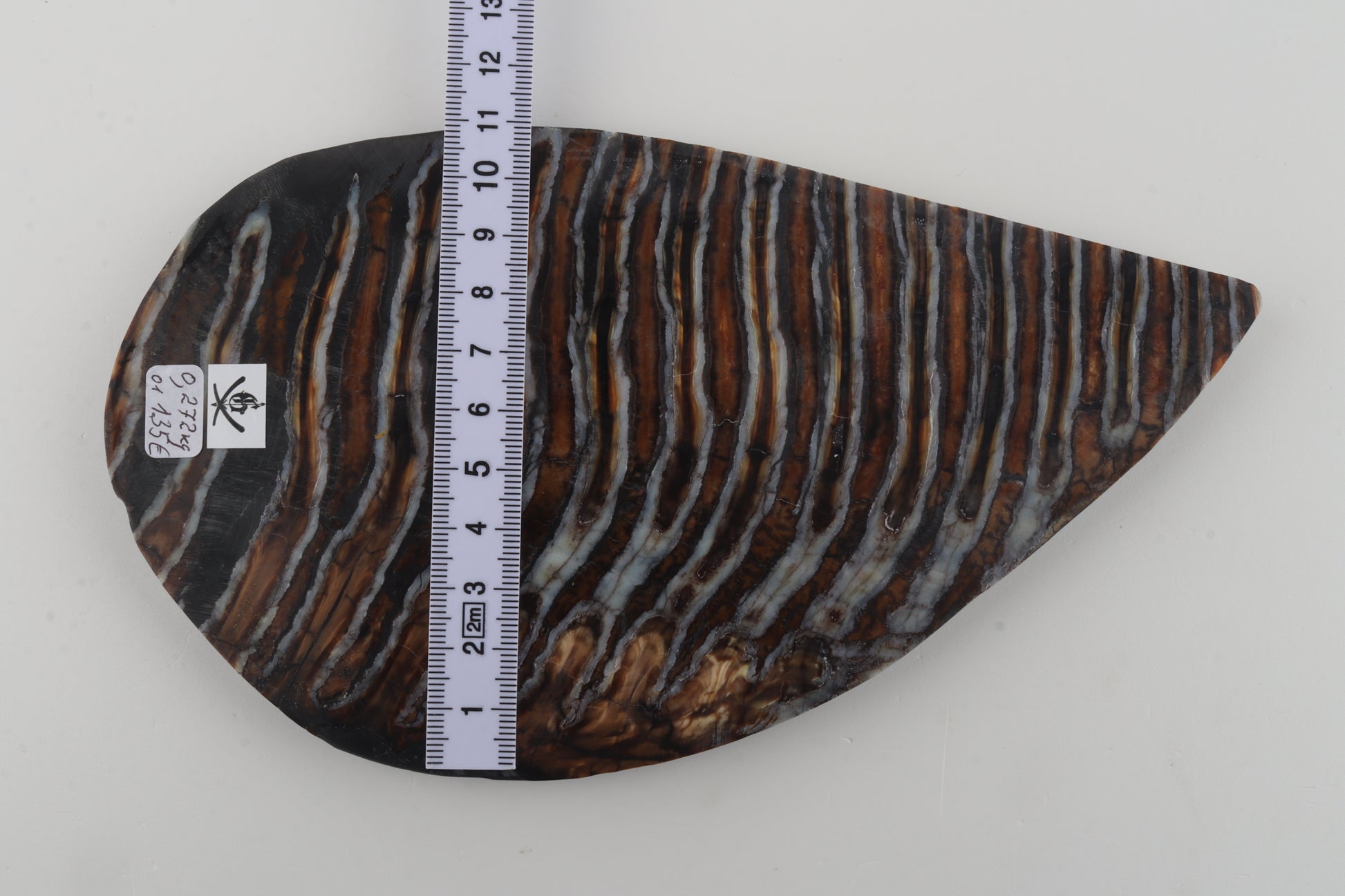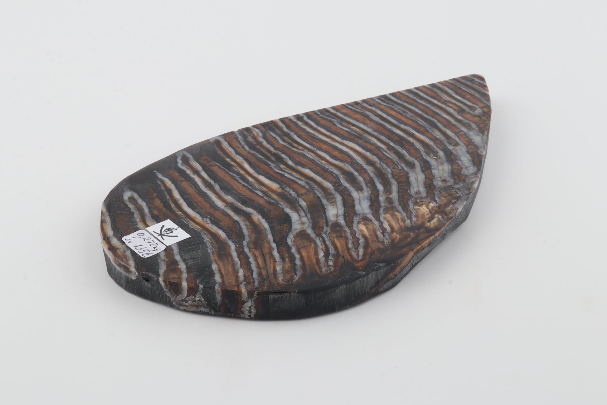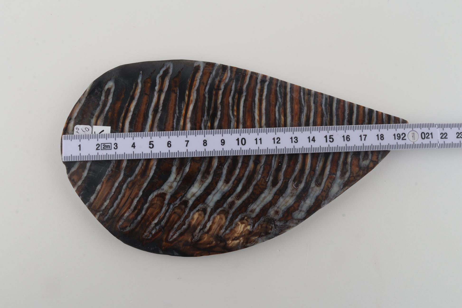 This is a cross-cut, stabilized woolly mammoth molar slab (Mammuthus primigenius). This slab can be precision-cut, drilled, sanded, polished etc. to achieve the desired results. Please carefully look at the pictures for precise dimensions. The colour of the molar is brown-grey.