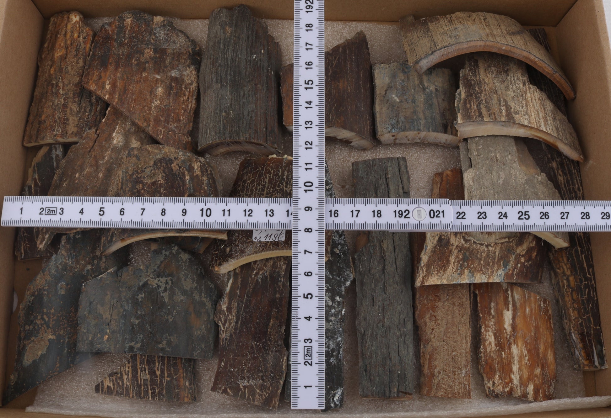 This lot consists of 22 untreated Siberian woolly mammoth bark pieces (Mammuthus primigenius). Each piece was hand-selected to form a matching lot. Please carefully look at the pictures for precise dimensions and colours.