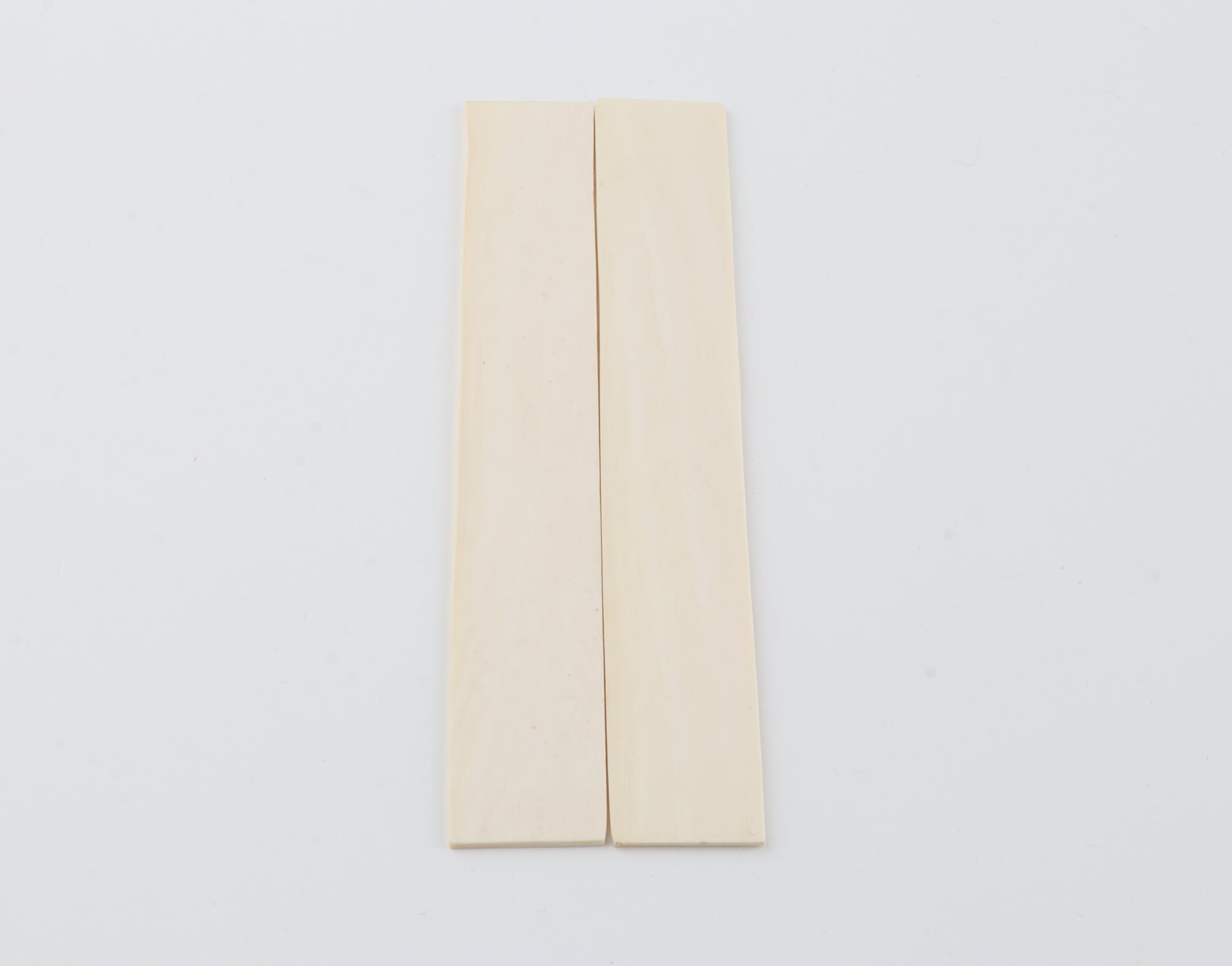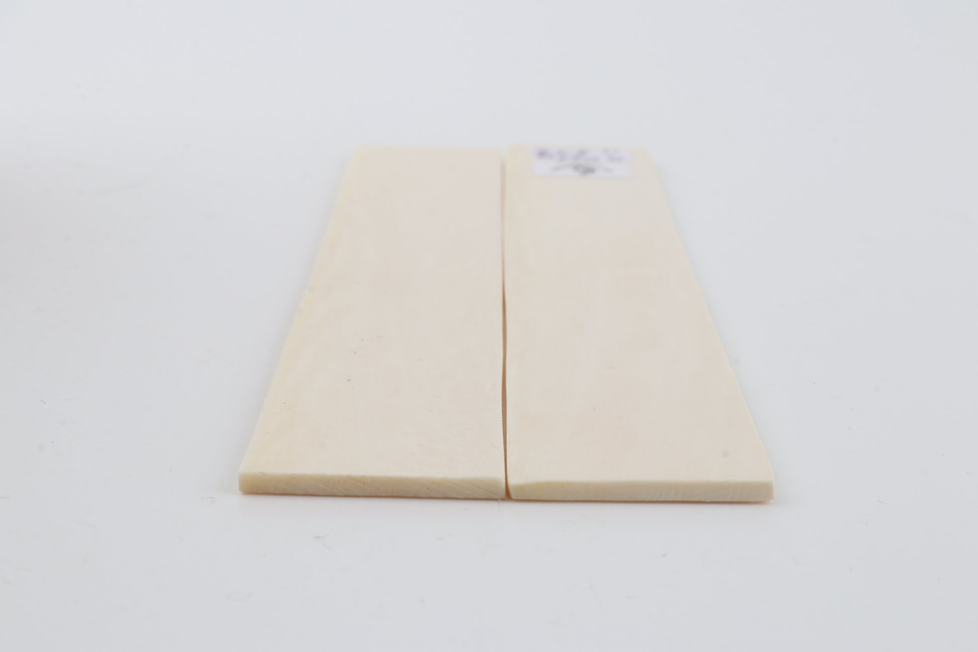 This is a pre-cut pair of natural woolly mammoth ivory scales (Mammuthus primigenius). These scales are in an immaculate condition. The ivory is dry and without cracks. Consistent width and thickness with reserves on both ends. The undersides are flat. These pieces display the typical ivory tone.