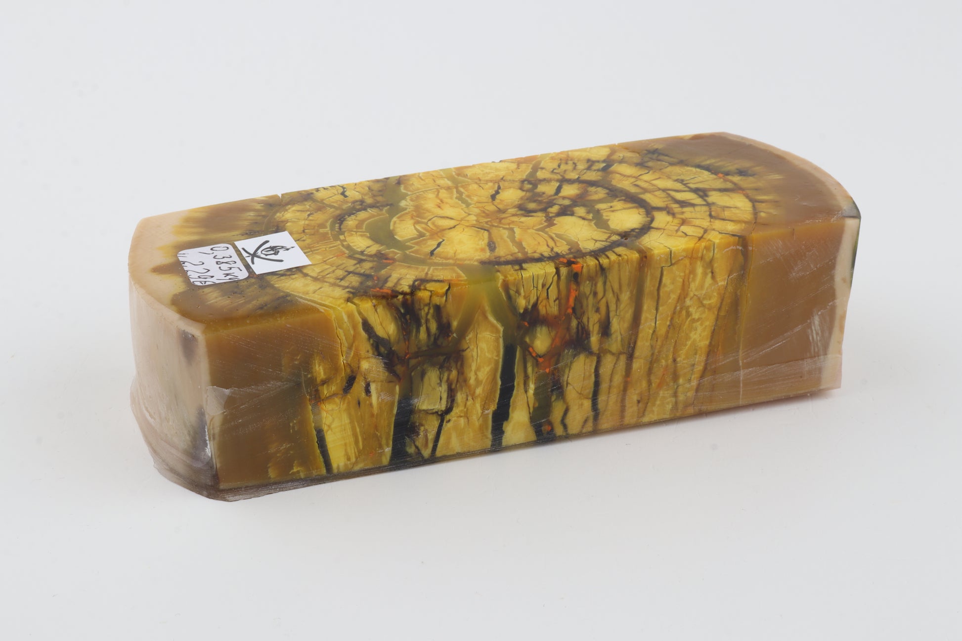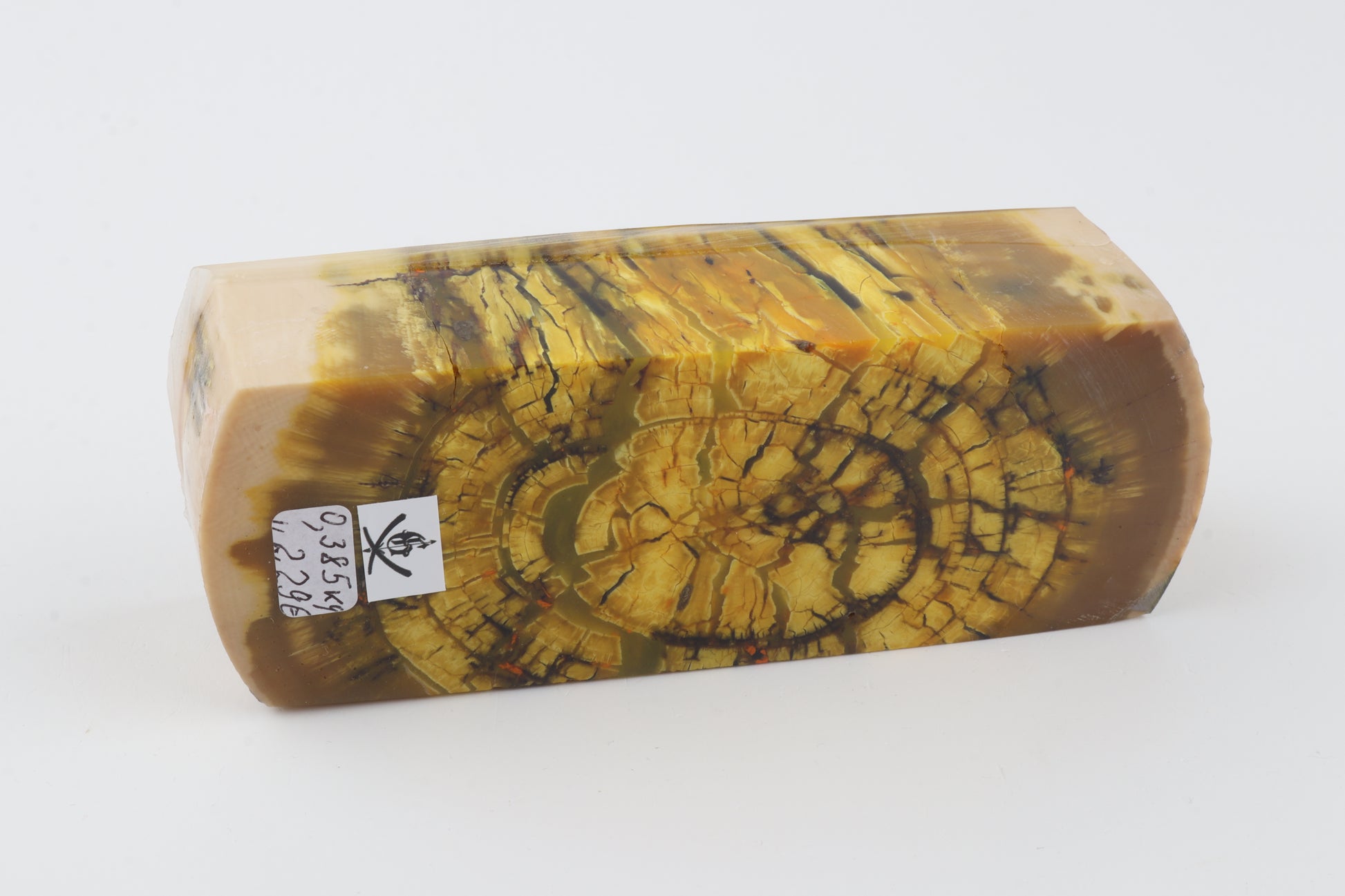 This is a cross-cut stabilized woolly mammoth ivory block (Mammuthus primigenius). This block can be precision-cut, drilled, sanded, polished etc. to achieve the desired results. Consistent width and thickness with reserves on both ends. The colour of the ivory is yellow.