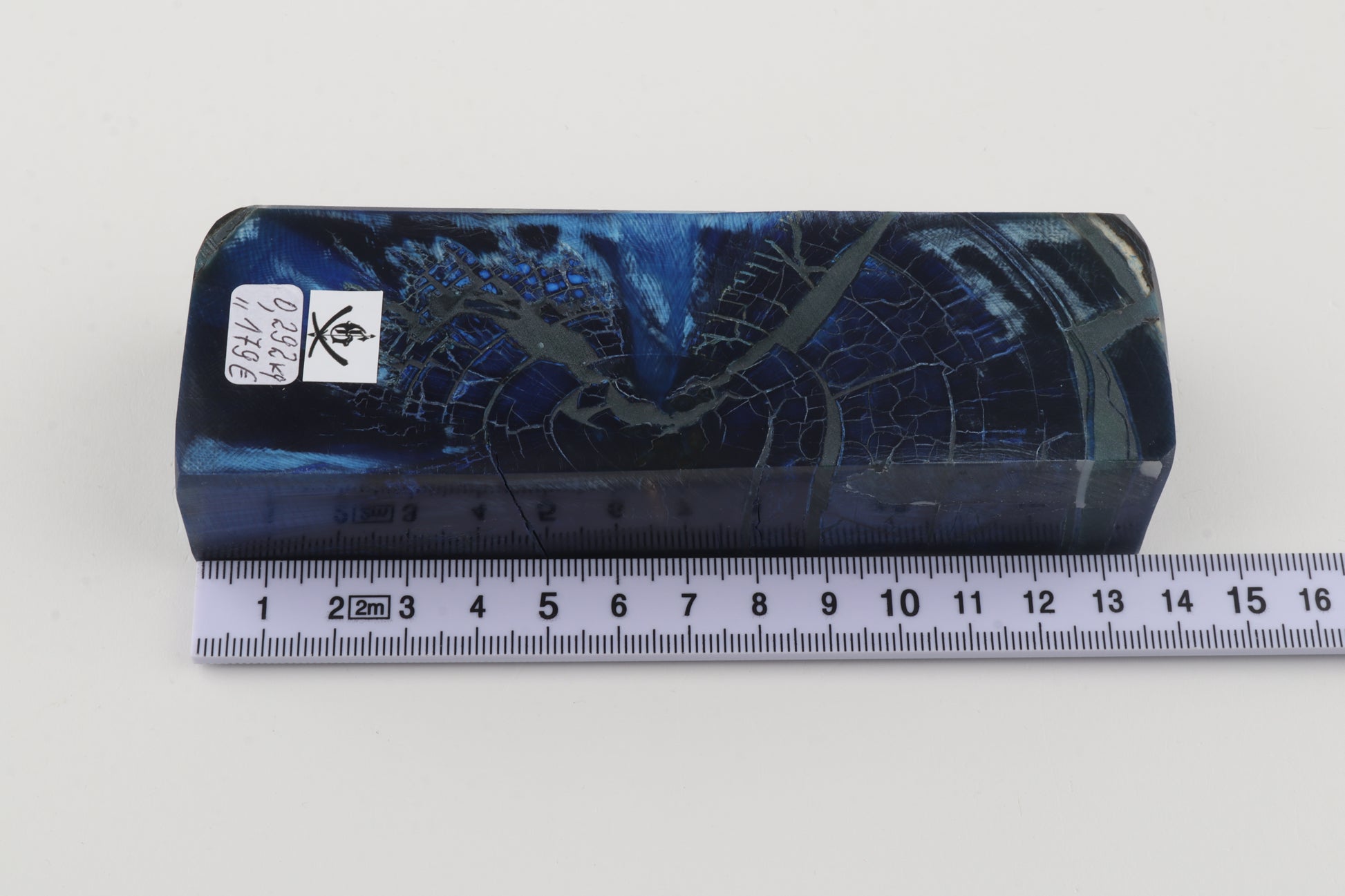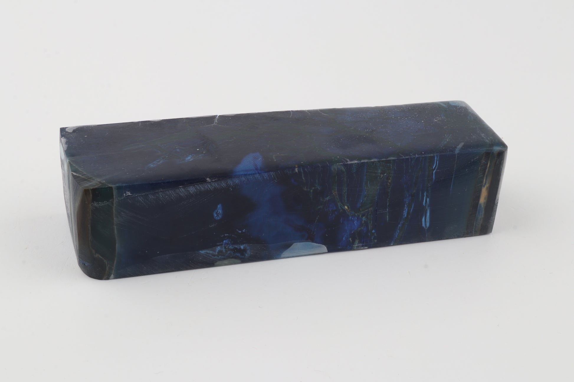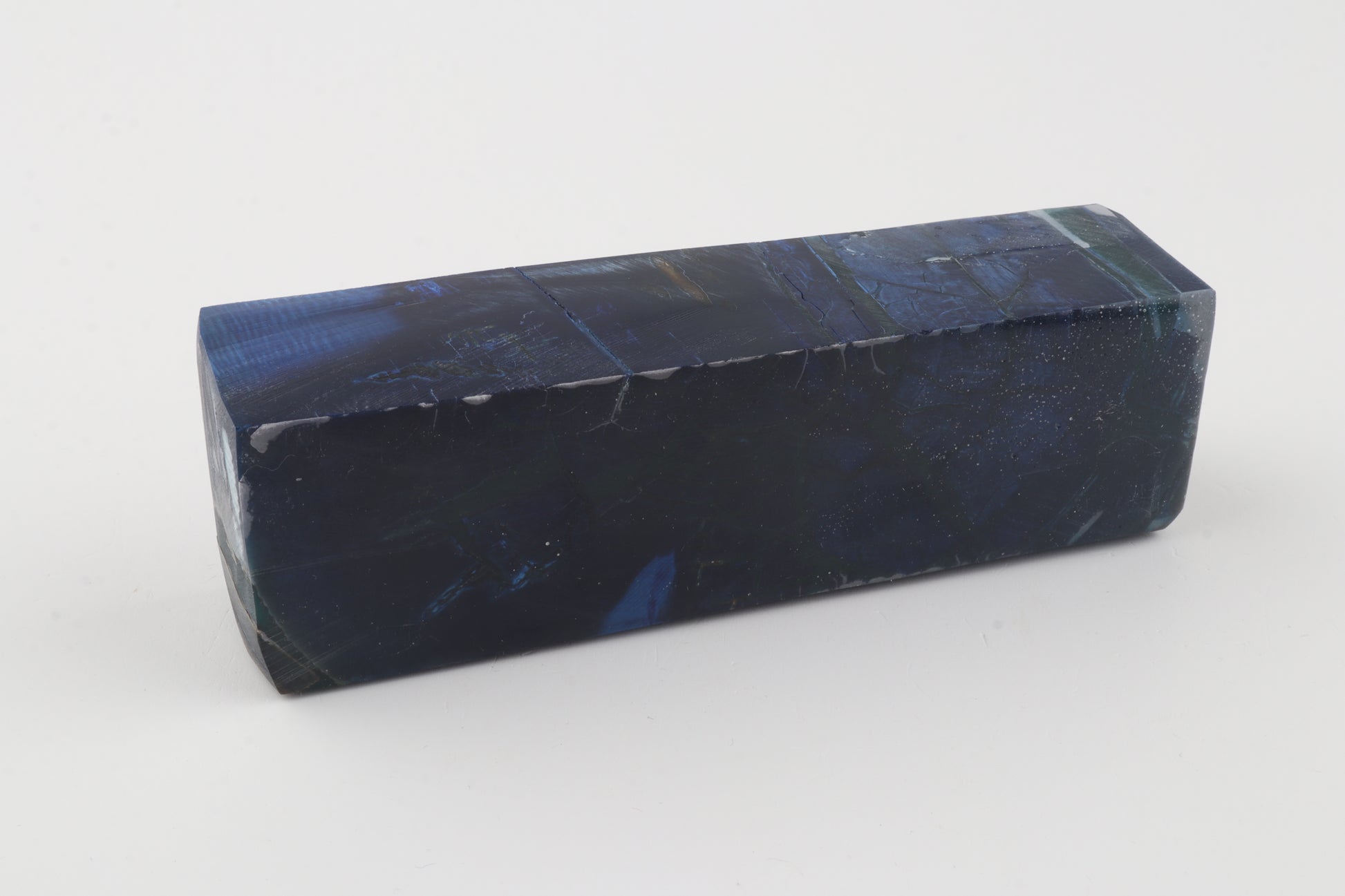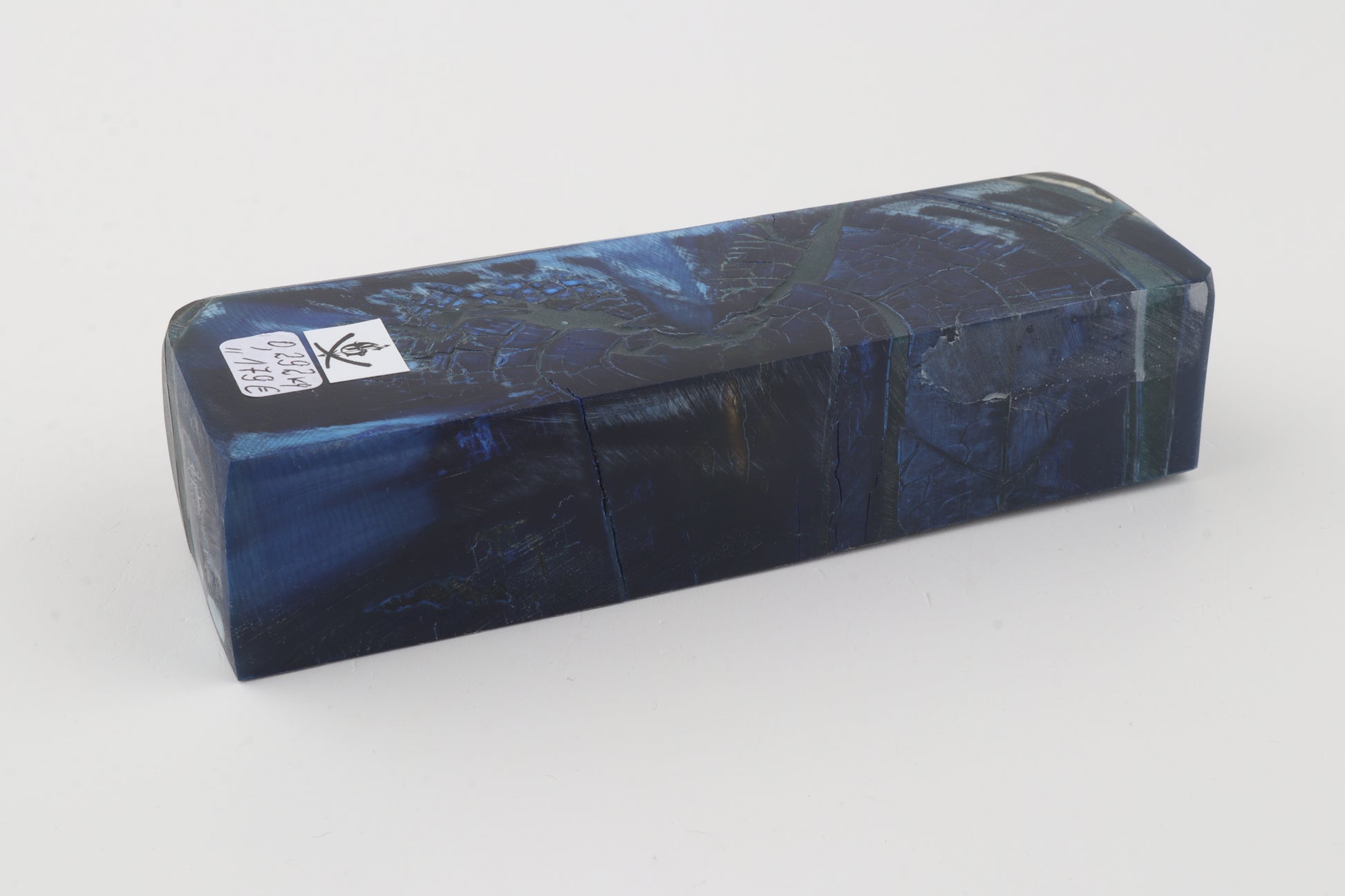 This is a cross-cut stabilized woolly mammoth ivory block (Mammuthus primigenius). This block can be precision-cut, drilled, sanded, polished etc. to achieve the desired results. Consistent width and thickness with reserves on both ends. The colour of the ivory is blue.
