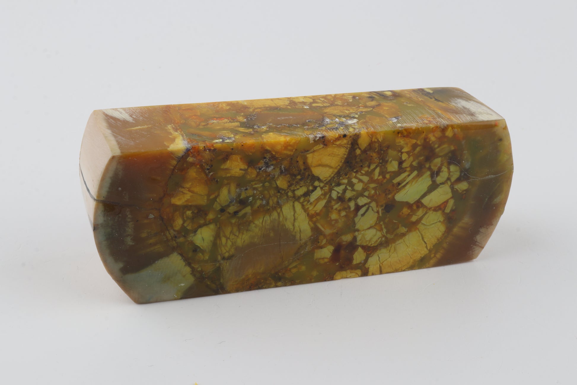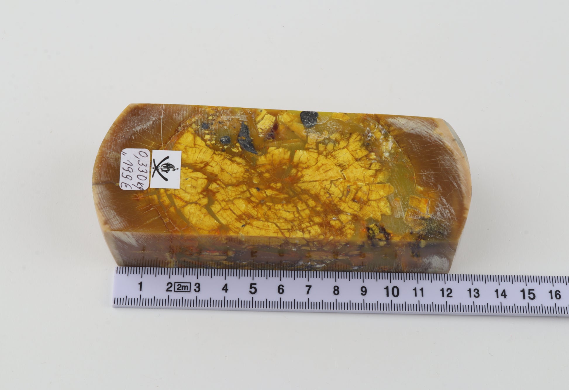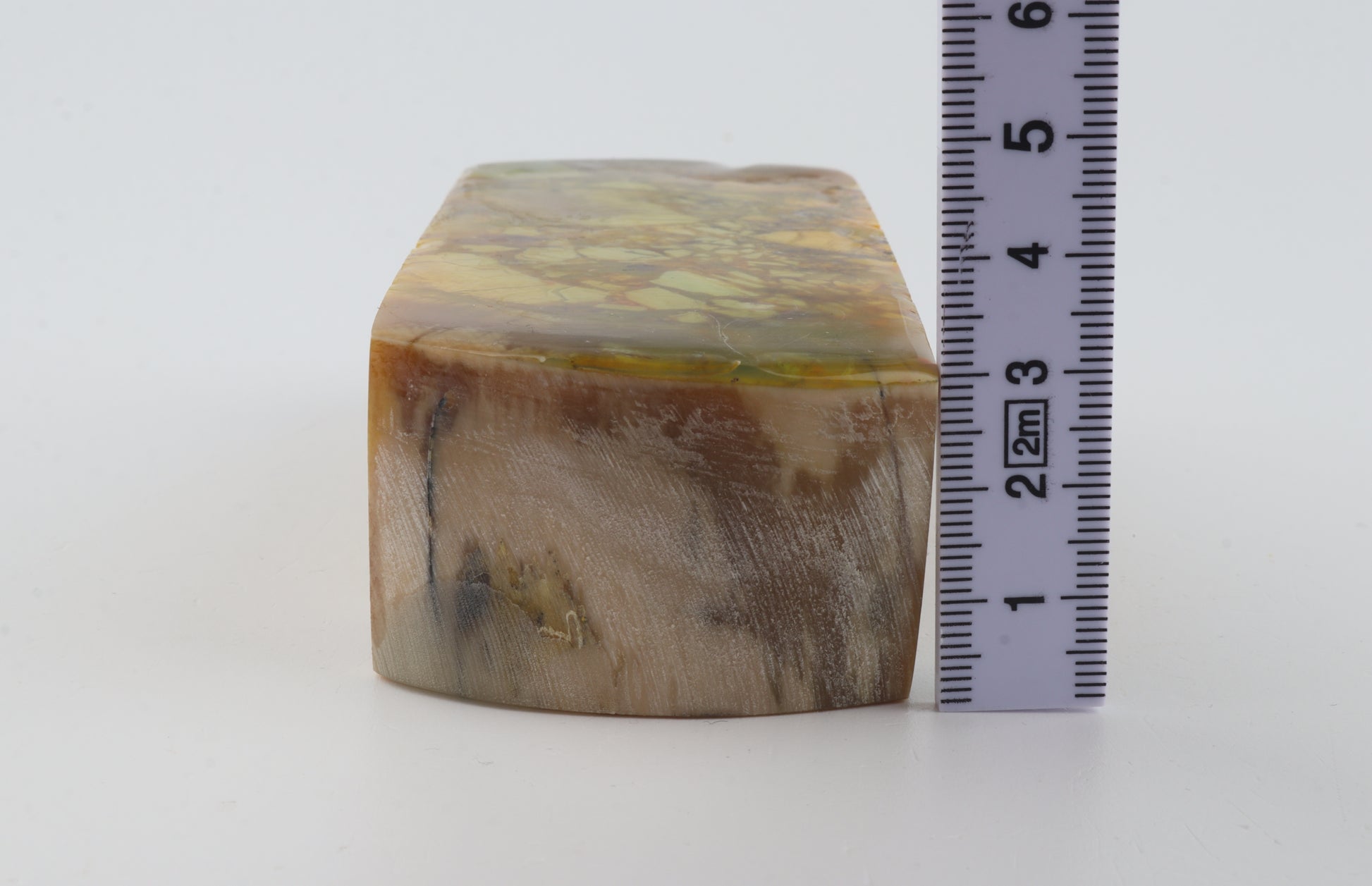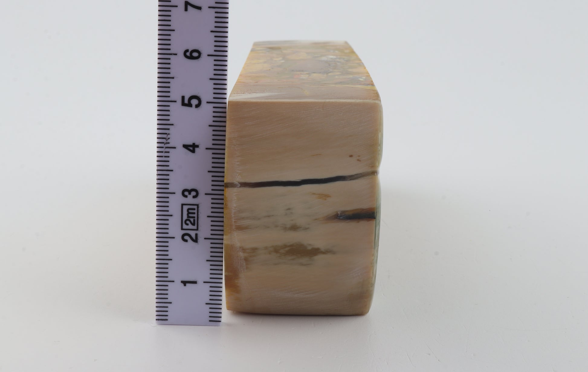 This is a cross-cut stabilized woolly mammoth ivory block (Mammuthus primigenius). This block can be precision-cut, drilled, sanded, polished etc. to achieve the desired results. Consistent width and thickness with reserves on both ends. The colour of the ivory is yellow.