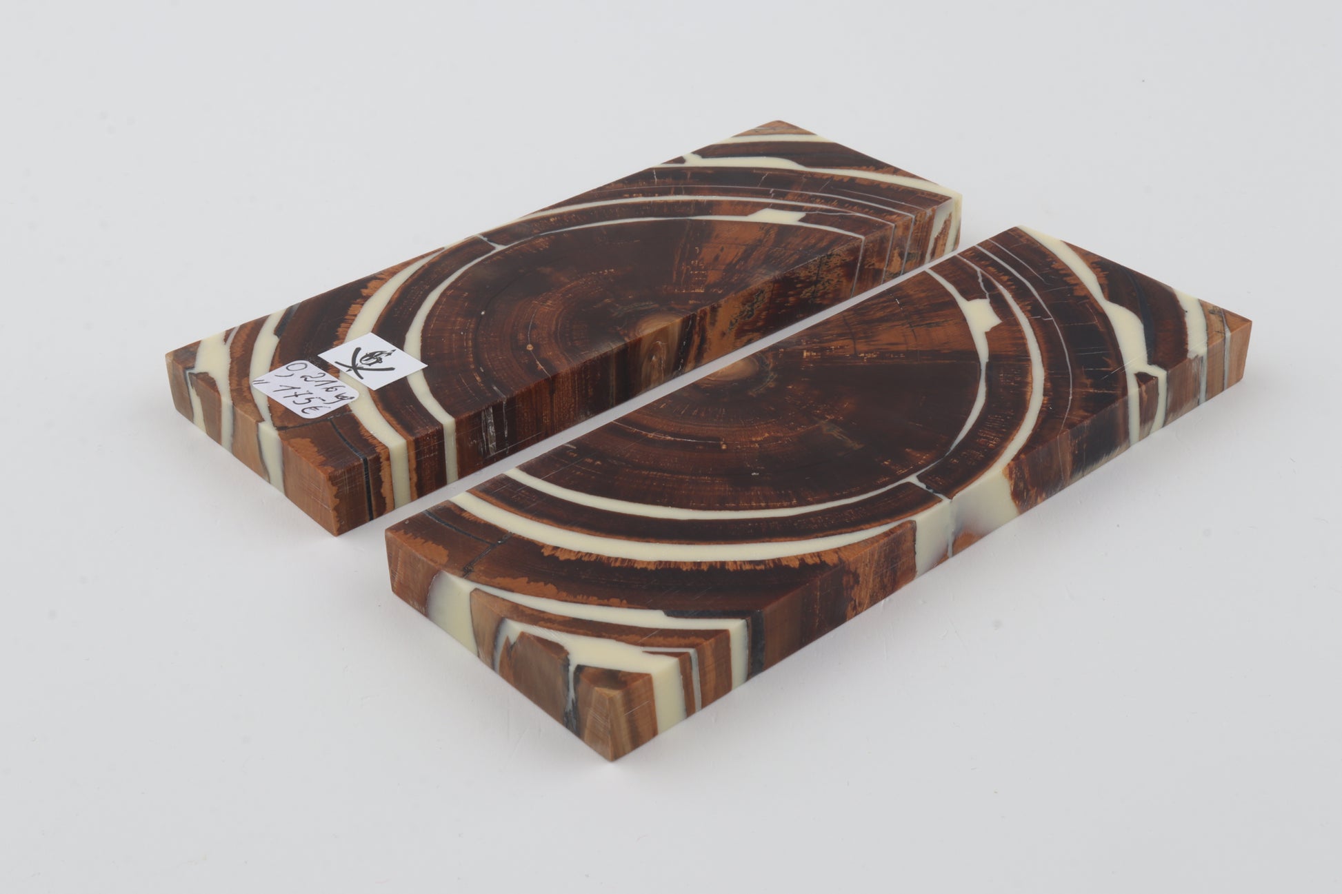 This is a pre-cut pair of stabilised mammoth ivory scales (Mammuthus primigenius). These scales can be precision-cut, drilled, polished, sanded etc. to achieve the desired results. One slab is larger than the other. Consistent width and thickness with reserves on both ends. The colour of the ivory is brown.