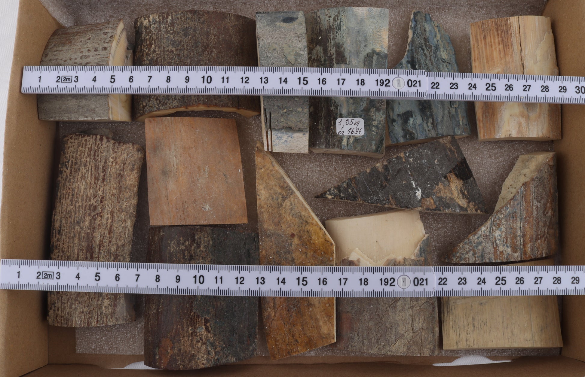 This lot consists of 14 untreated Siberian woolly mammoth bark pieces (Mammuthus primigenius). Each piece was hand-selected to form a matching lot. Please carefully look at the pictures for precise dimensions and colours