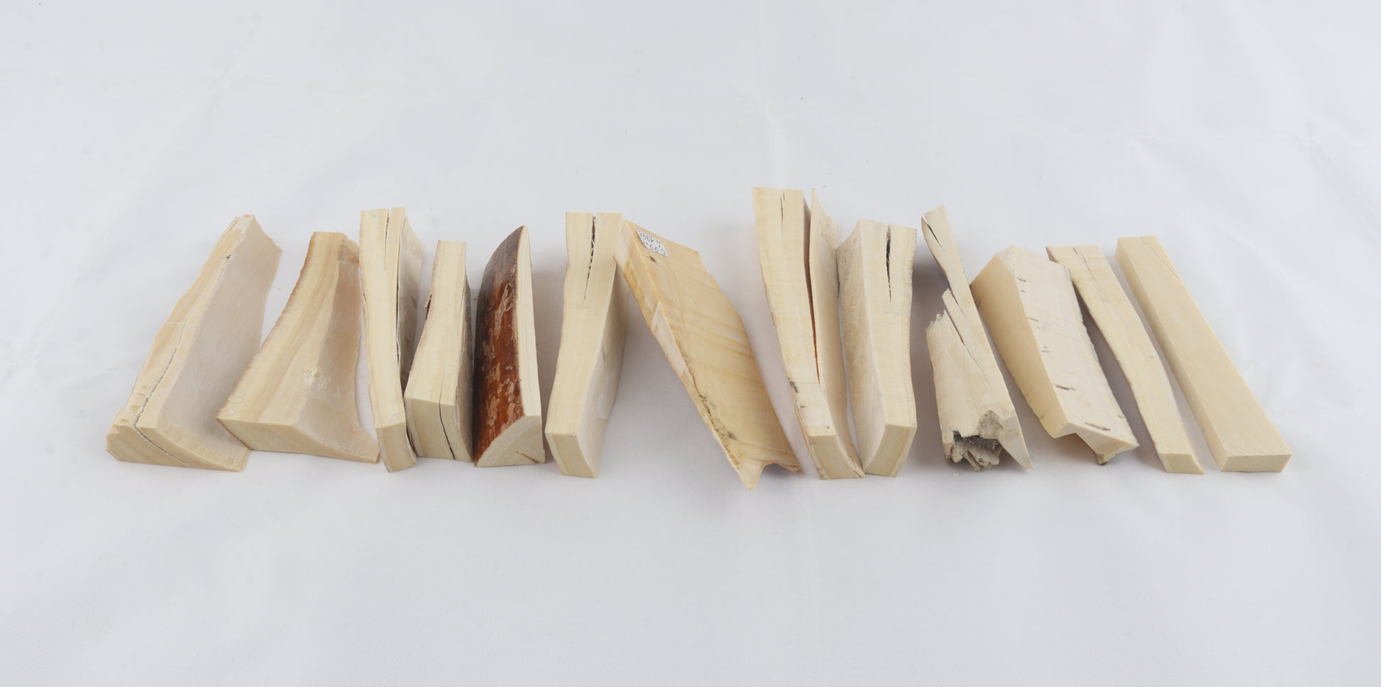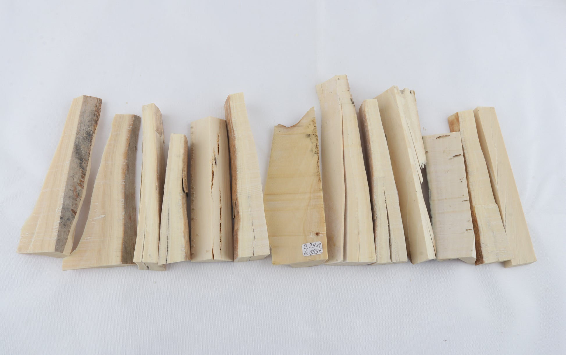 This lot consists of 13 white Siberian woolly mammoth ivory pieces (Mammuthus primigenius). Each piece was hand-selected to form a matching lot. Please carefully look at the pictures for precise dimensions and colours.