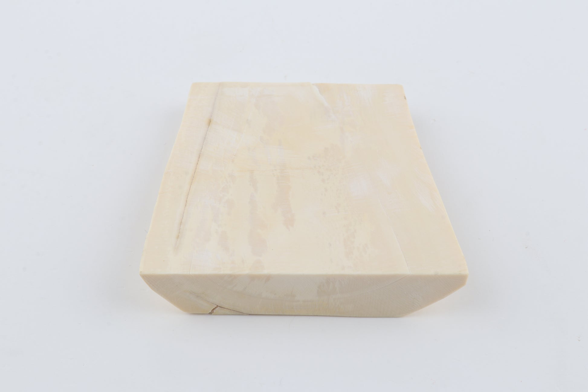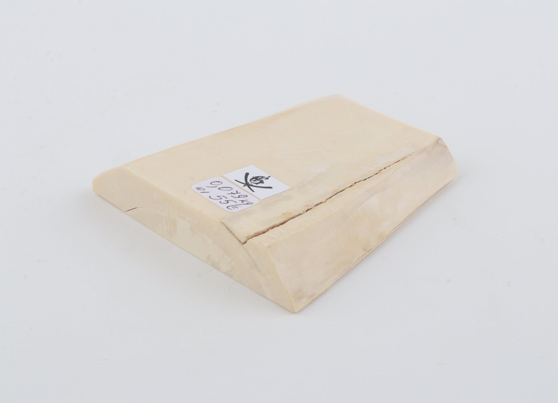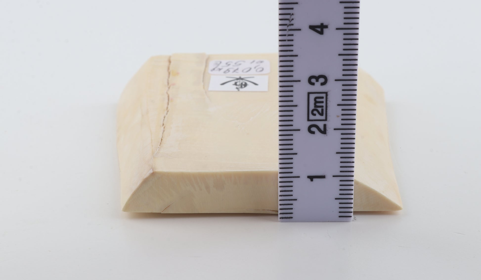 This is a top-quality piece of Siberian woolly mammoth ivory (Mammuthus primigenius). The ivory is rock-solid and completely dry. There are some small cracks. One cross-cut section is thicker and wider than the other. Reserves on both ends. Please carefully check the pictures for precise dimensions. The colour of the ivory is white.
