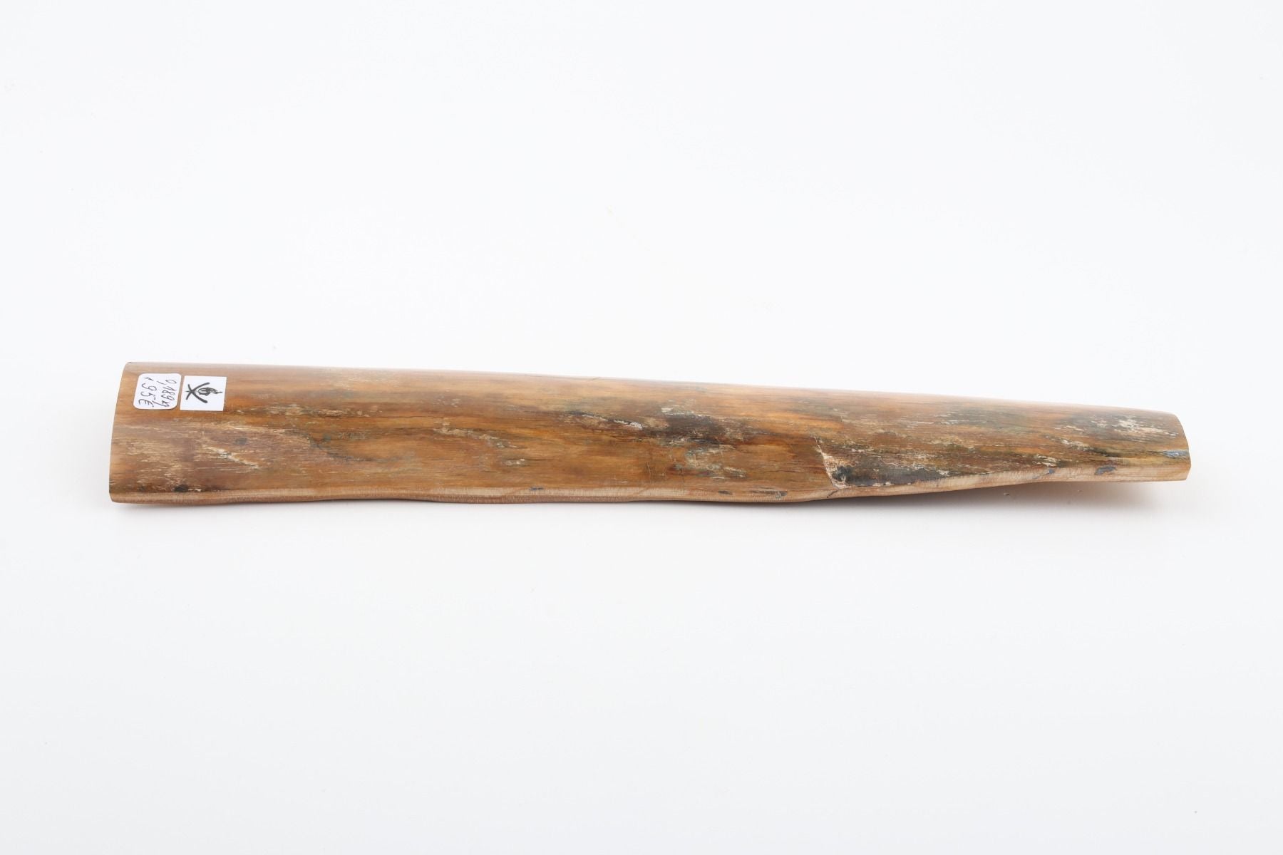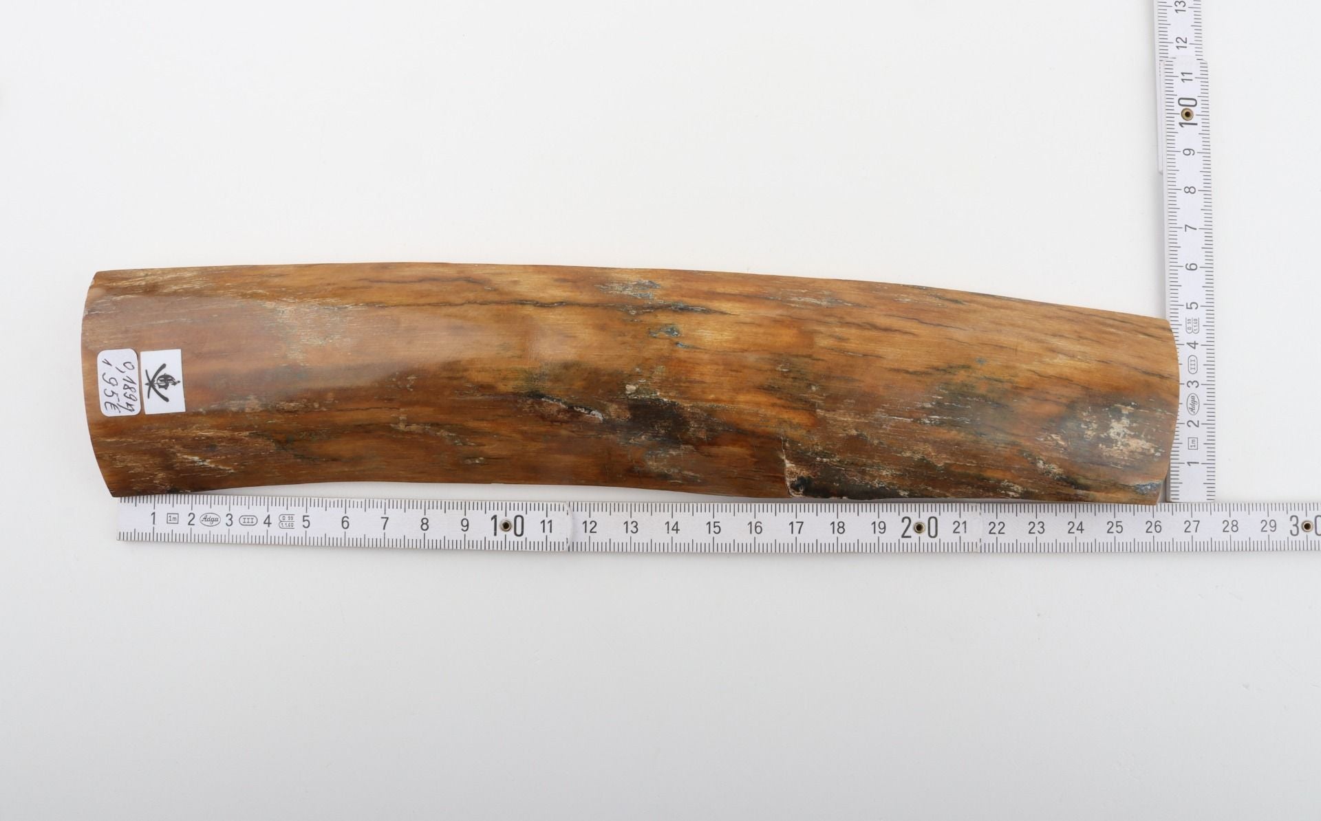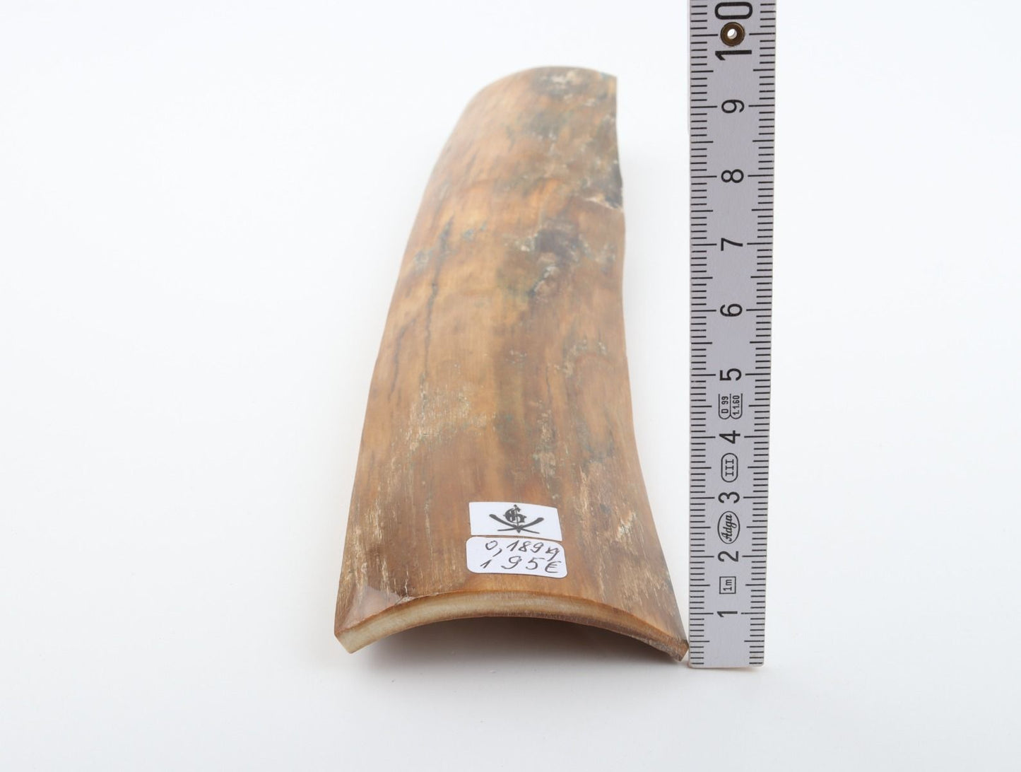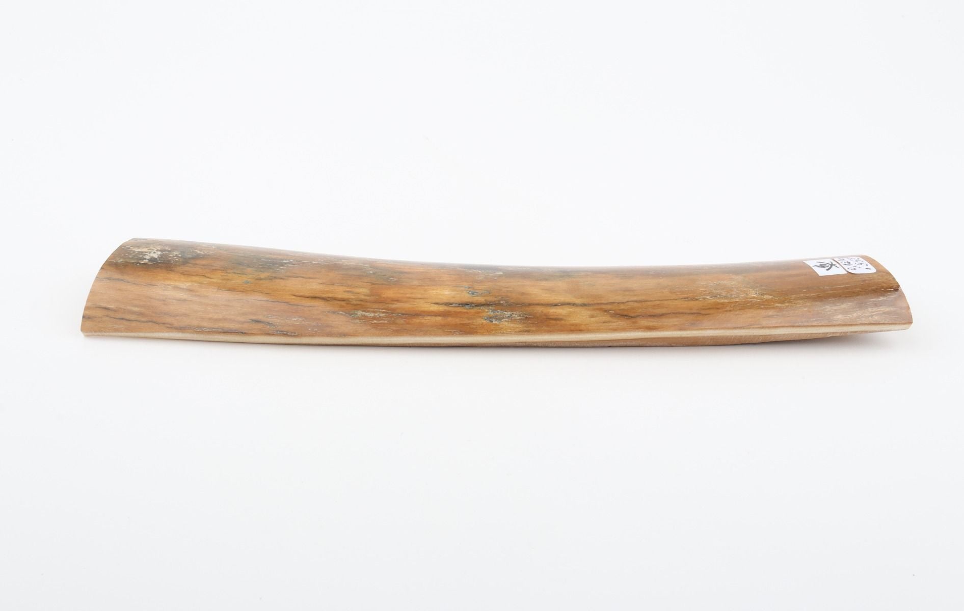 This is a top-quality piece of Siberian woolly mammoth bark (Mammuthus primigenius). The ivory is rock-solid without cracks. One cross-cut section is wider than the other. Consistent thickness with reserves on both ends. The colour of the bark is beige.