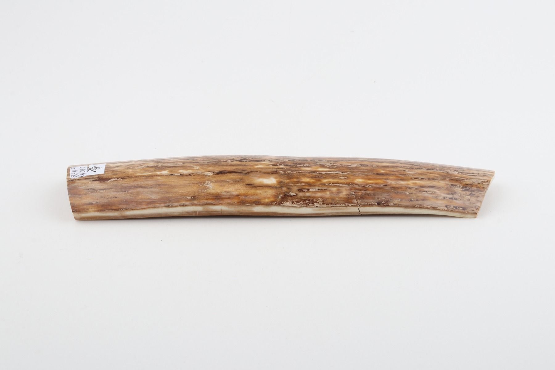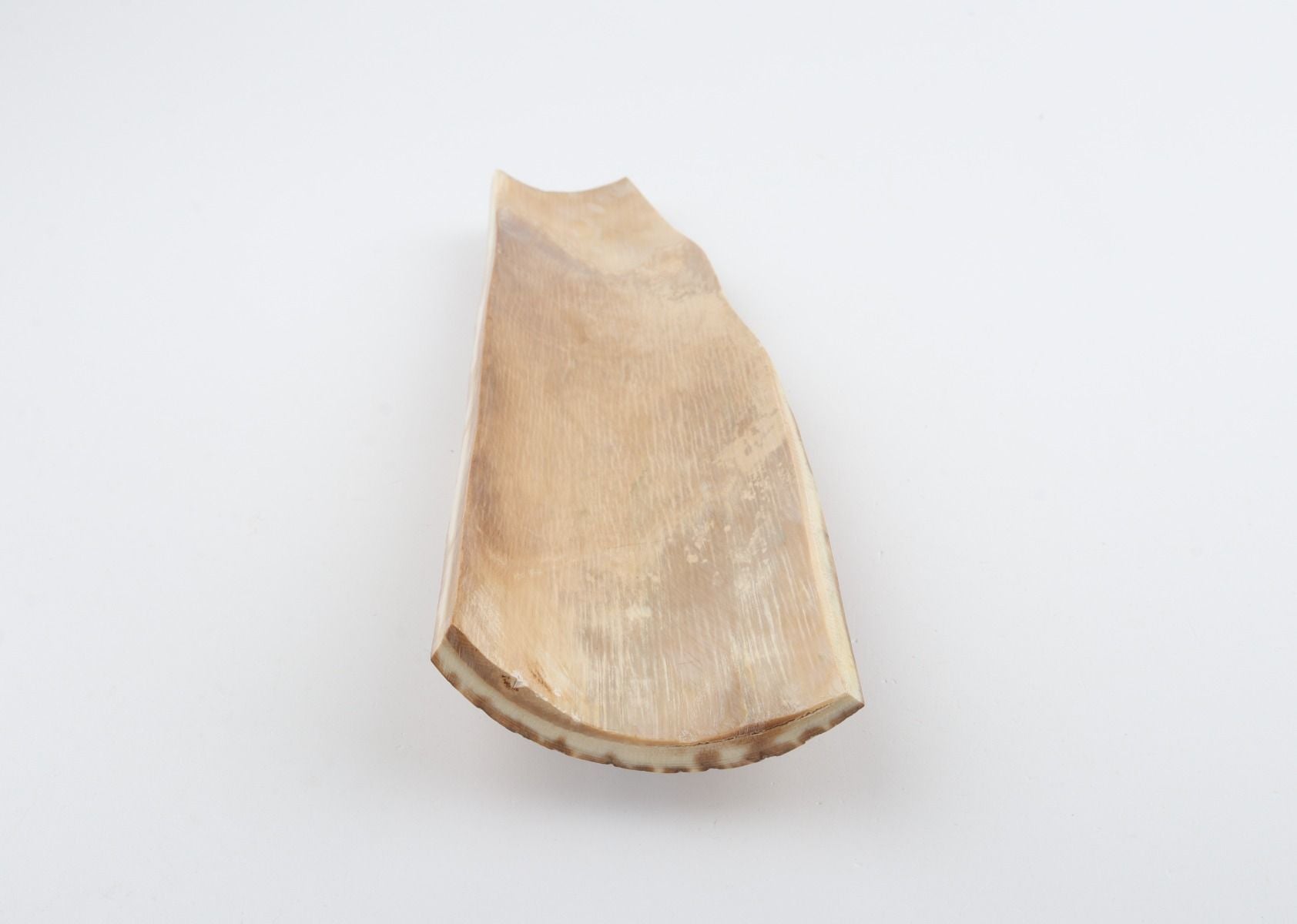 This is a top-quality piece of Siberian woolly mammoth bark (Mammuthus primigenius). The ivory is rock-solid despite one small crack on one side. One cross-cut section is thinner and narrower than the other. Reserves on both ends. This piece was cut at an angle - please carefully look at the pictures for precise dimensions. The colour of the bark is beige.
