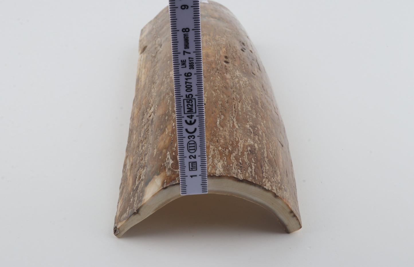 This is a top-quality piece of Siberian woolly mammoth bark (Mammuthus primigenius). The ivory is rock-solid without cracks. One cross-cut section is slightly wider than the other. Consistent thickness with reserves on both ends. The colour of the bark is beige.