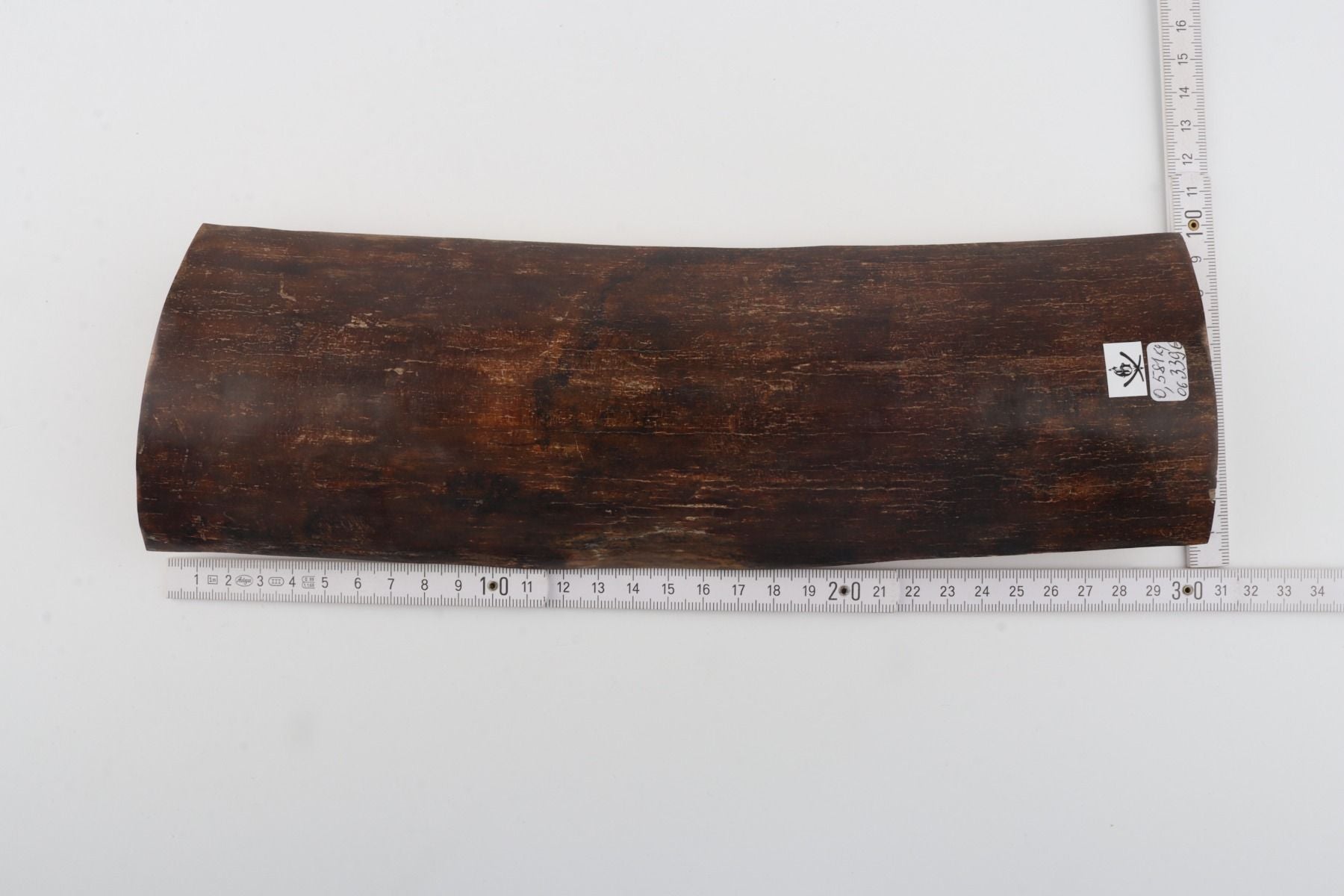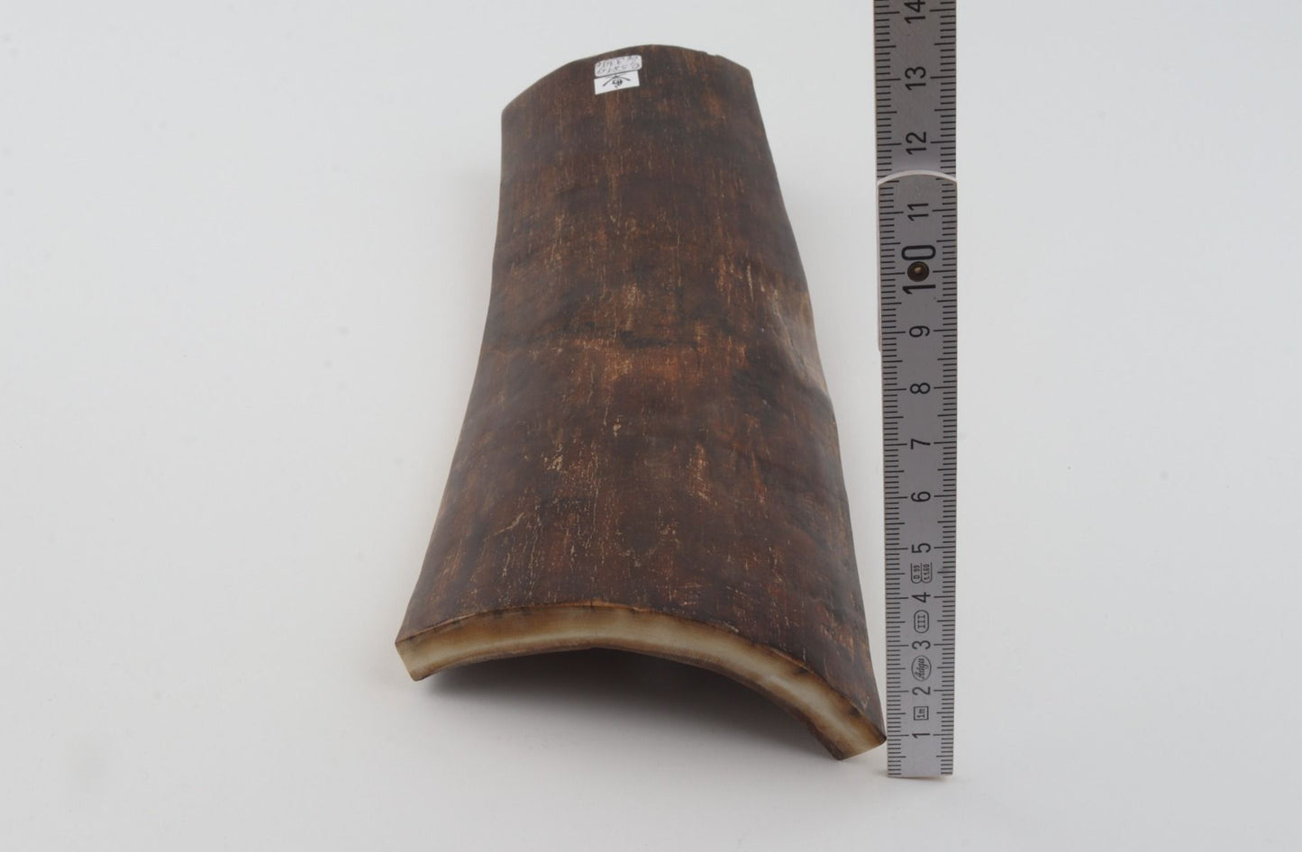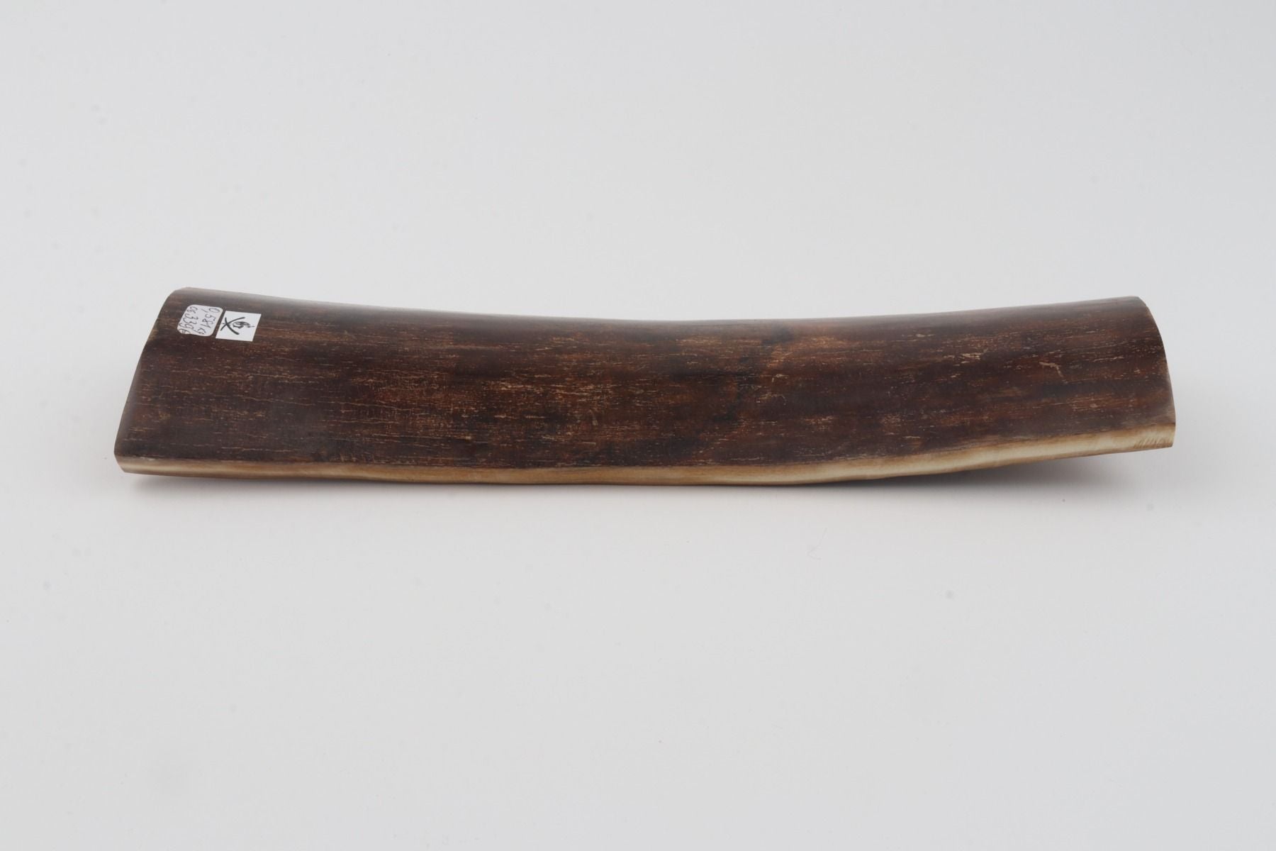 This is a top-quality piece of Siberian woolly mammoth bark (Mammuthus primigenius). The ivory is rock-solid without cracks. One cross-cut section is slightly thicker than the other. Consistent width with reserves on both ends. The colour of the bark is brown.