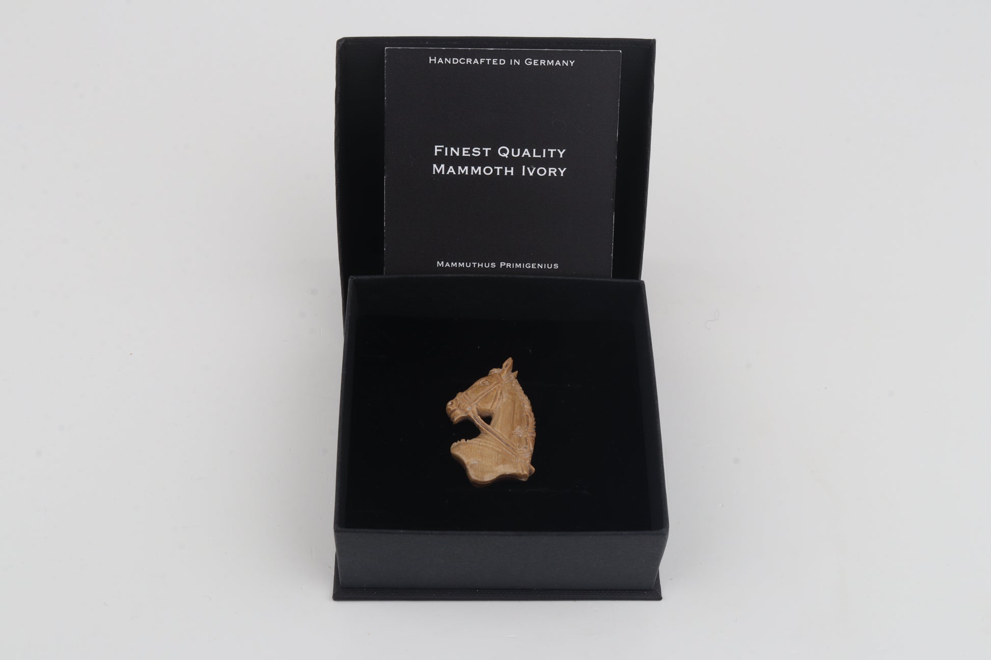 This distinctive brooch features a finely carved horse head sculpted from mammoth ivory (Mammuthus primigenius). The carving highlights the strength and elegance of the horse.