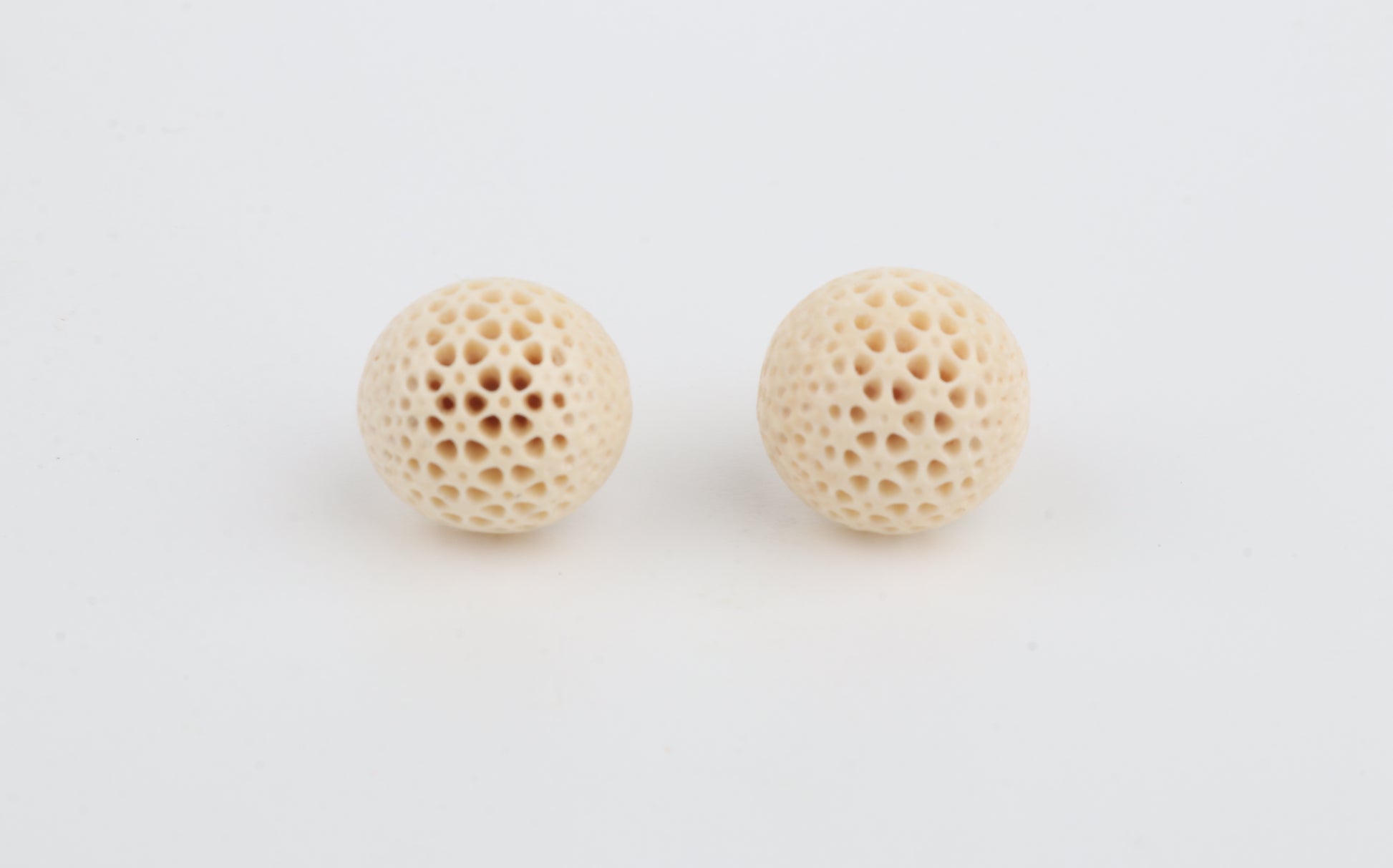 These distinctive stud earrings from mammoth ivory (Mammuthus primigenius) are carved to reveal the natural structure and character of this prehistoric material. The subtle carving and organic surface give the earrings a unique appearance.