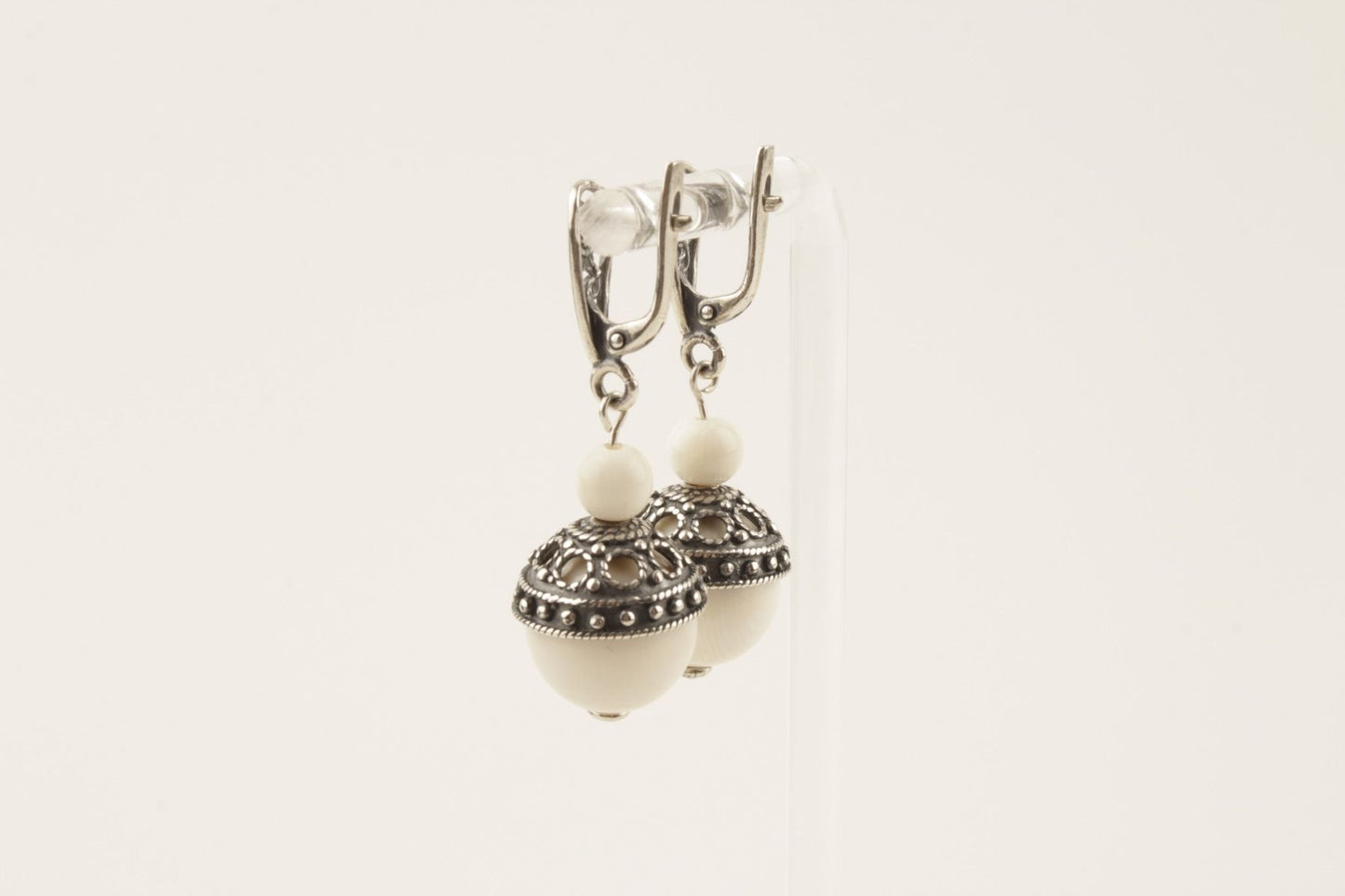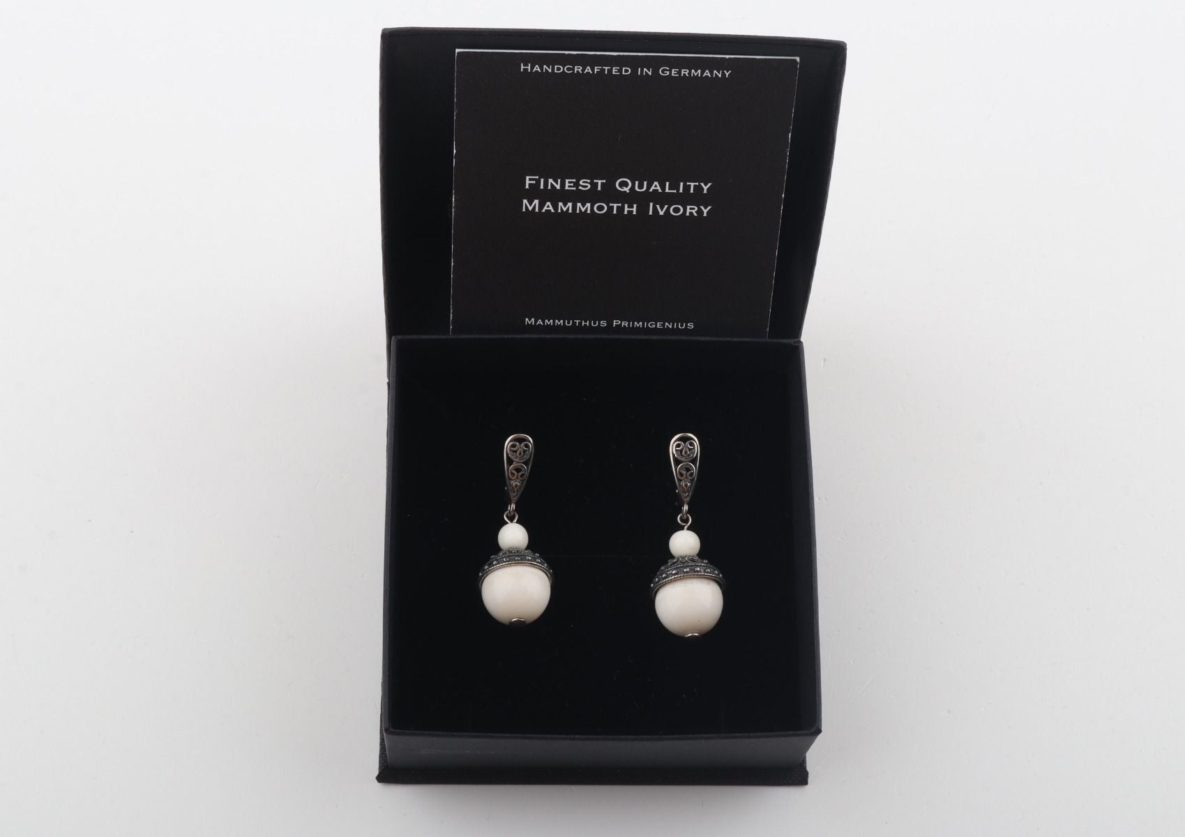 These lever-back earrings feature precious fossil mammoth ivory (Mammuthus primigenius), aged over 10,000 years, connecting you to a time long past. Enhancing the beauty of the mammoth ivory, sterling silver filigree elements gracefully frame the earrings, adding a touch of elegance and sophistication.
