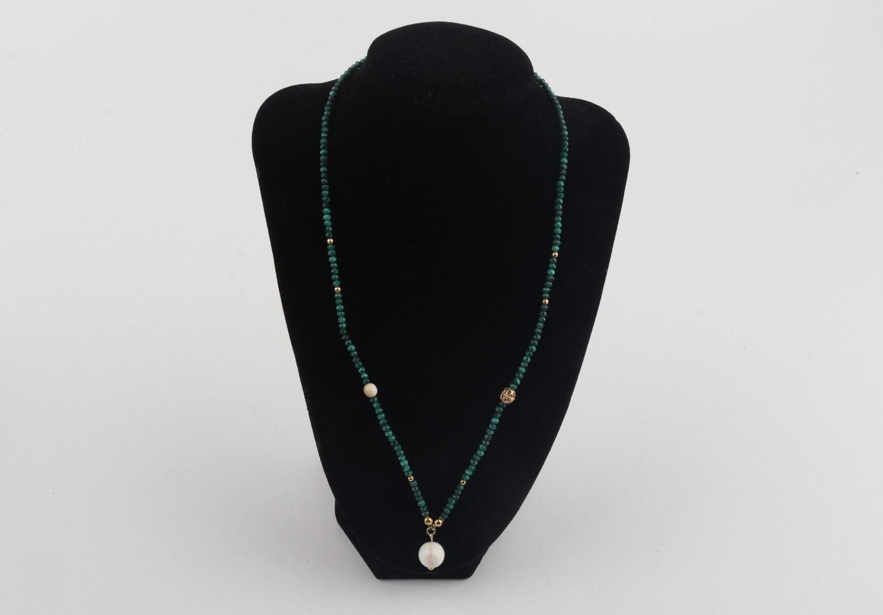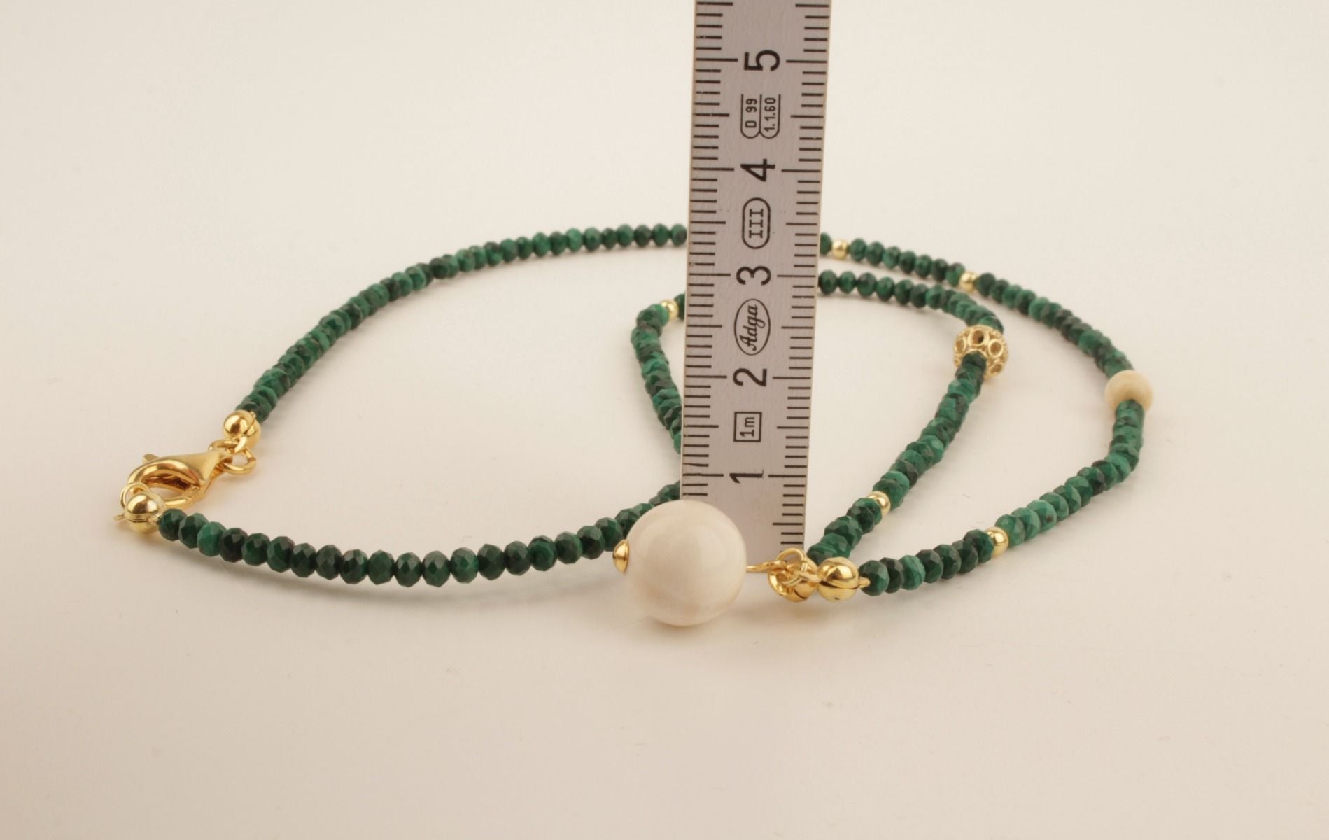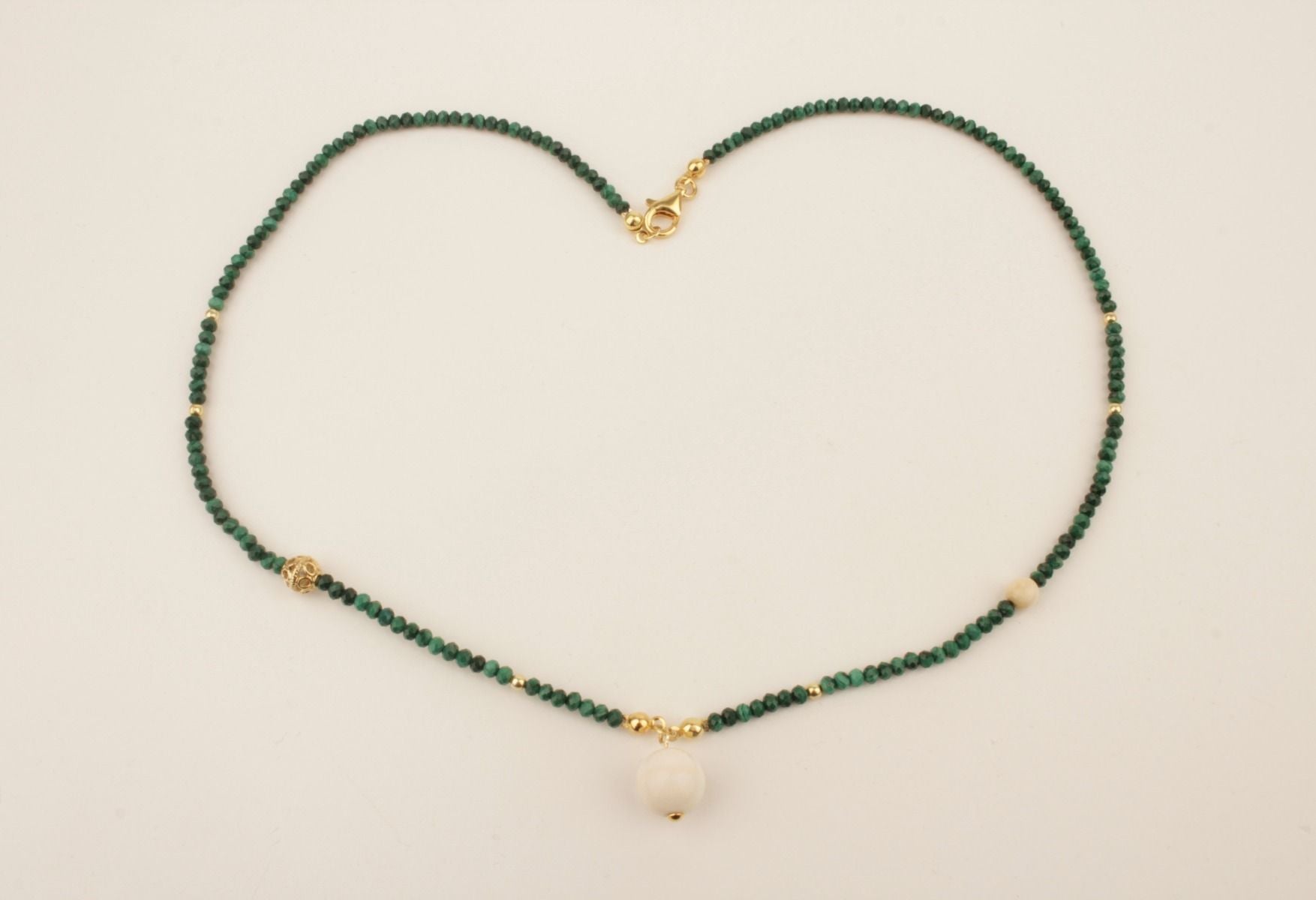 The mammoth ivory centrepiece tells a story of history and natural beauty. Paired with faceted malachite beads, each exhibiting rich green hues, this necklace radiates vibrancy and sophistication.