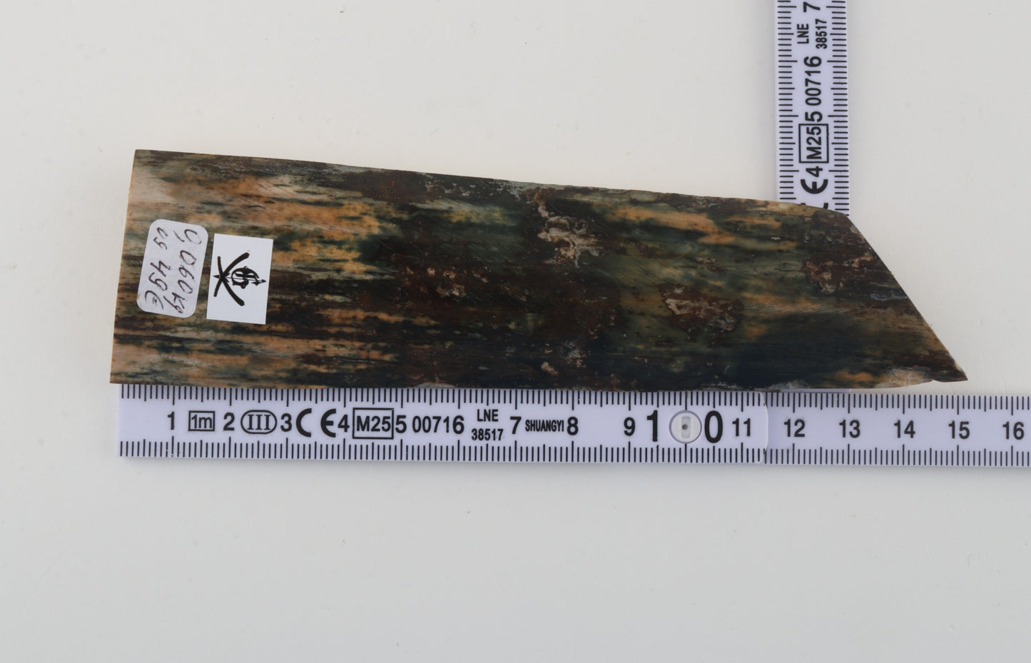 This is a top-quality piece of Siberian woolly mammoth bark (Mammuthus primigenius). The ivory is rock-solid without cracks. One cross-cut section is thicker and wider than the other. Reserves on both ends. Please carefully look at the pictures for precise dimensions. The colour of the bark is green.