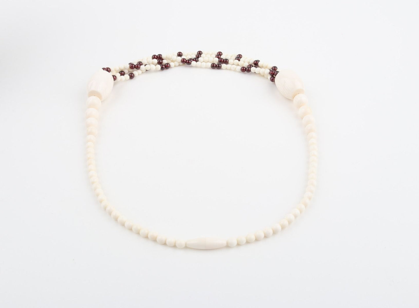 This necklace is a captivating fusion of historic material and gemstone luxury. Two large, sculpted beads of mammoth ivory (Mammuthus primigenius), creamy and full of ancient earth’s whispers, anchor the piece symmetrically on both sides. These beads frame a cascade of smaller garnet stones, whose deep reds and burgundy shades weave through the necklace, intertwining with the occasional ivory bead, creating an opulent multi-strand effect.