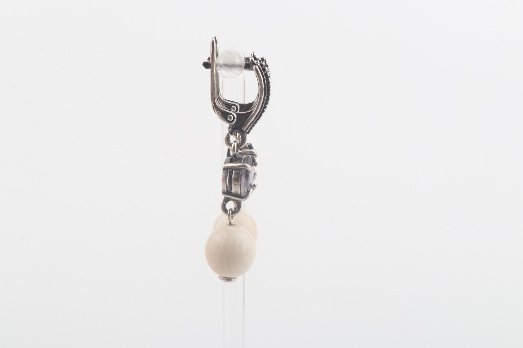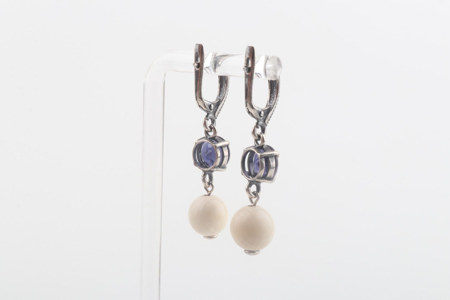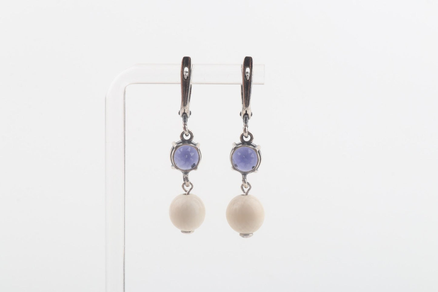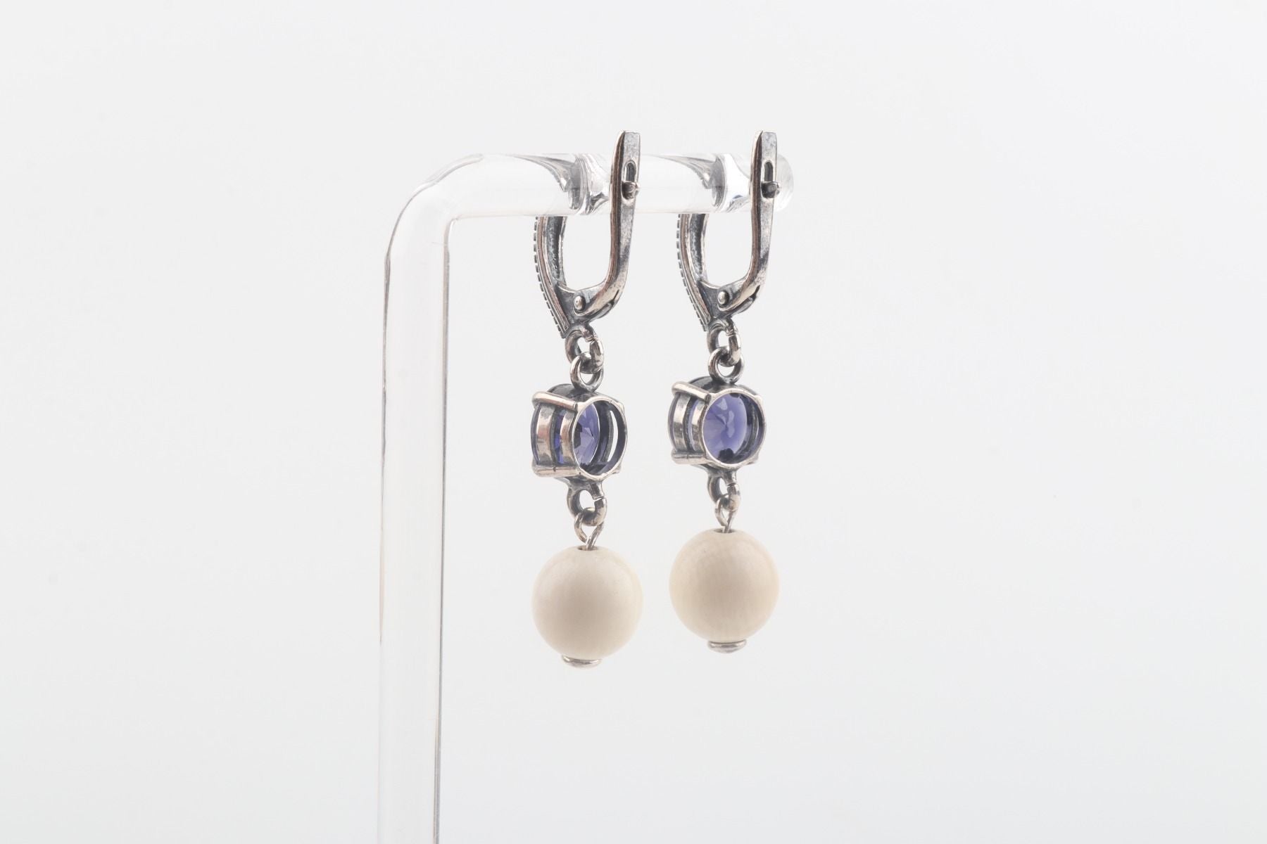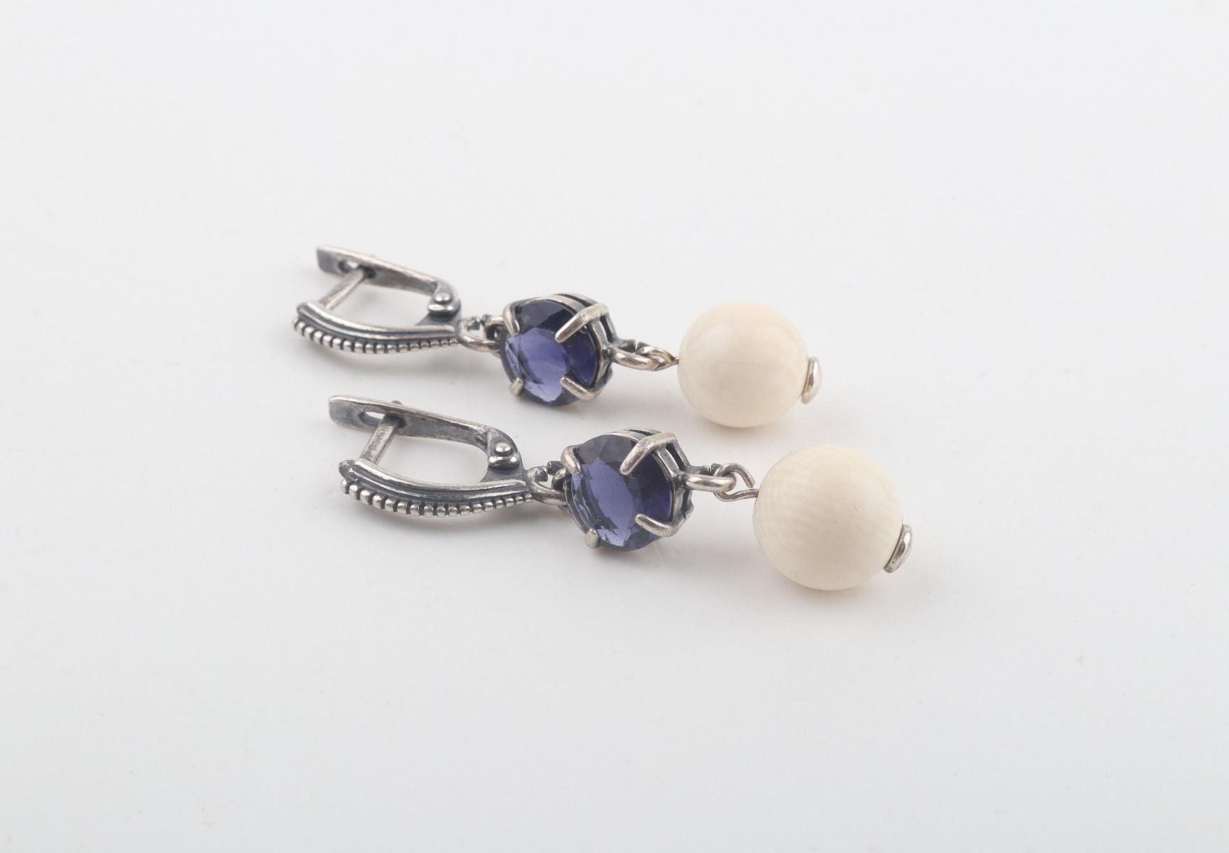 They feature 9 mm mammoth ivory beads (Mammuthus primigenius), which are over 10,000 years old and provide a piece of history to the design. Paired with faceted 8 mm iolite, the result is a beautiful and harmonious combination of natural elements.