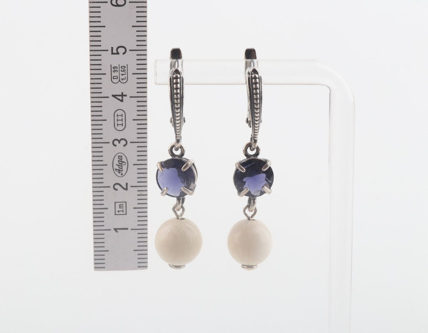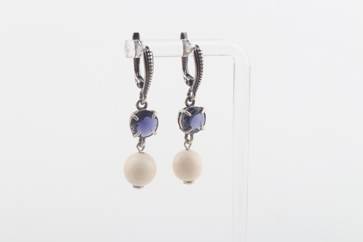 The deep blue tones of the iolite complement the warm ivory tones of the mammoth ivory beads, creating a striking and eye-catching contrast. These earrings are sure to turn heads and make a statement.