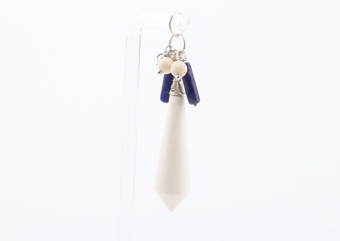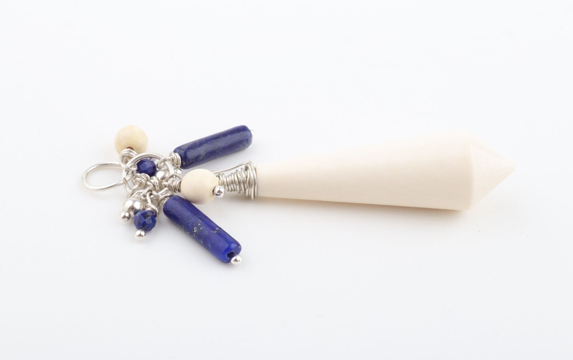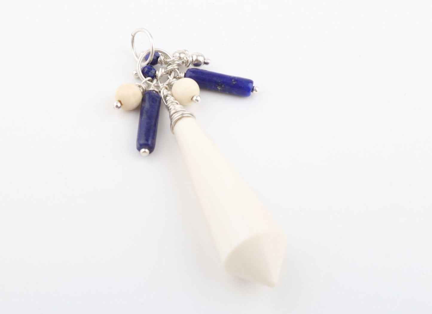 The addition of lapis lazuli stones brings a striking burst of deep blue to the pendant. Lapis lazuli is known for its rich colour and historical significance as a symbol of wisdom and truth. Combined with the smooth, elongated ivory pendant, these stones create a captivating contrast that enhances the overall design. The sterling silver details provide a modern touch, blending seamlessly with the natural elements to create a pendant that is both timeless and versatile.