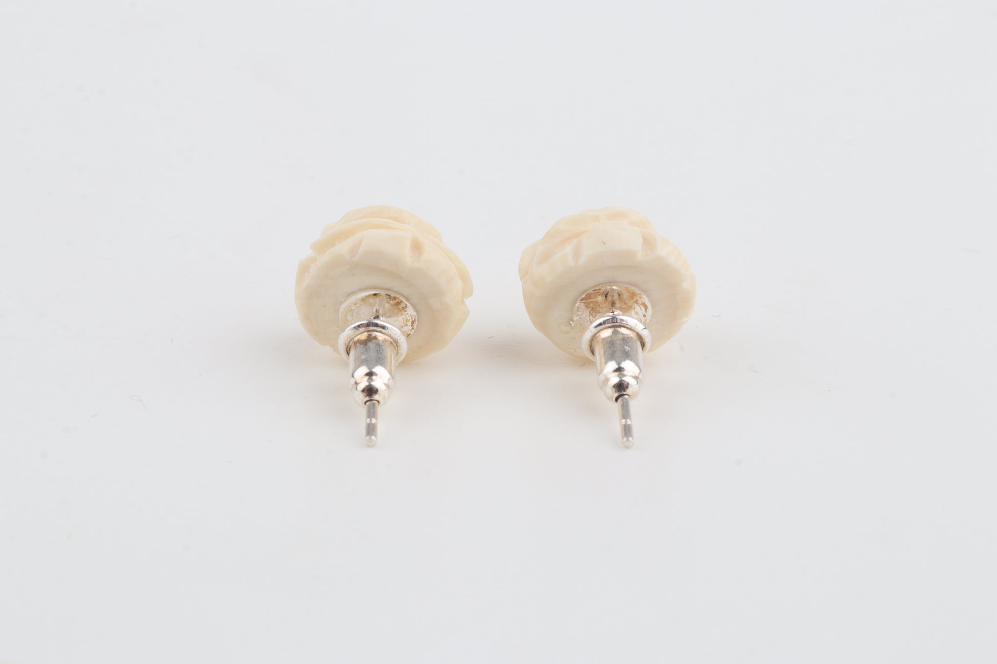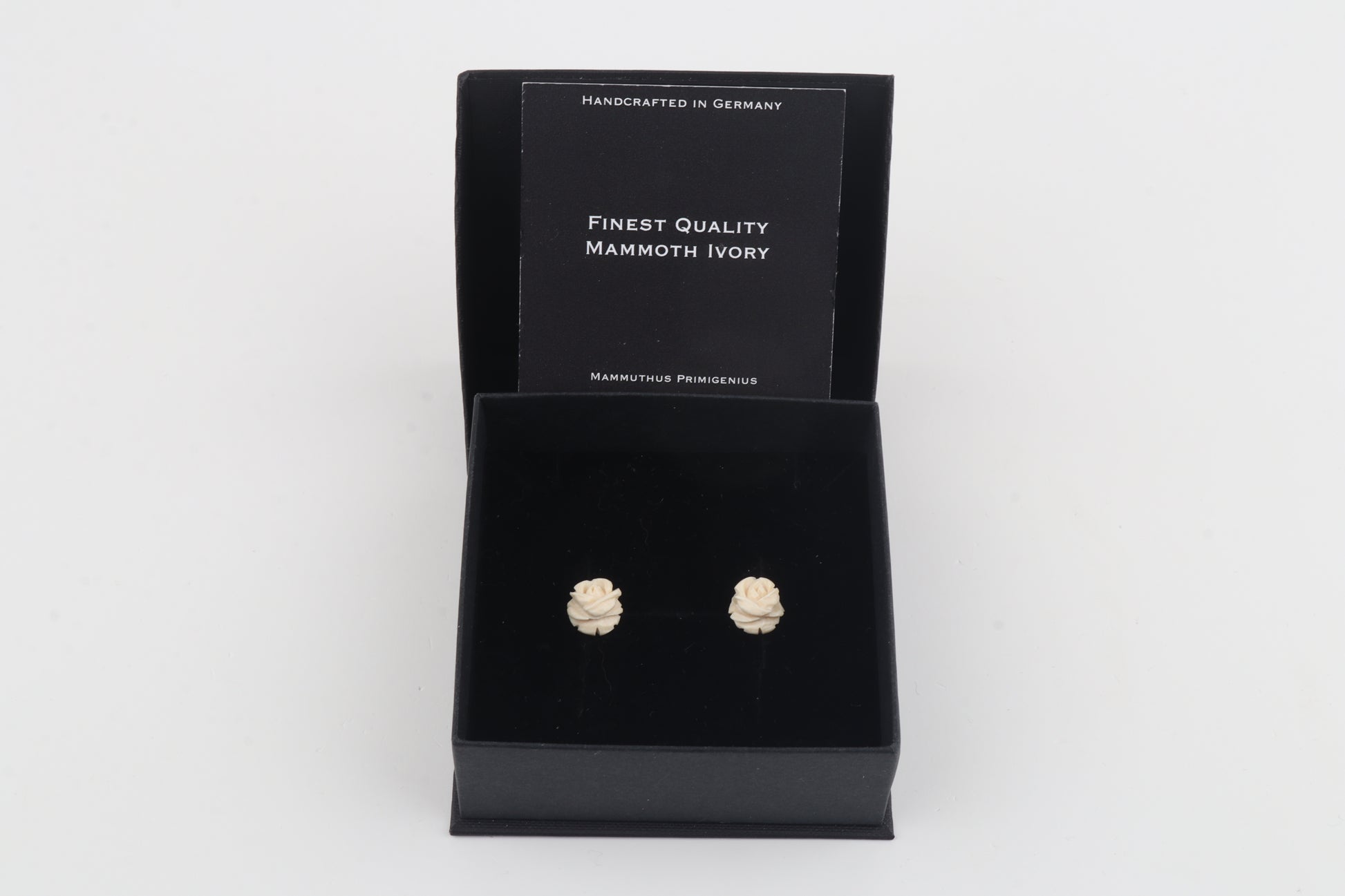 These delicate stud earrings feature miniature roses carved from genuine mammoth ivory (Mammuthus primigenius). Perfectly balanced in size, these earrings offer understated elegance and timeless charm, making them suitable for everyday wear while remaining distinctive and rare.