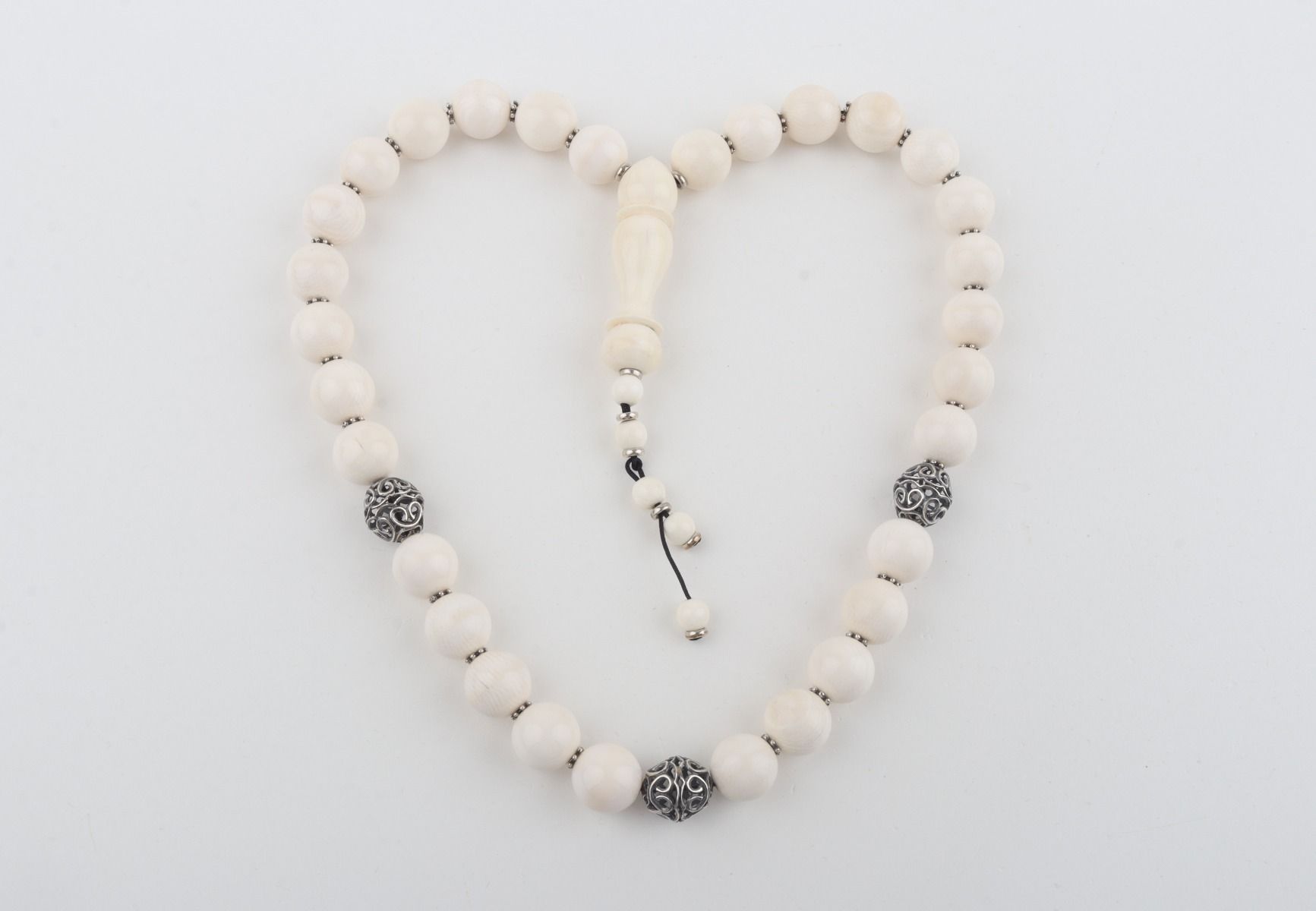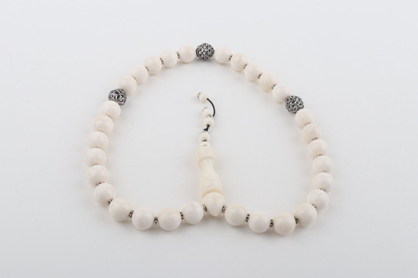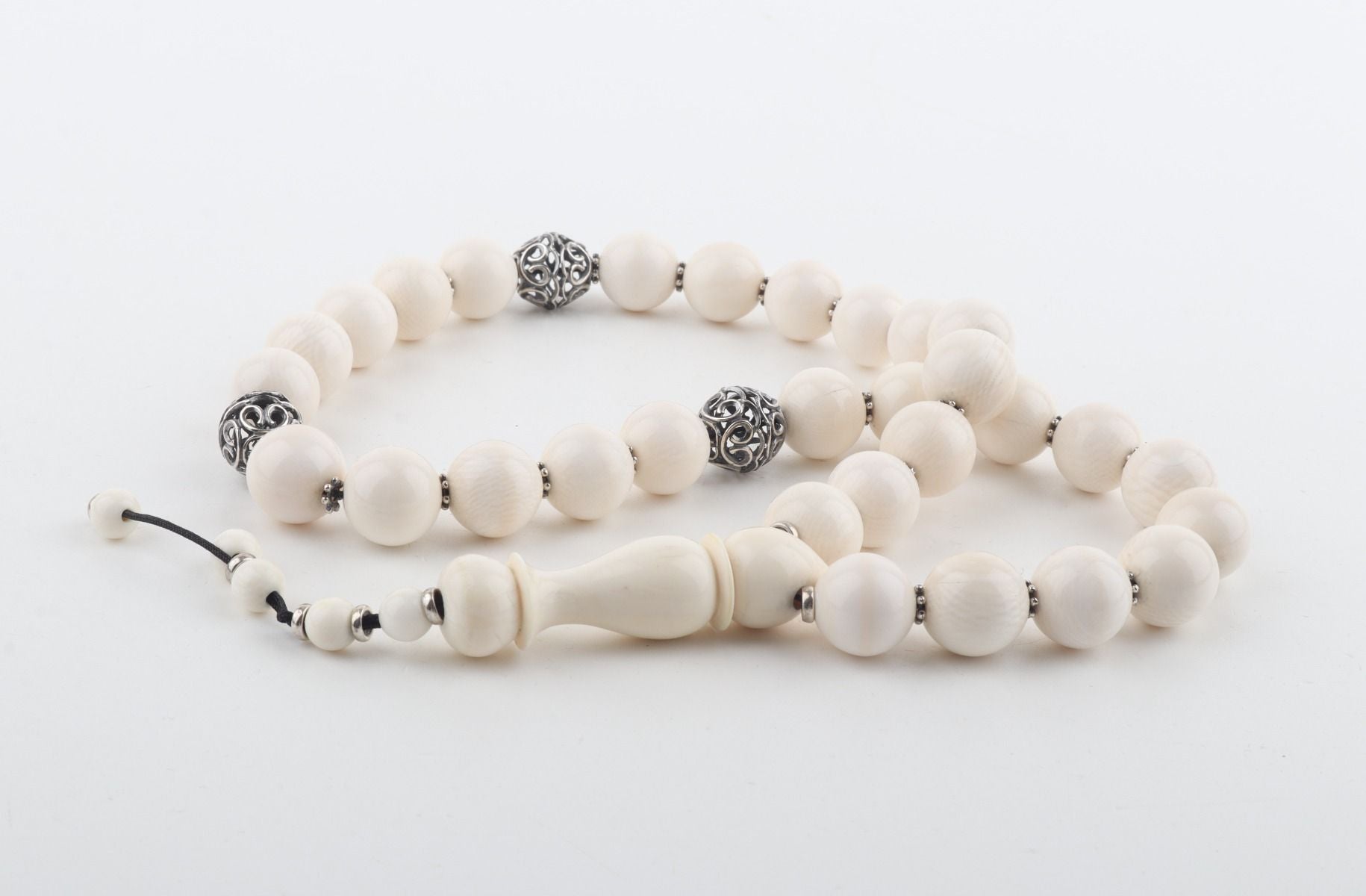 The 14 mm mammoth ivory beads are responsibly sourced, the silver accents add elegance, and the nylon stringing ensures longevity. Perfect for personal devotion or as a meaningful gift.