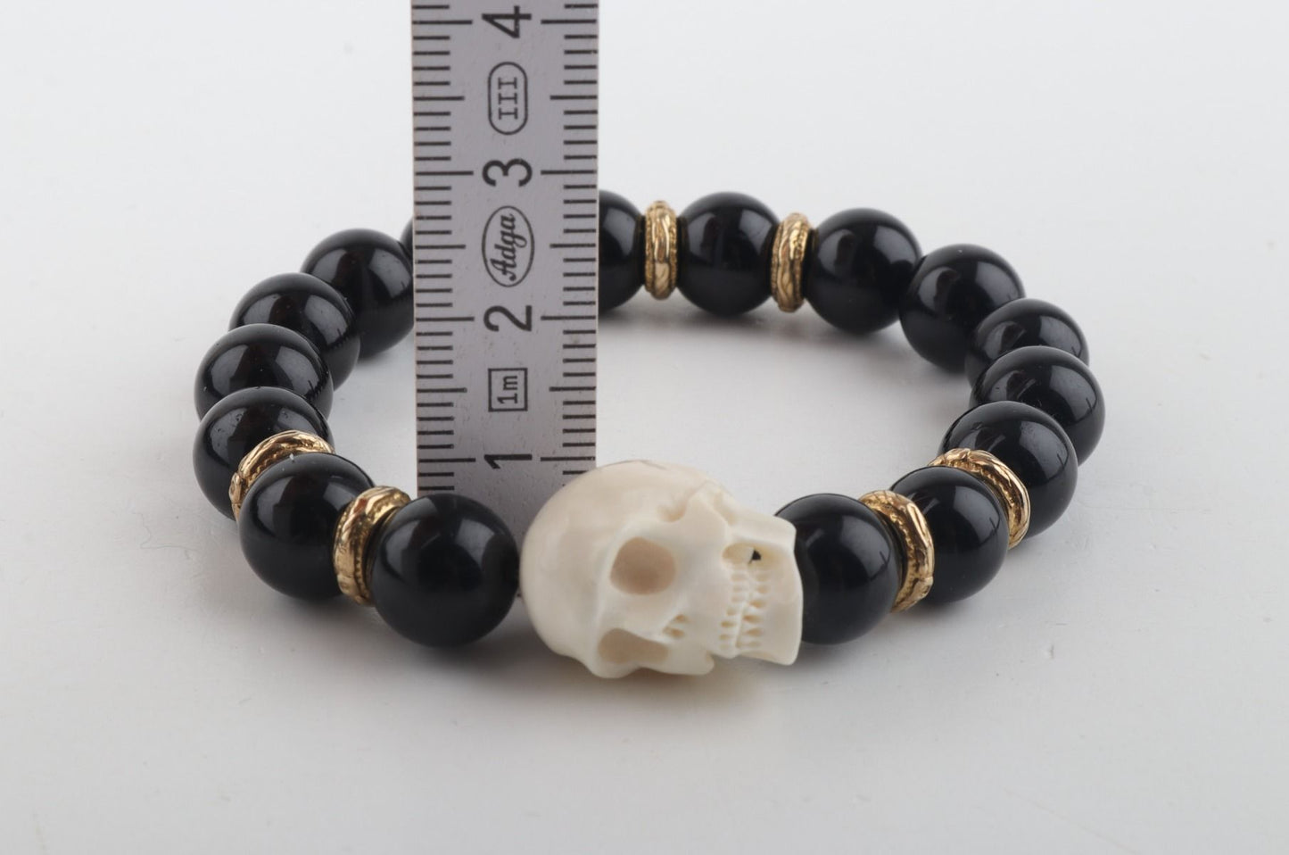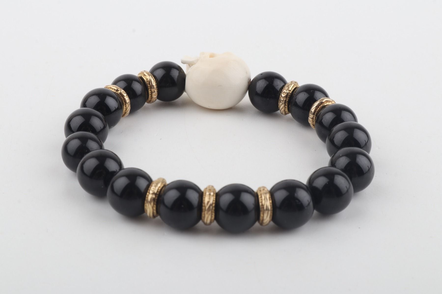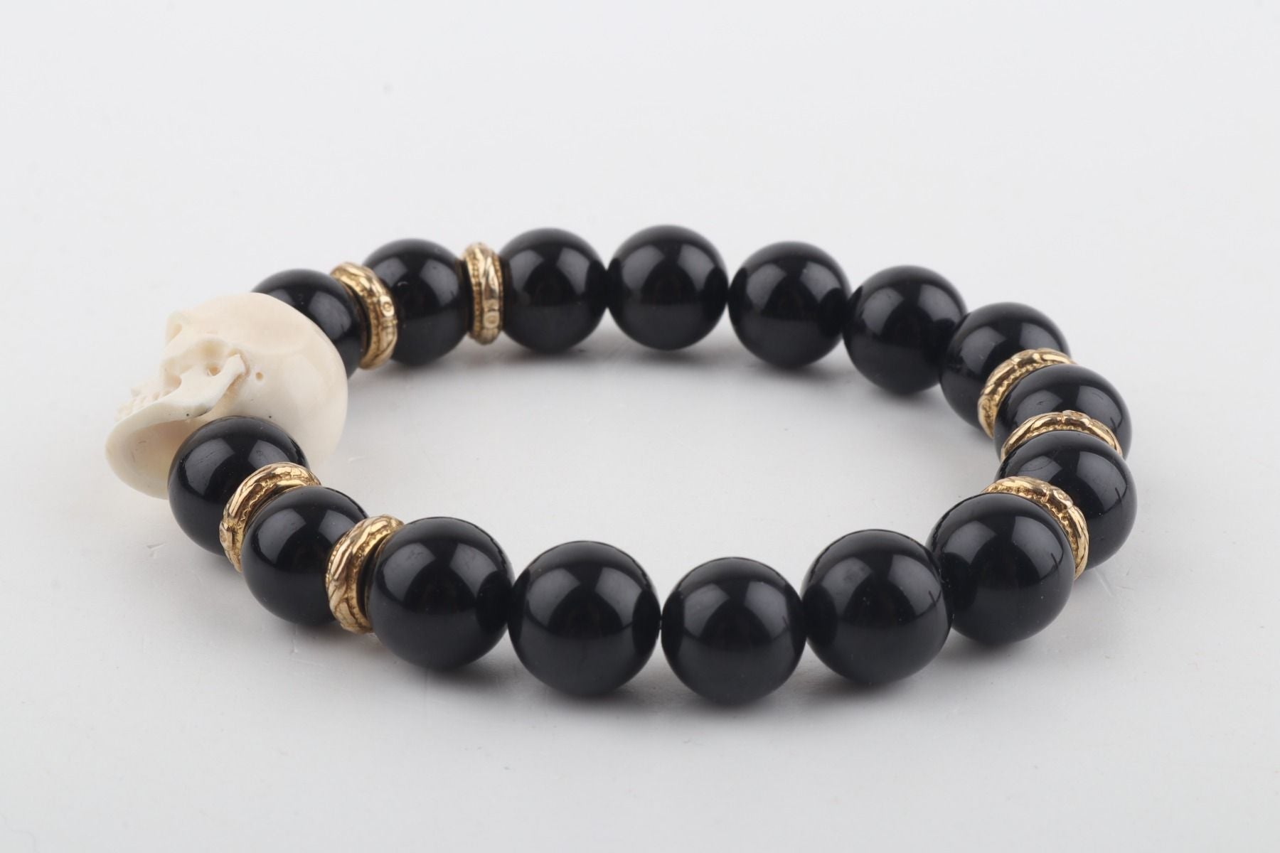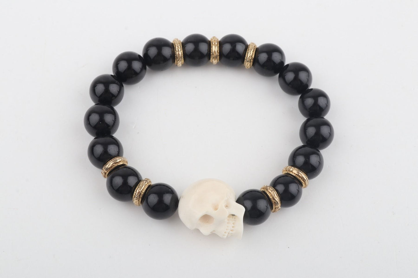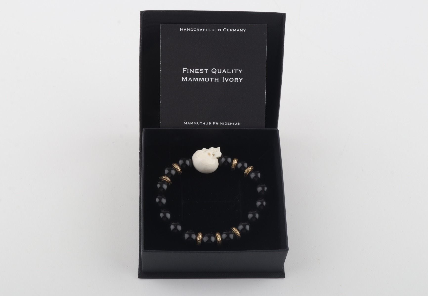 Unique hand-carved mammoth ivory skull (Mammuthus primigenius) is set in 10 mm black obsidian* pearls. 24K gold-plated sterling silver elements give this bracelet a very chic look.