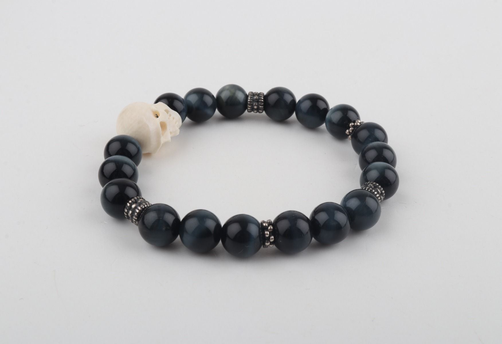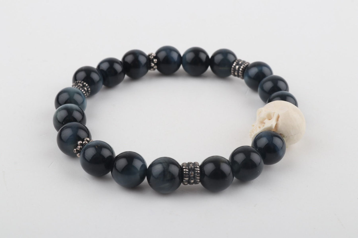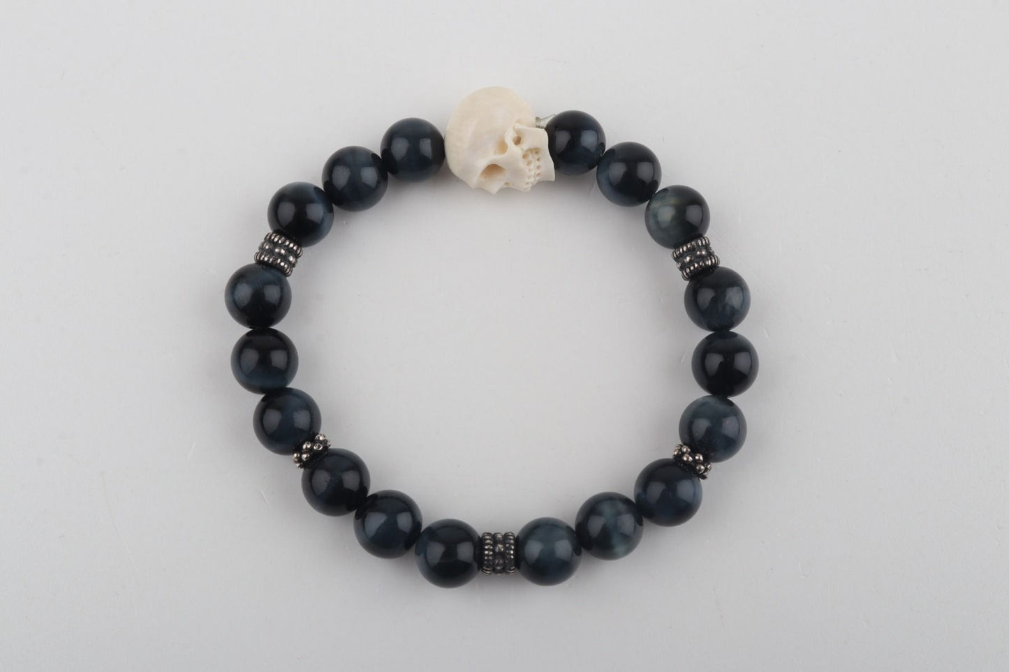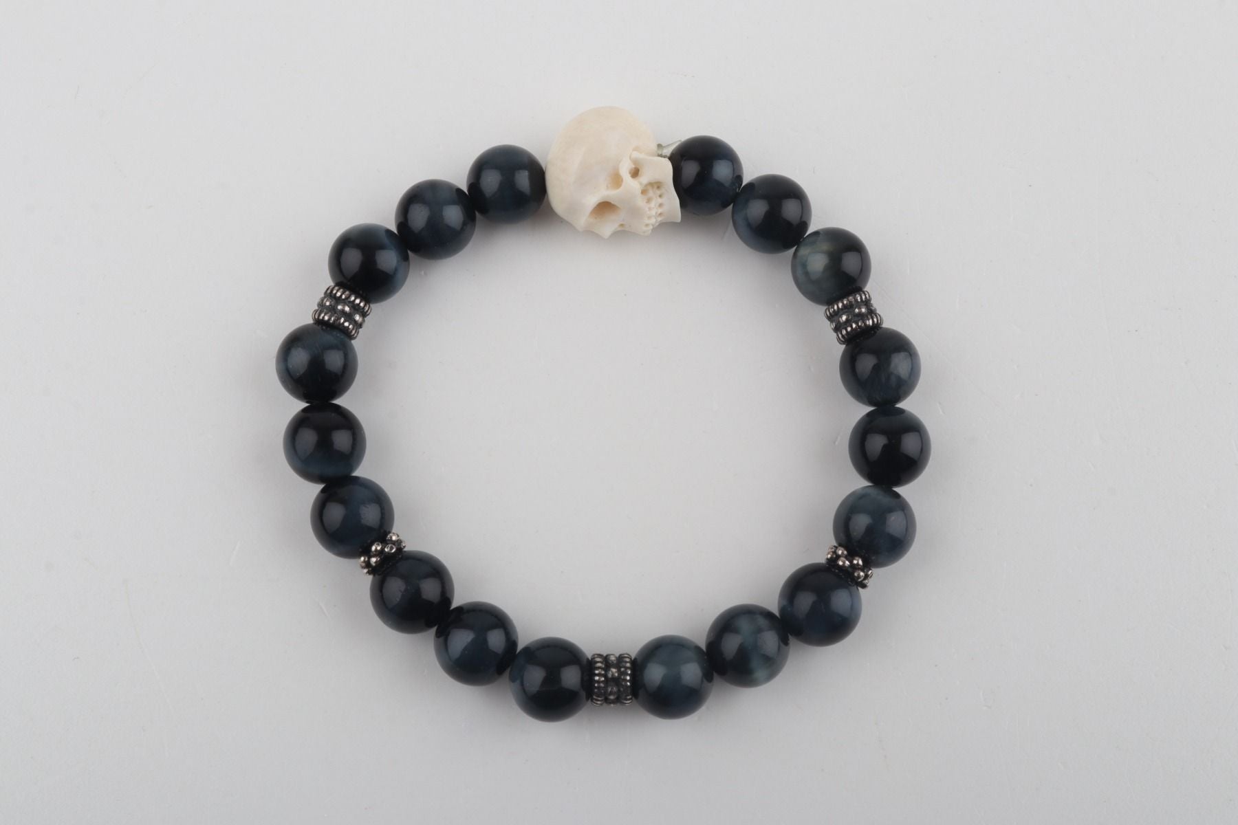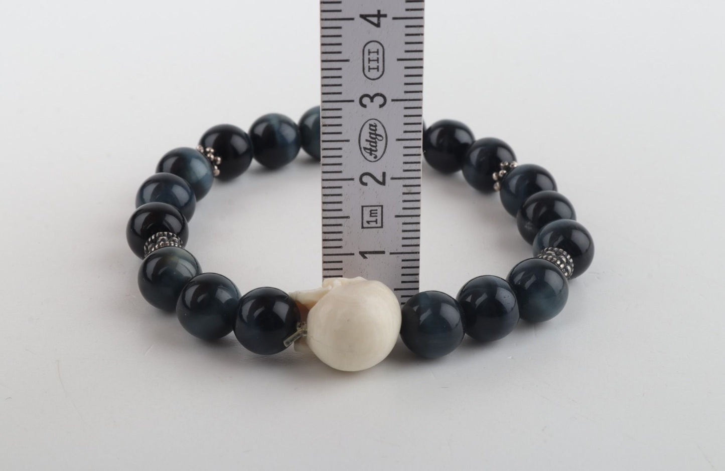 Unique hand-carved mammoth ivory skull (Mammuthus primigenius) is set in 10 mm blue tiger eye* pearls. Sterling silver elements give this bracelet an interesting, finished look.