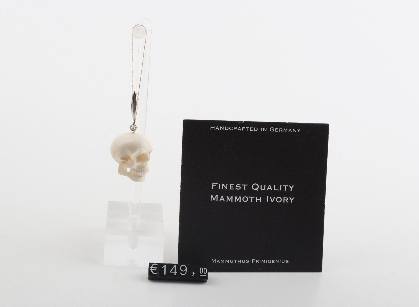 Make a bold artistic statement with this intricately crafted skull pendant made from fossil mammoth ivory (Mammuthus primigenius). This piece showcases meticulous attention to detail, capturing the realistic anatomy of the skull with exceptional precision.