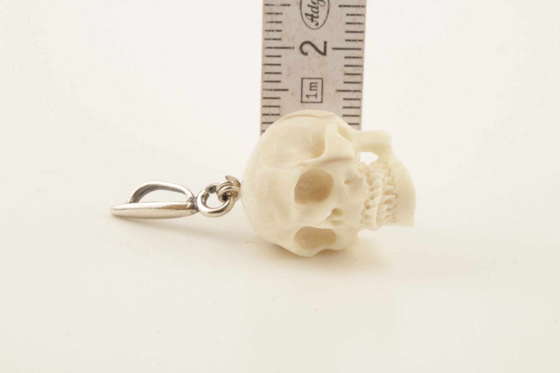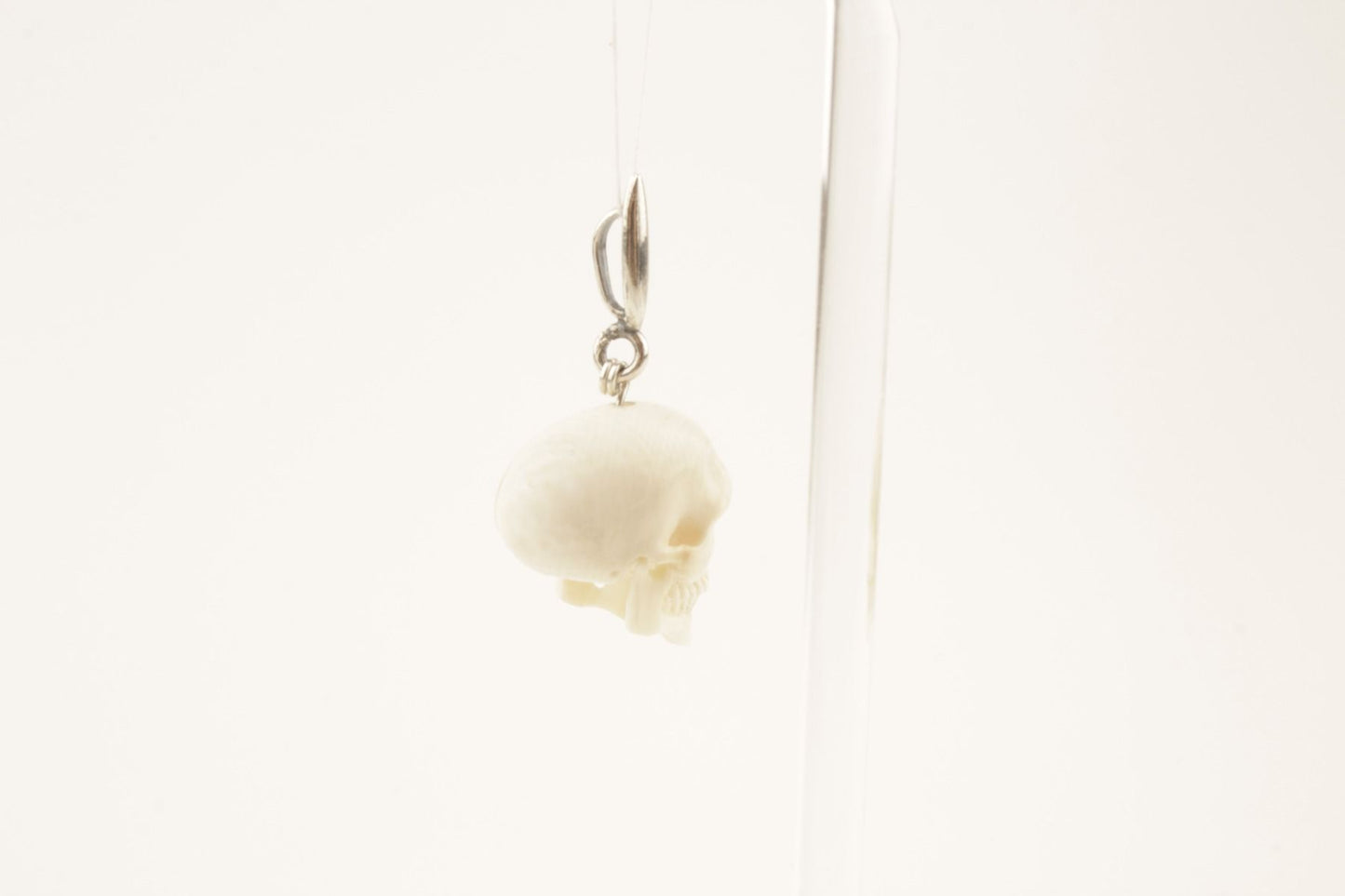 A hand-carved skull made of mammoth ivory (Mammuthus primigenius) is set in sleek blackened sterling silver. Each skull is unique, which makes this pendant one-of-a-kind. Unusual yet very expensive look that will never go out of fashion.