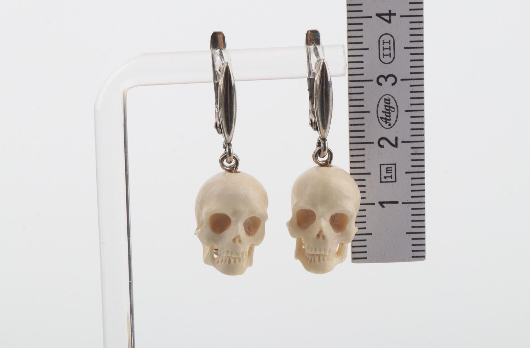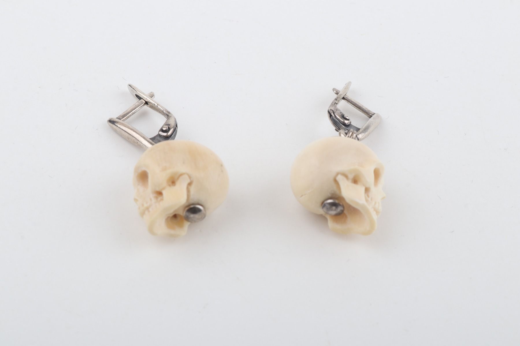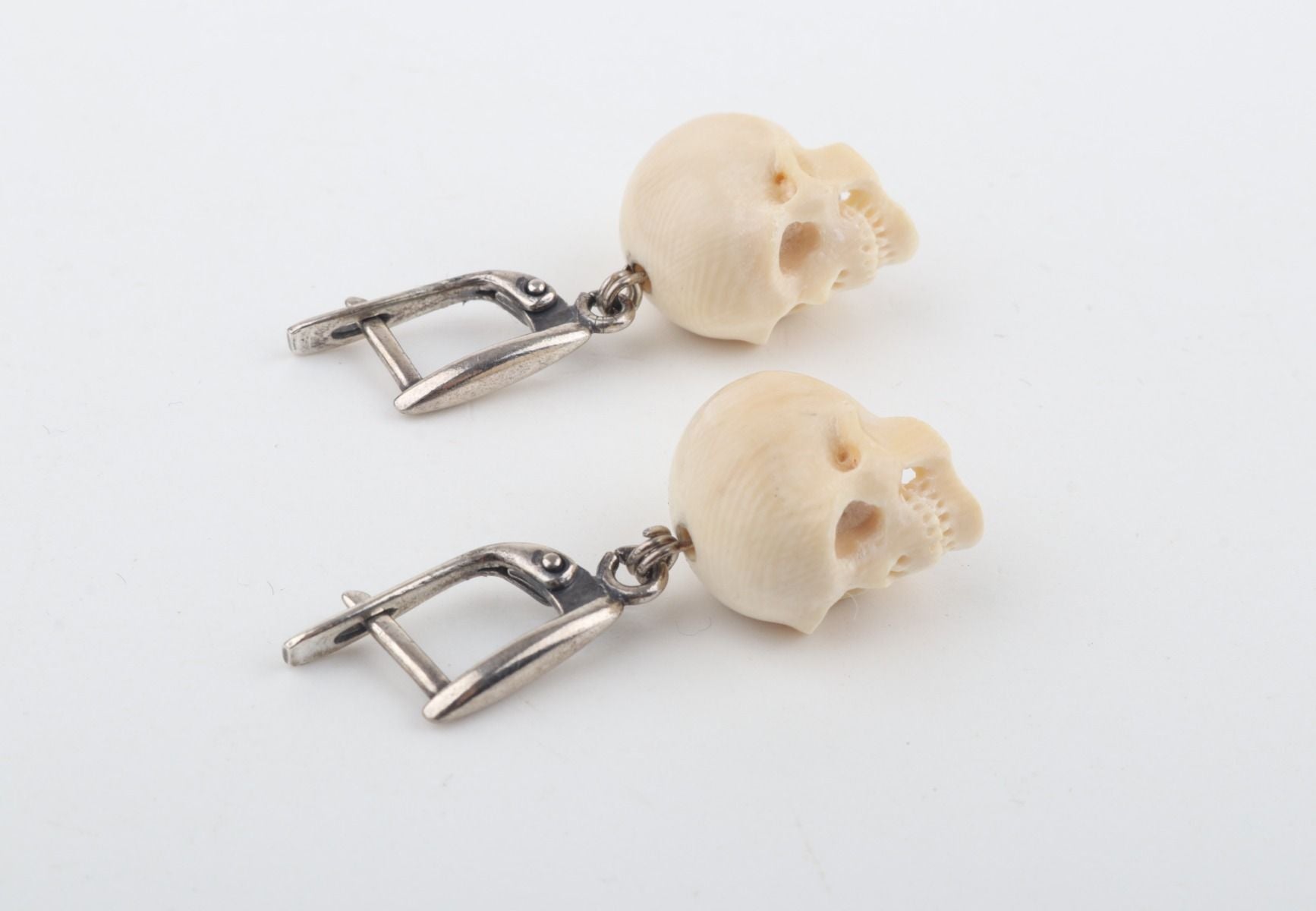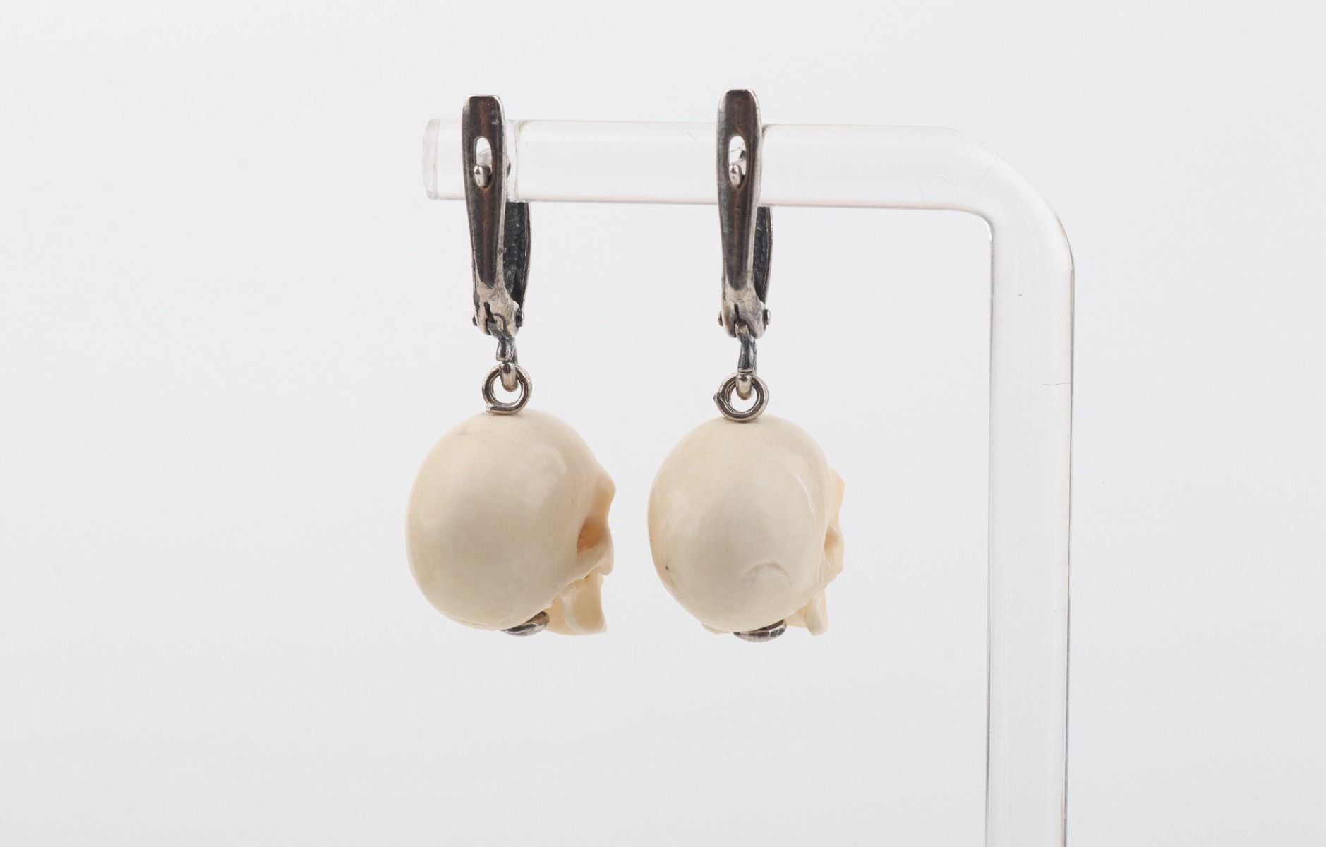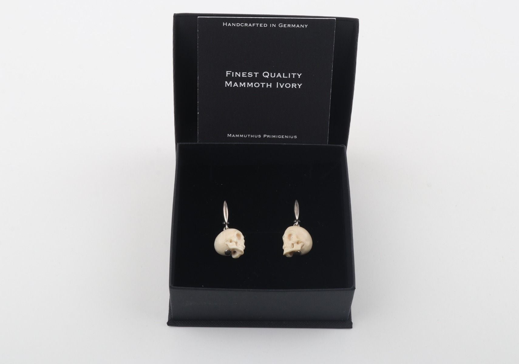 These lever-back earrings feature delicately hand-carved skulls crafted from authentic mammoth ivory (Mammuthus primigenius), a material dating back over 10,000 years. Dangling gracefully from sterling silver hooks, these earrings celebrate nature's wonders and artistic expression. Embrace the allure of the past with these exquisite earrings, a cherished symbol of unique style and rich history.
