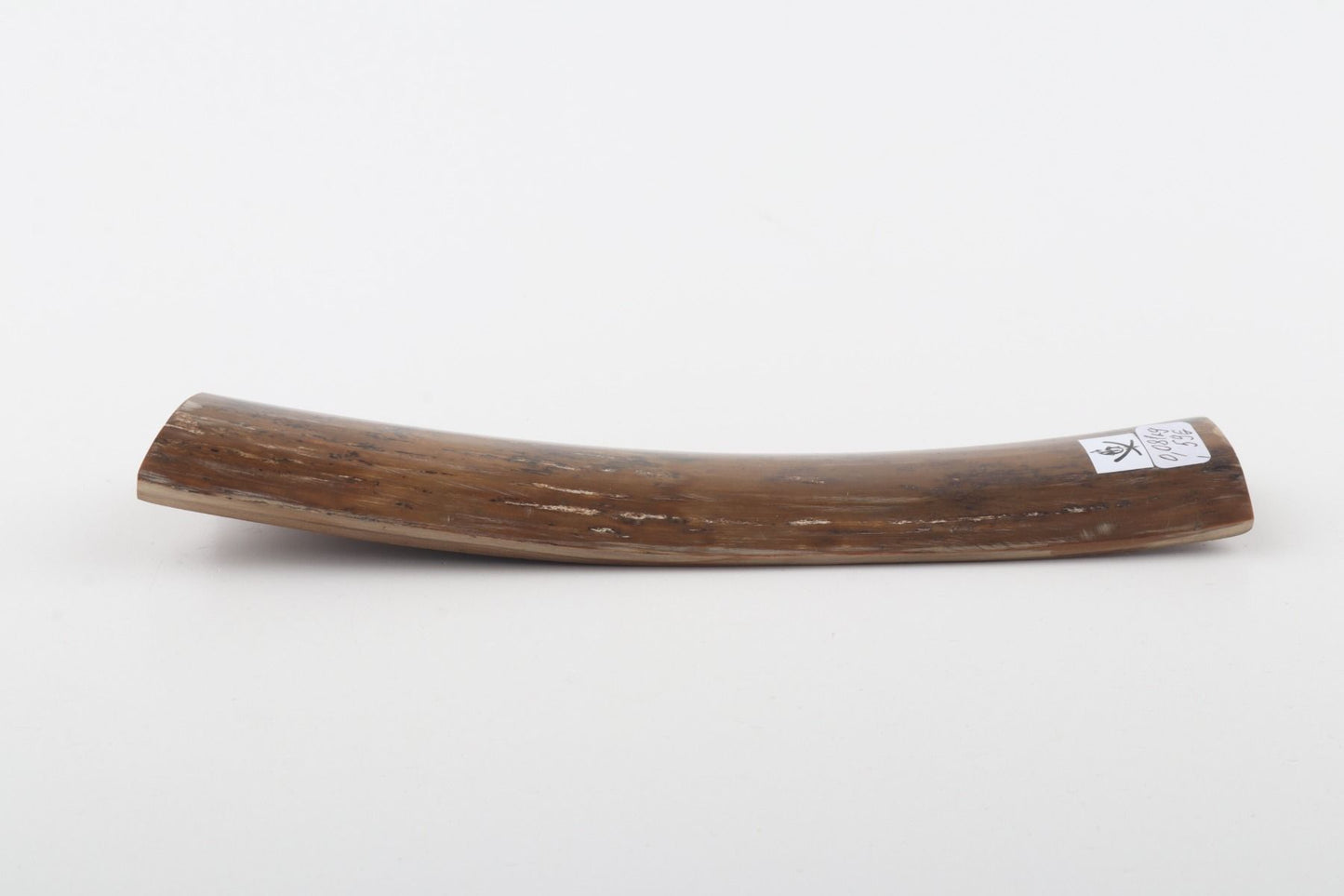 This is a top-quality piece of Siberian woolly mammoth bark (Mammuthus primigenius). The ivory is rock-solid without cracks. One cross-cut section is wider than the other. Consistent thickness with reserves on both ends. The colour of the bark is mustard.