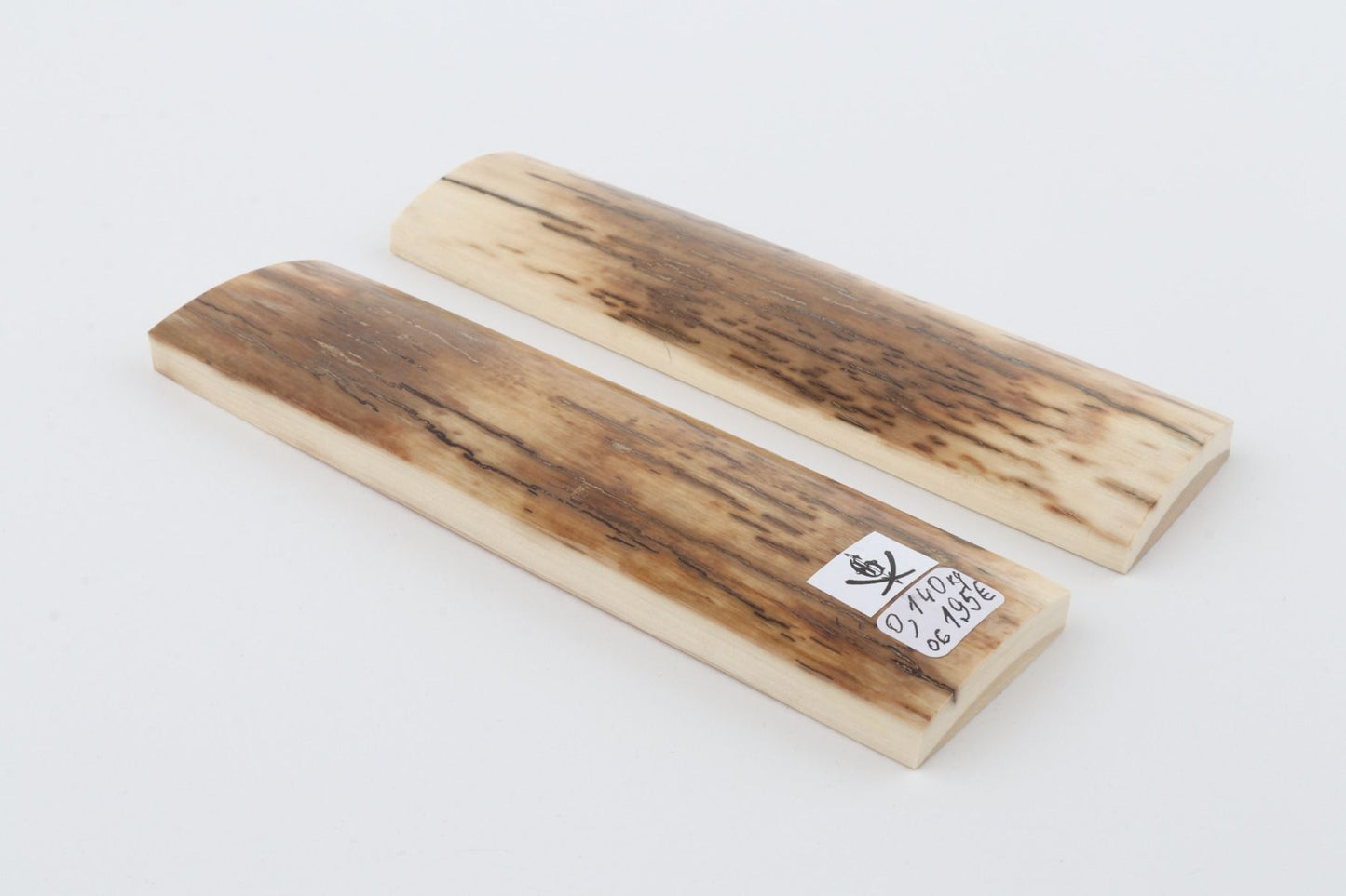 This is a pre-cut pair of natural woolly mammoth bark scales (Mammuthus primigenius). These scales are in a top-quality condition. Consistent width and thickness with reserves on both ends. The undersides are flat. The colour of the bark is beige.
