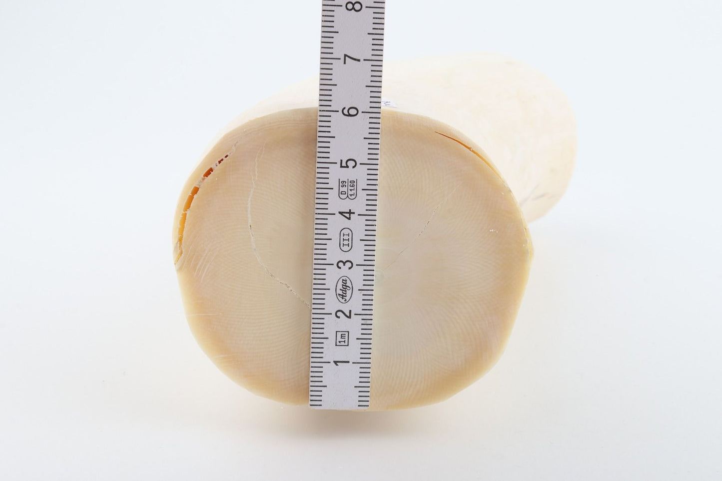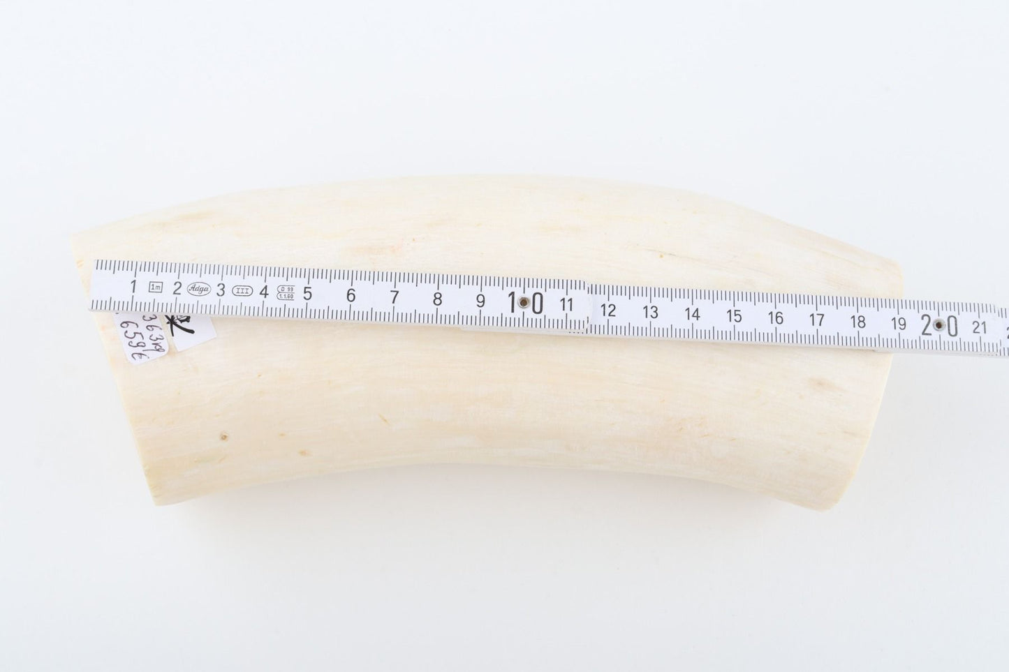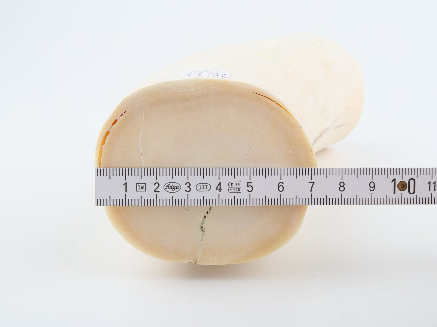 This is a top-quality piece of Siberian woolly mammoth ivory (Mammuthus primigenius). The ivory is rock-solid and completely dry. There are a few small, non-penetrating cracks. Plenty of reserves on both ends. One cross-cut section is slightly larger than the other. Please carefully look at the pictures for precise dimensions. The colour of the ivory is white.