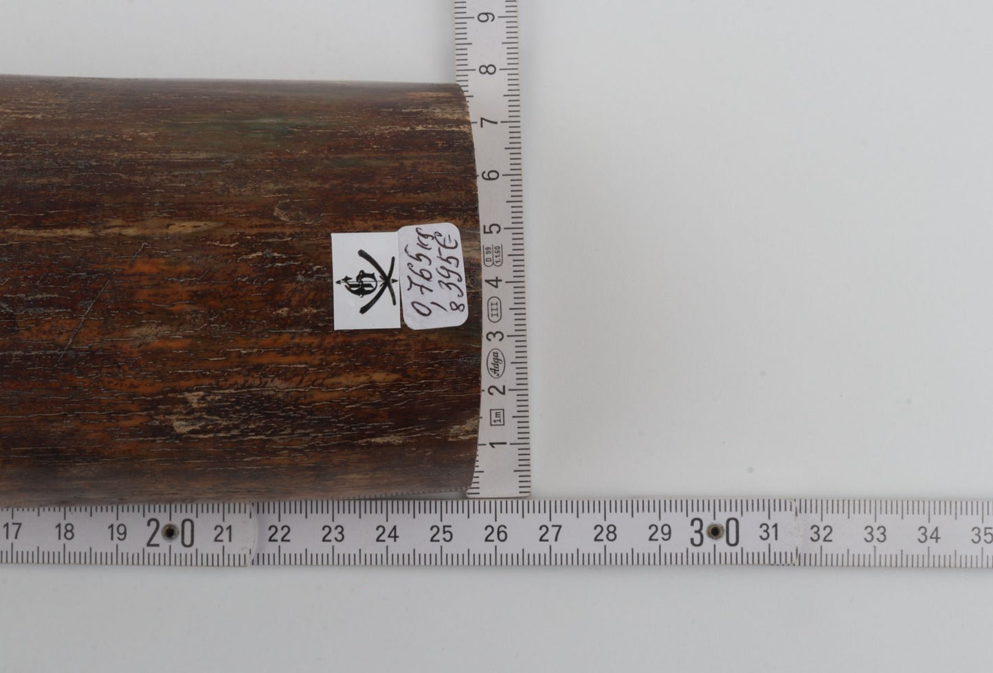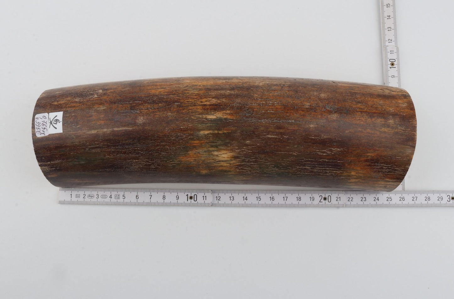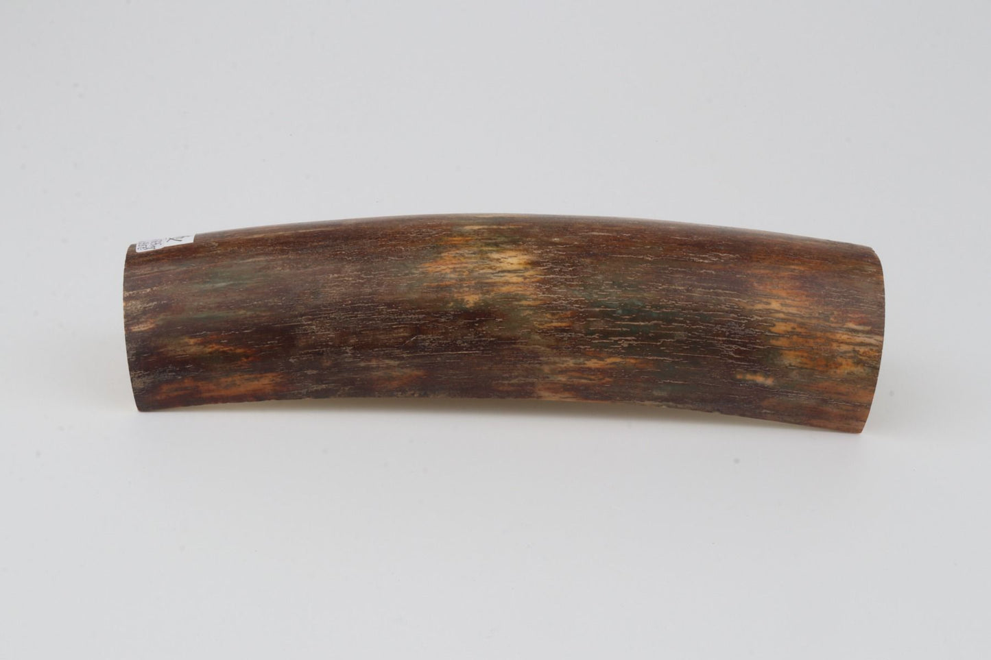 This is a top-quality piece of Siberian woolly mammoth bark (Mammuthus primigenius). The ivory is rock-solid without cracks. One cross-cut section is slightly thicker than the other. Consistent width with plenty of reserves on both ends. The colour of the bark is a mix of brown, orange and green.