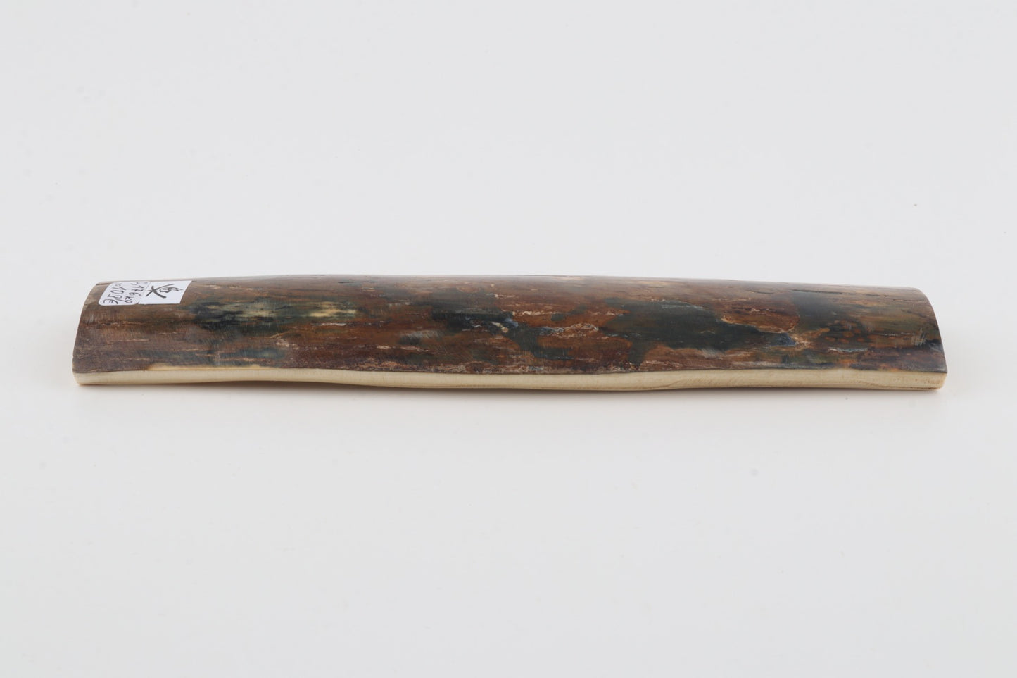 This is a top-quality piece of Siberian woolly mammoth bark (Mammuthus primigenius). The ivory is rock-solid without cracks. One cross-cut section is thinner and wider than the other. Reserves on both ends. Please carefully look at the pictures for precise dimensions. The colour of the bark is a mix of caramel, blue and yellow.