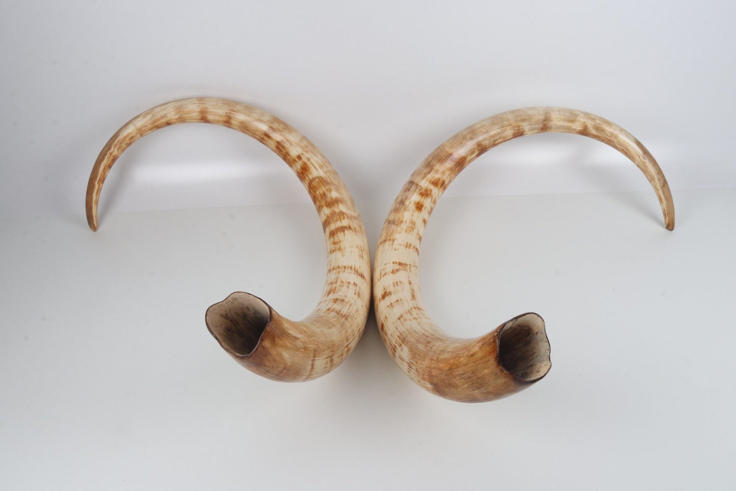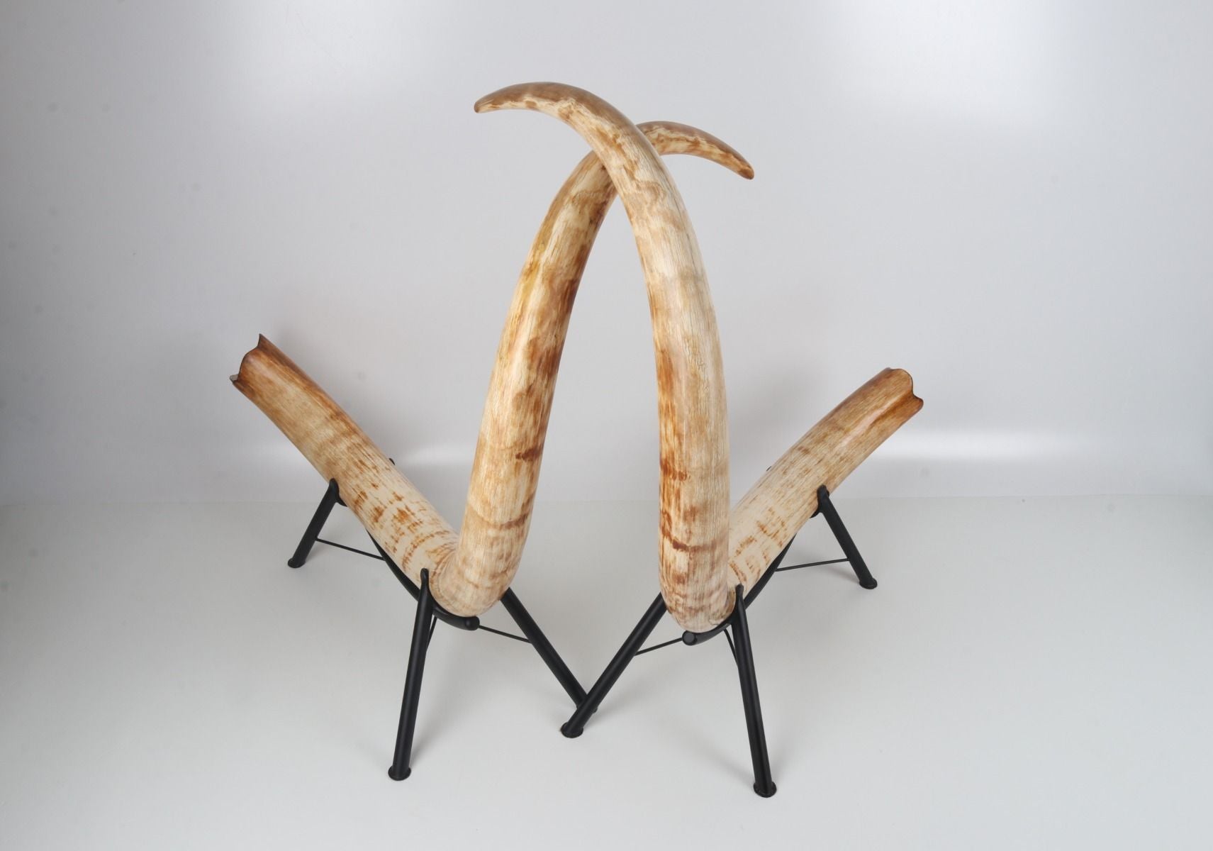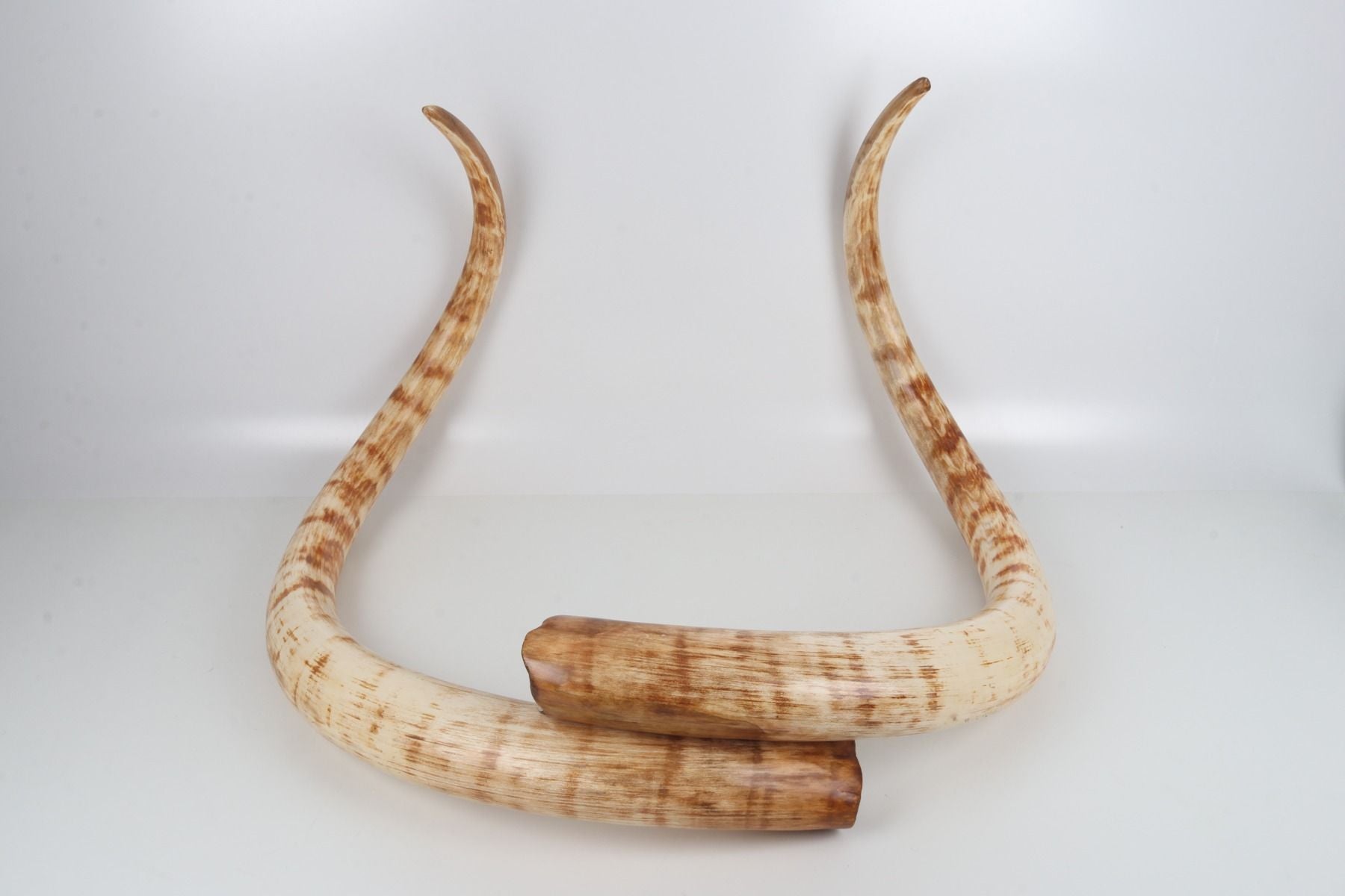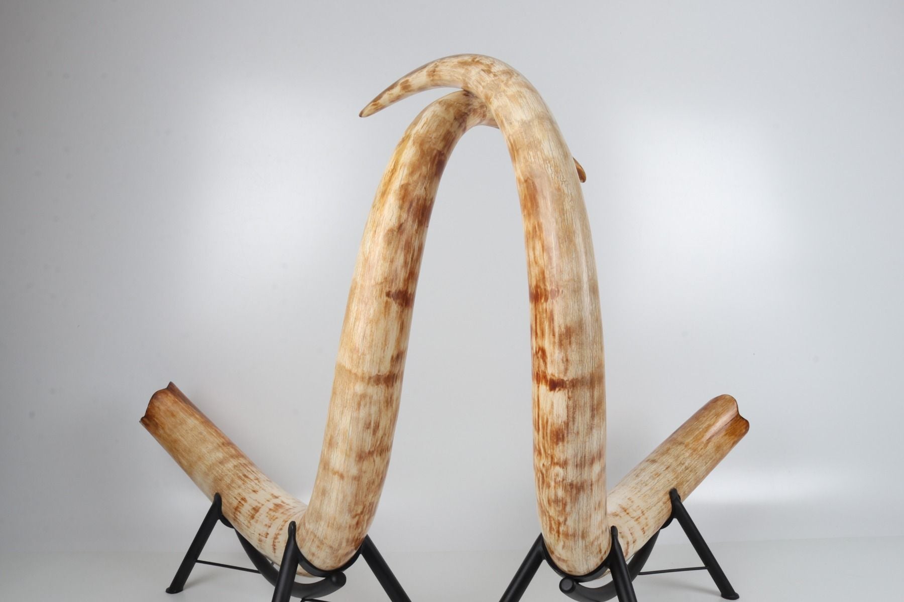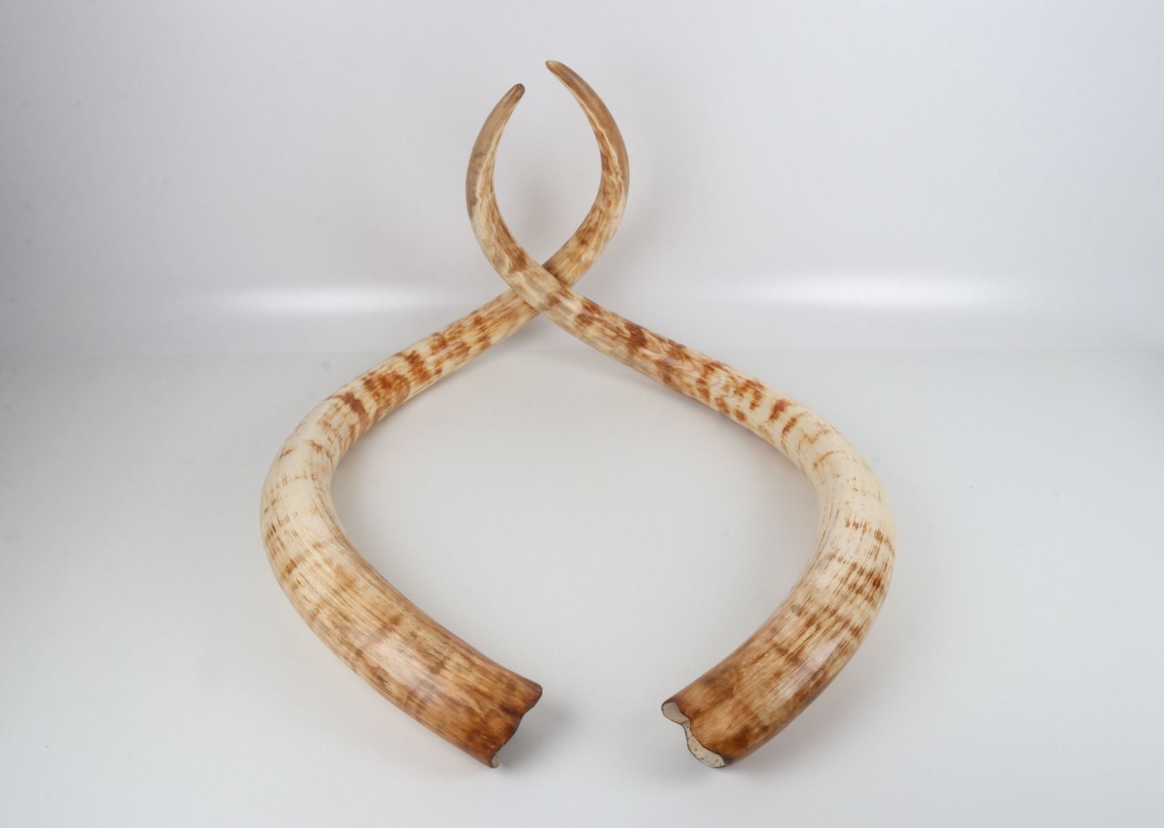 This is a natural woolly mammoth tusk pair (Mammuthus primigenius) in an immaculate condition. The ivory of these tusks is rock-solid, without cracks and completely dry. The colour of the outer layer of bark is a mix of white and orange.